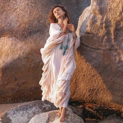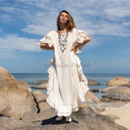 Boho Wedding Kaftan Dress: Ruffle Trimmed Raw Cotton V-Neck – Wild Heart