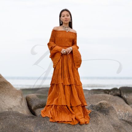 Boho Wedding Dress: Terra Cotta Cotton Maxi Gown with Bell Sleeves – Lucia