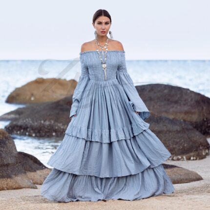 Boho Wedding Dress: Seacliff Mist Cotton Maxi Gown, Off-Shoulder Sleeves – Lucia
