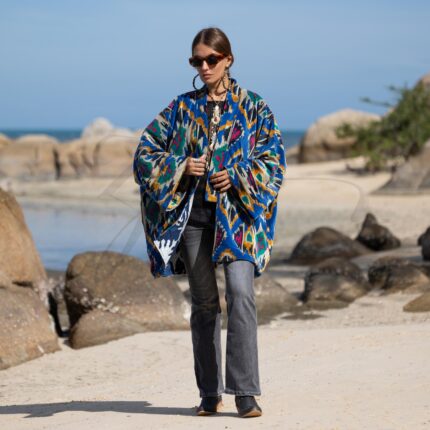 Velvet Kimono Jacket: Indigo Ikat Boho Duster – Plus Size – Mei