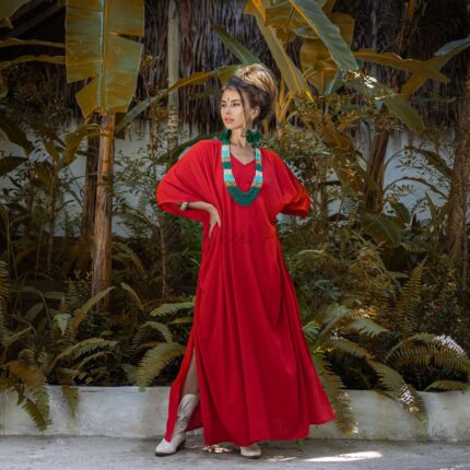 Red Ruffle Trimmed Modal Silk Kaftan: Boho Maxi Dress – Wild Heart
