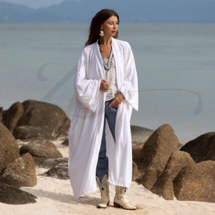 Moon Drift Velvet Kimono Duster: Silky White Boho Robe – Plus Size – Mai