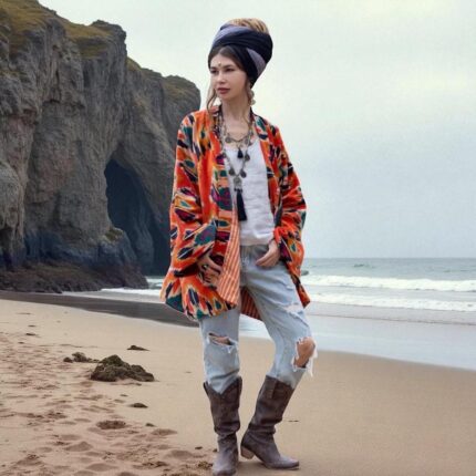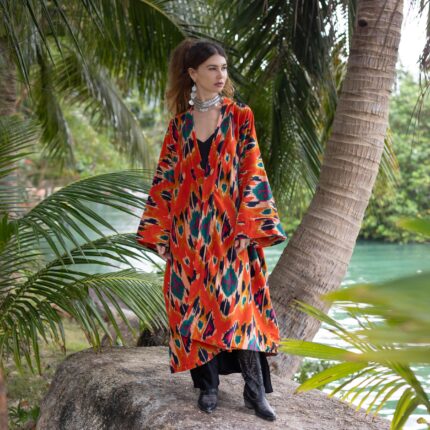 Flaming Coral Velvet Kimono Robe: Boho Ikat Cotton Jacket – Mei