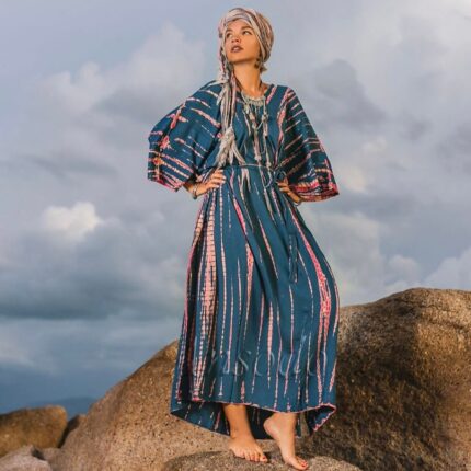 Handmade Tie-Dye Cotton Kaftan Maxi Dress: Ocean Mirage Boho Beach Cover-Up – Nora
