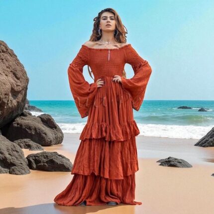 Off-Shoulder Boho Wedding Dress – Ruffled Tiered Cotton Maxi | Lucia Burnt Orange