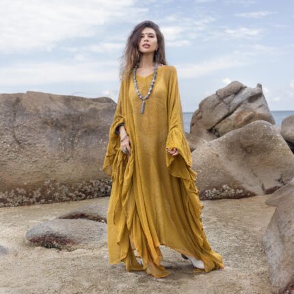 Marigold Sunset Mesh Kaftan Dress – Boho Beach Cover-Up | Sheer Cardigan | Flowy, Versatile, Bold, Flirtatious Style | Ondine by ZinniaPearl