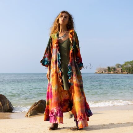 Hand-Dyed Tie-Dye Maxi Kimono: Ruffle Duster, Plus Size Boho Cover-Up – Callie
