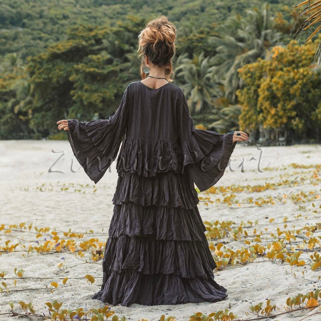Elevate your wardrobe with this Raven Black Cascading Ruffled Kimono Duster, crafted from premium raw cotton and designed for effortless boho chic. This luxurious piece combines comfort and style, making it the perfect statement for any occasion—from beach days to festivals and resort wear.