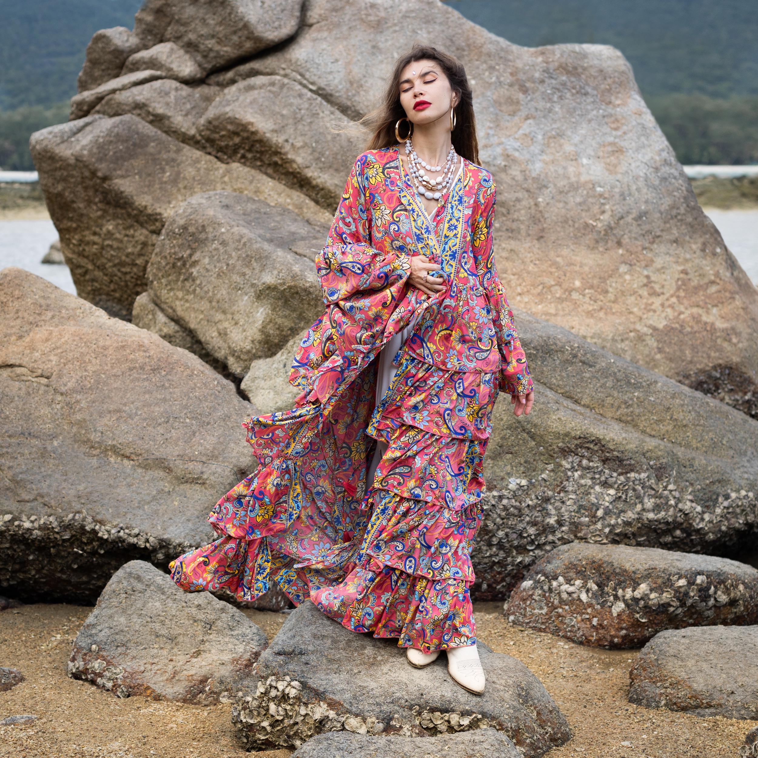Slip into this luxurious kimono and feel like a free-spirited goddess. The intricate paisley print and flowing ruffle details make it a versatile statement piece that pairs effortlessly with swimsuits, dresses, or your favorite boho outfit.