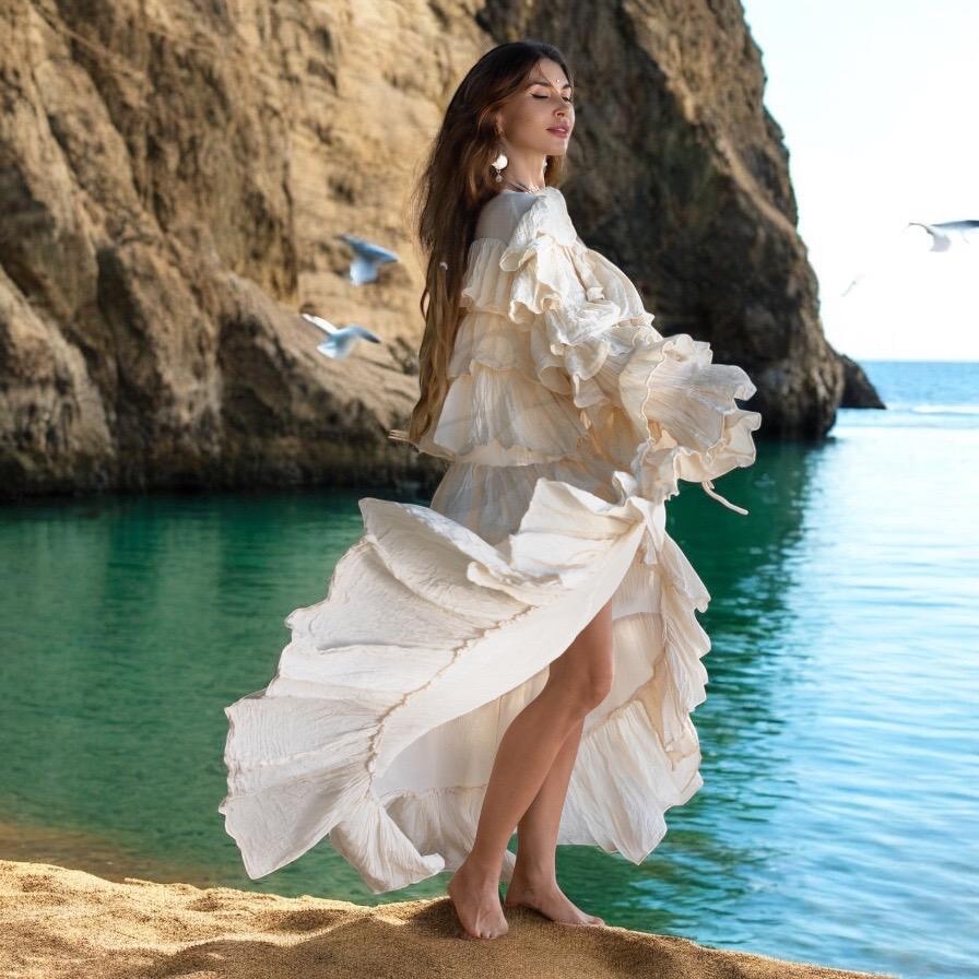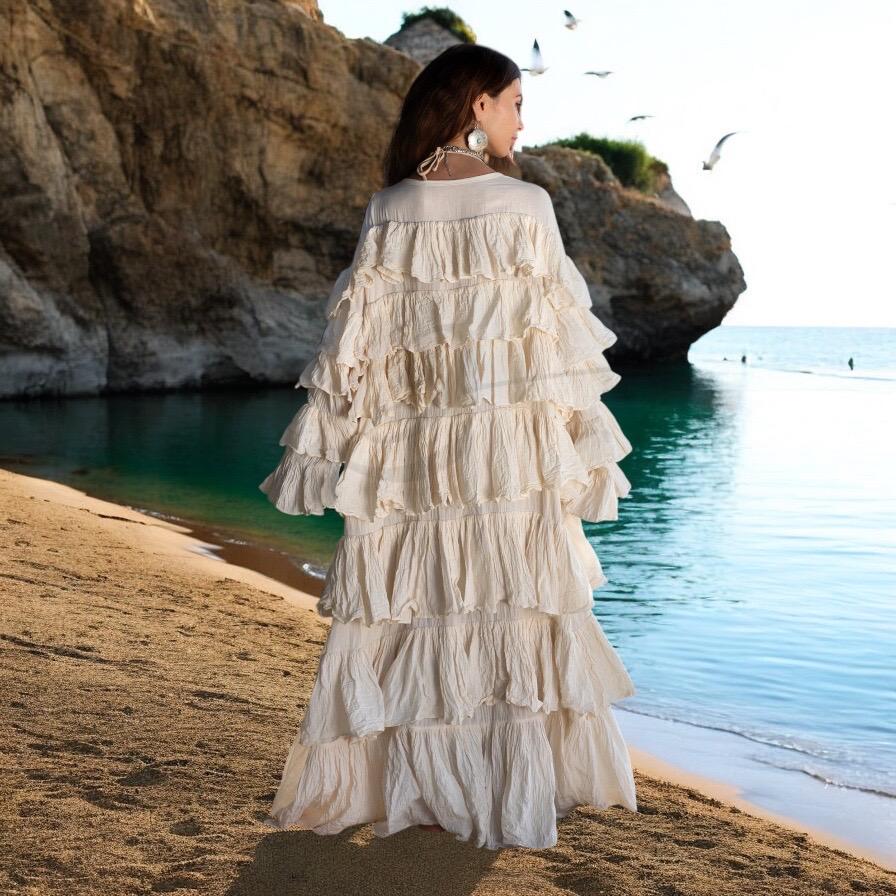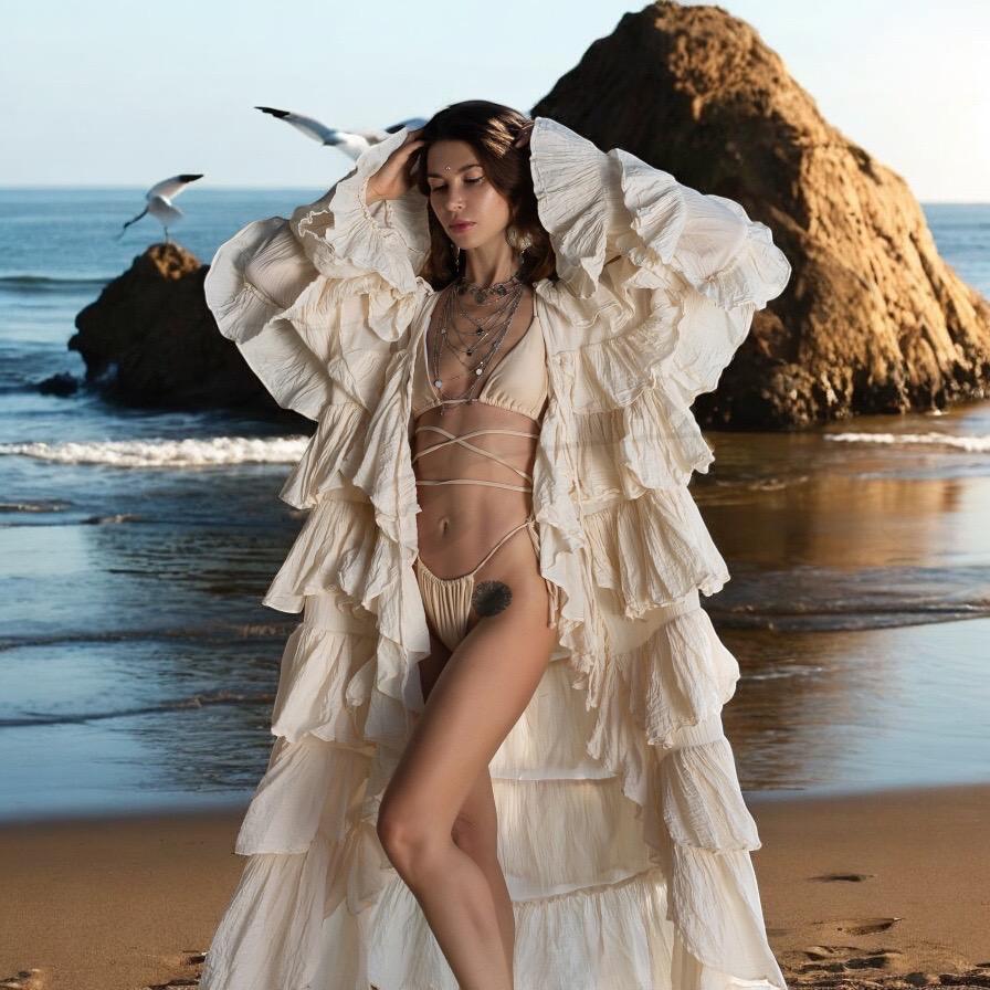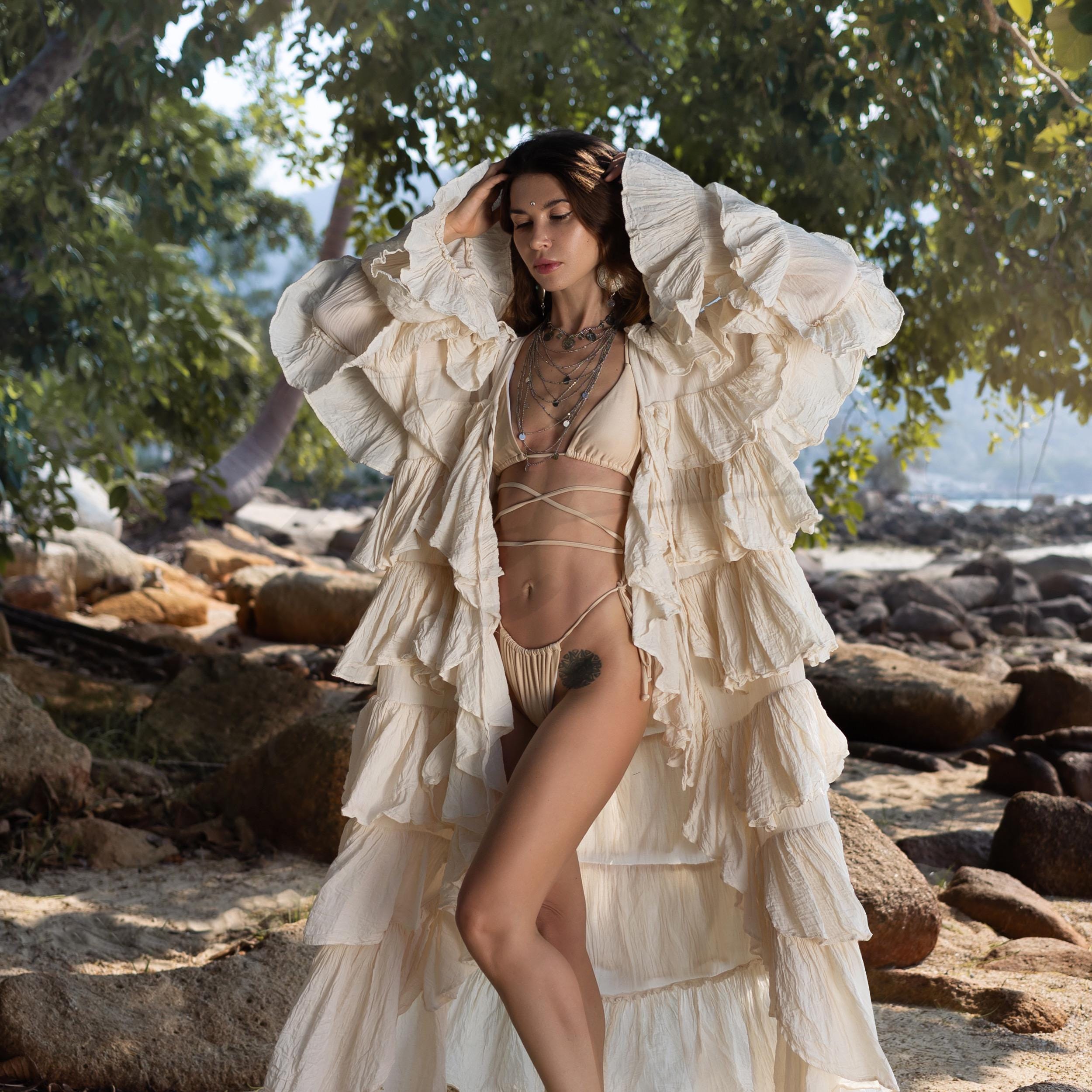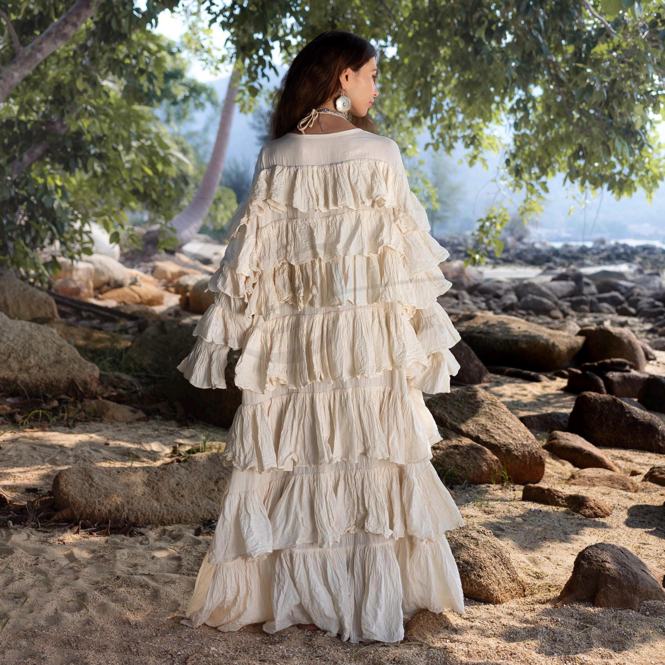 Let your wild elegance unfold in the Solara Cream Robe – a romantic ruffle kimono handcrafted from breathable raw cotton for barefoot brides, festival goddesses, and soulful wanderers.