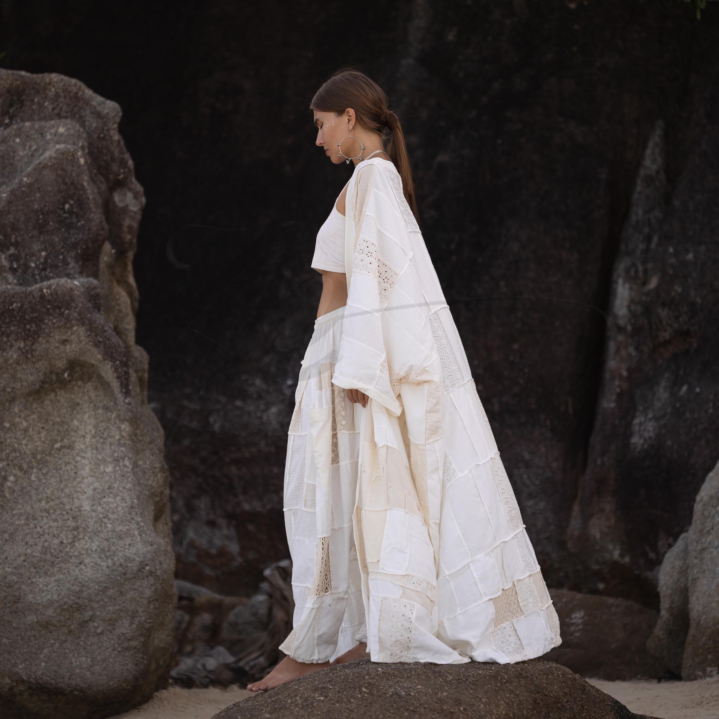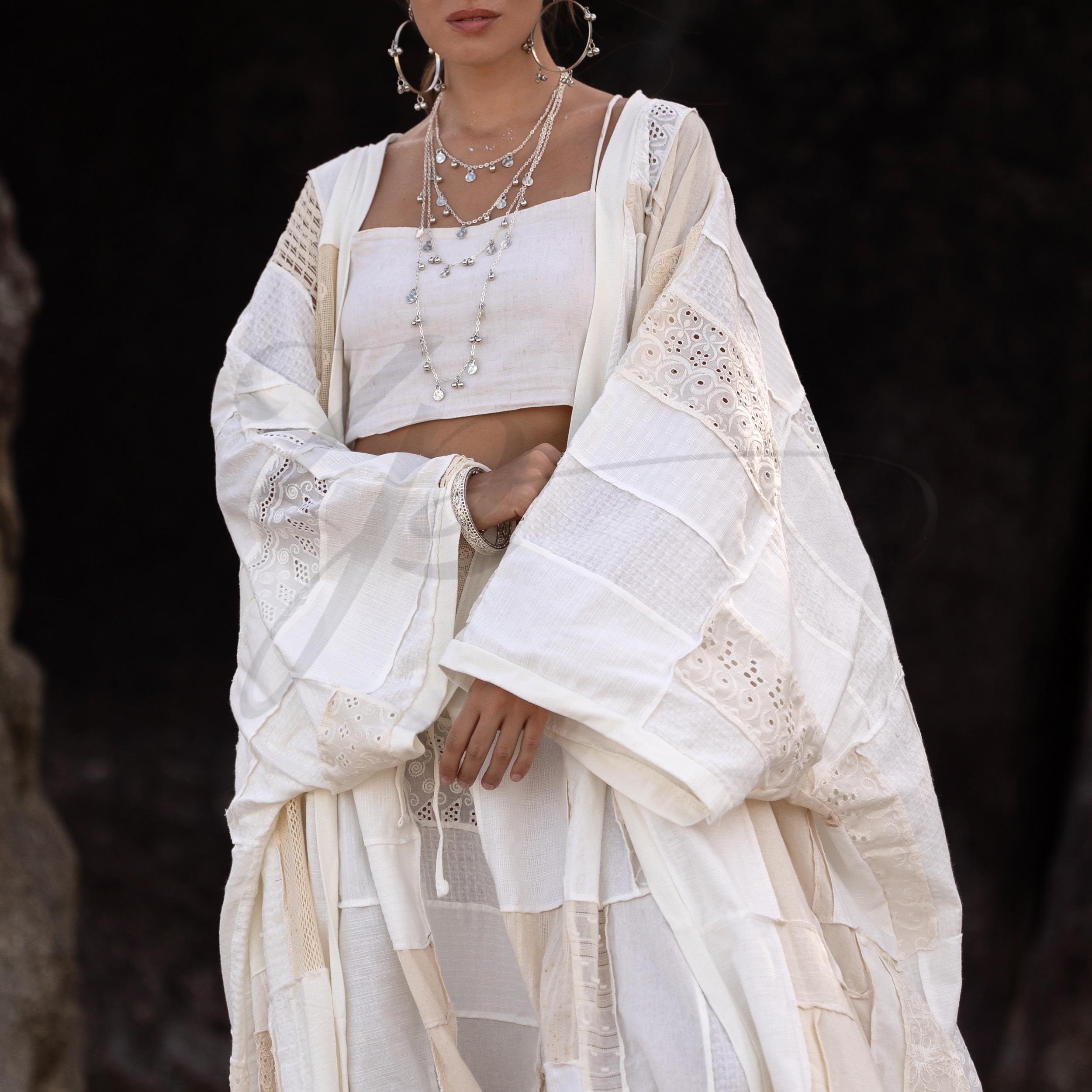 Introducing the Spiritu Bliss Duster—a flowing cotton lace robe that radiates feminine ease and soulful elegance. Handcrafted from breathable cream-toned cotton with vintage-style lace patchwork, this long layering piece moves like poetry. Whether draped over a slip dress, paired with the matching pants, or styled solo for moonlit musings, it’s a timeless treasure for boho dreamers and goddess gatherings.