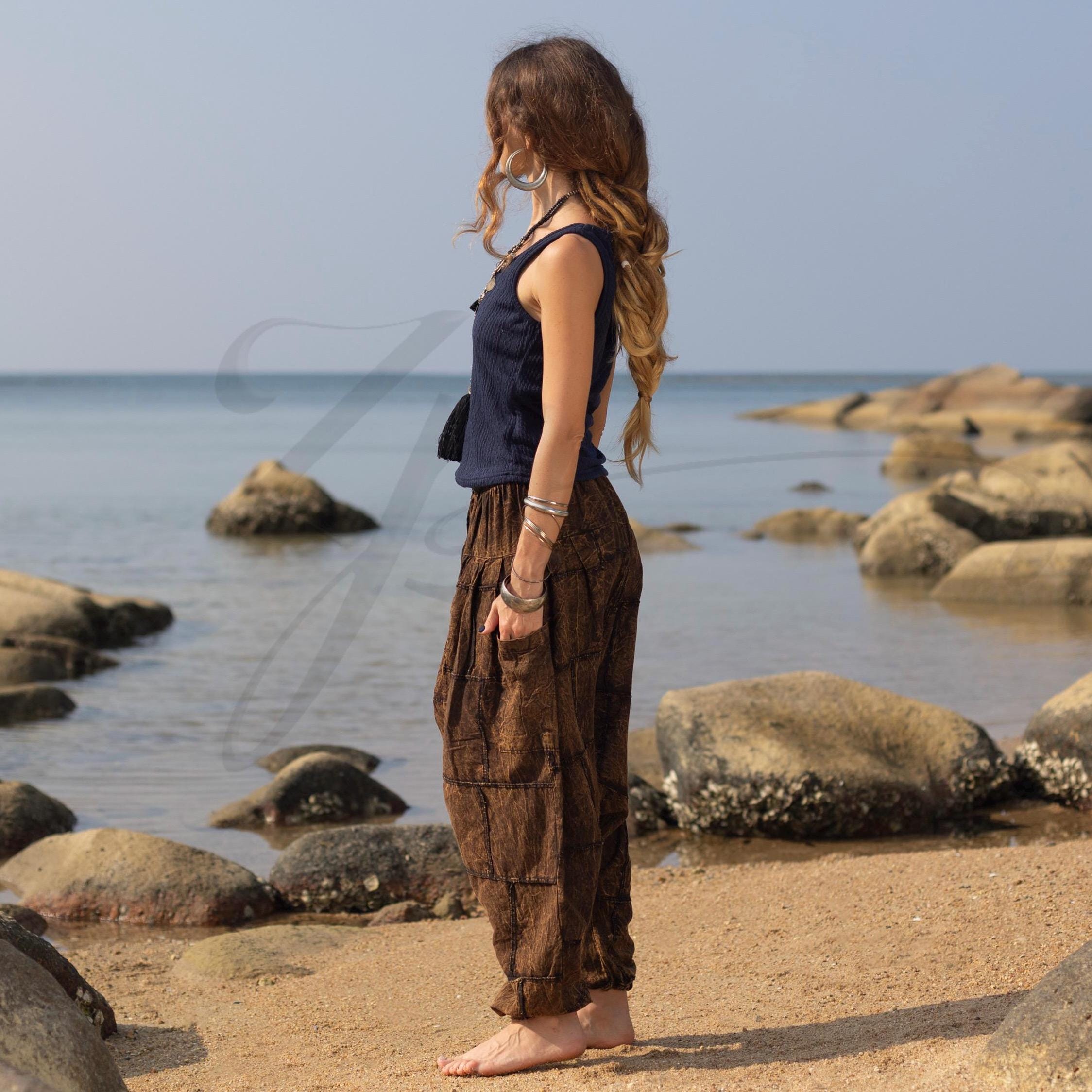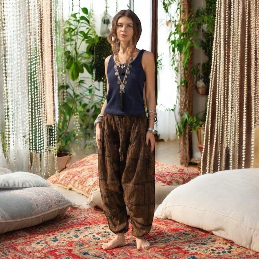 Rooted in earth and stitched with soul, the Spiritu Pants bring grounded elegance to your everyday boho wardrobe. Handcrafted from 100% breathable canvas cotton, these plus-size friendly harem trousers feature tonal patchwork in rich Rust Brown monochrome—a warm, minimalist palette that honors simplicity and spirit.