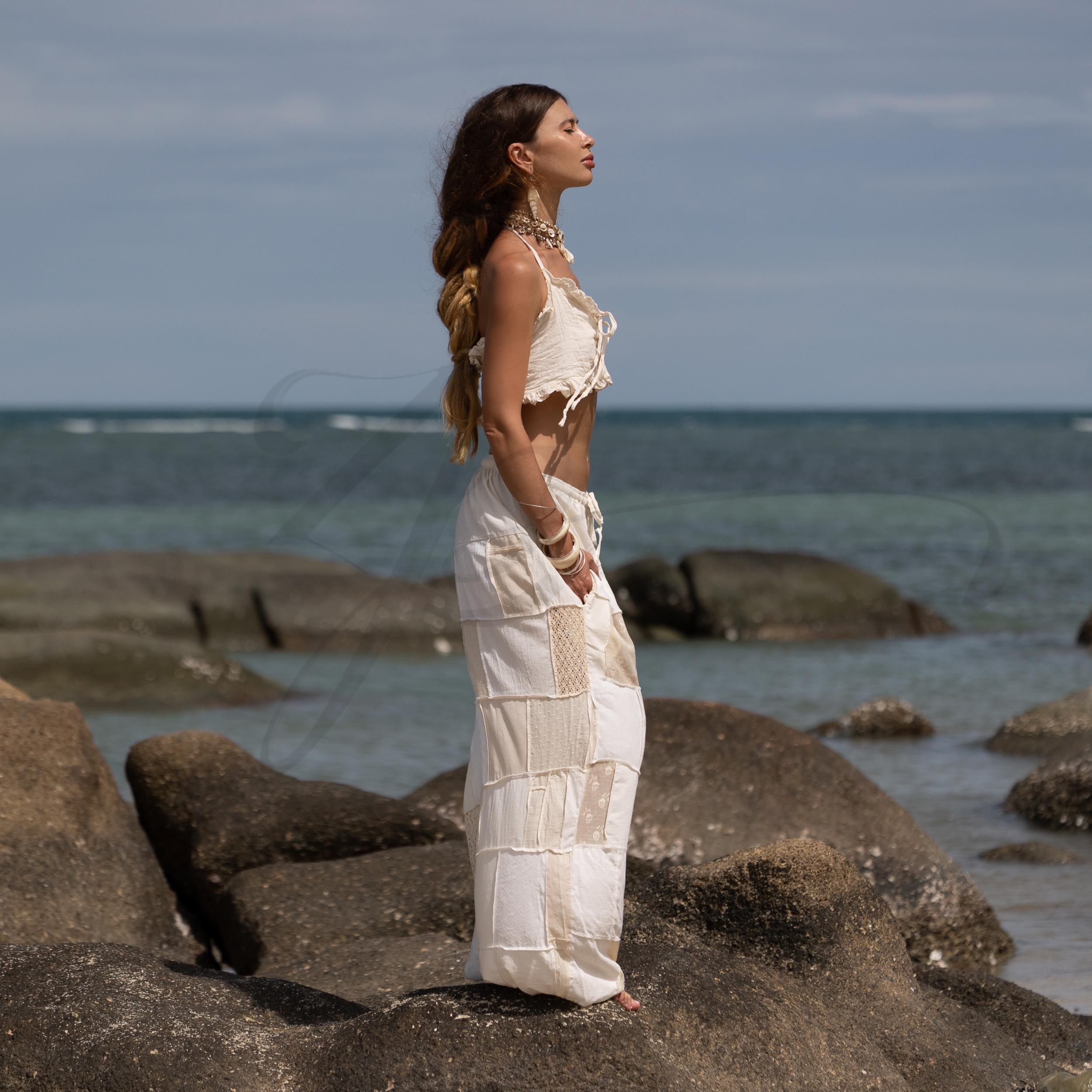 ✦ Embrace Effortless Grace in Chesa – Handmade Lace Patchwork Cotton Pants in Ivory Clay ✦