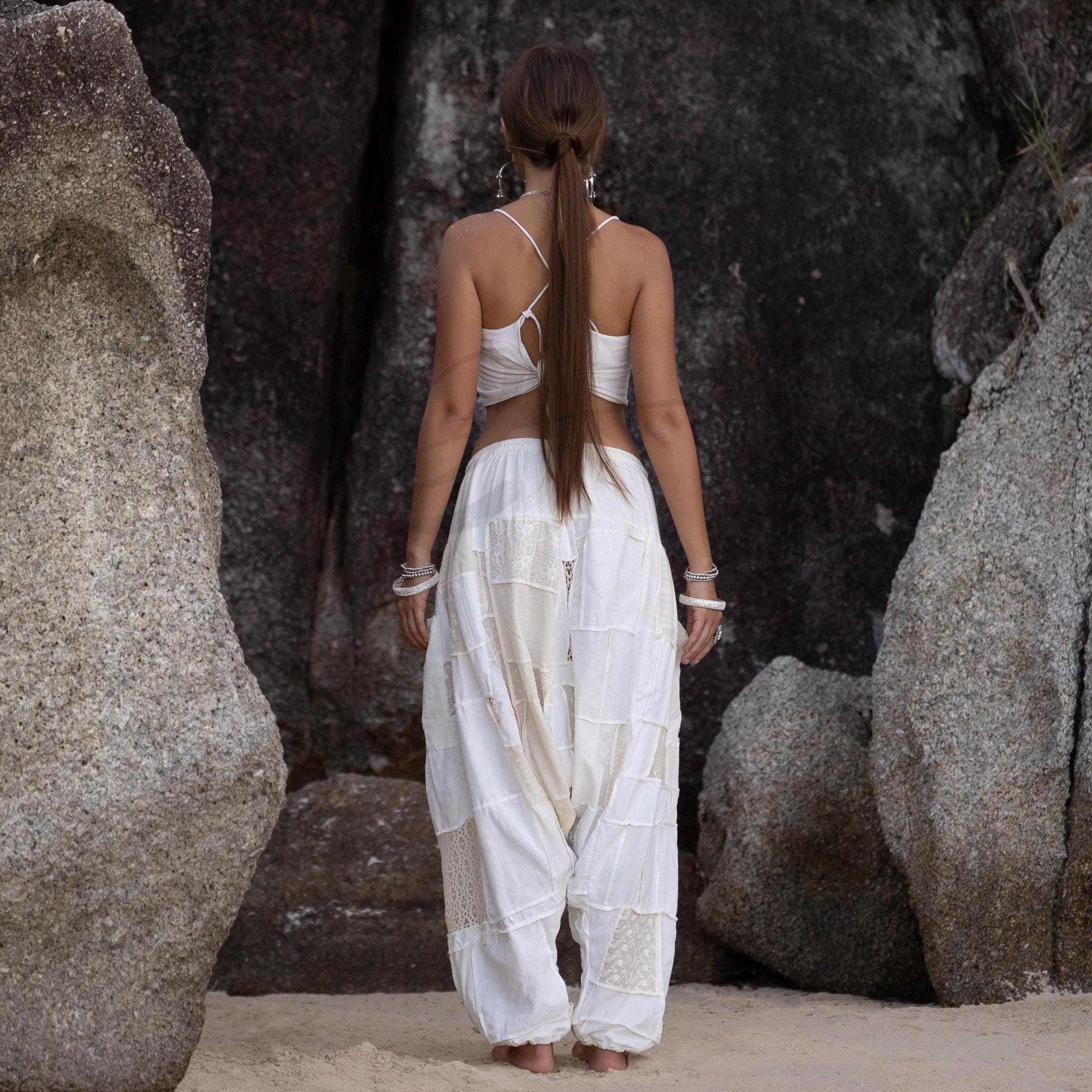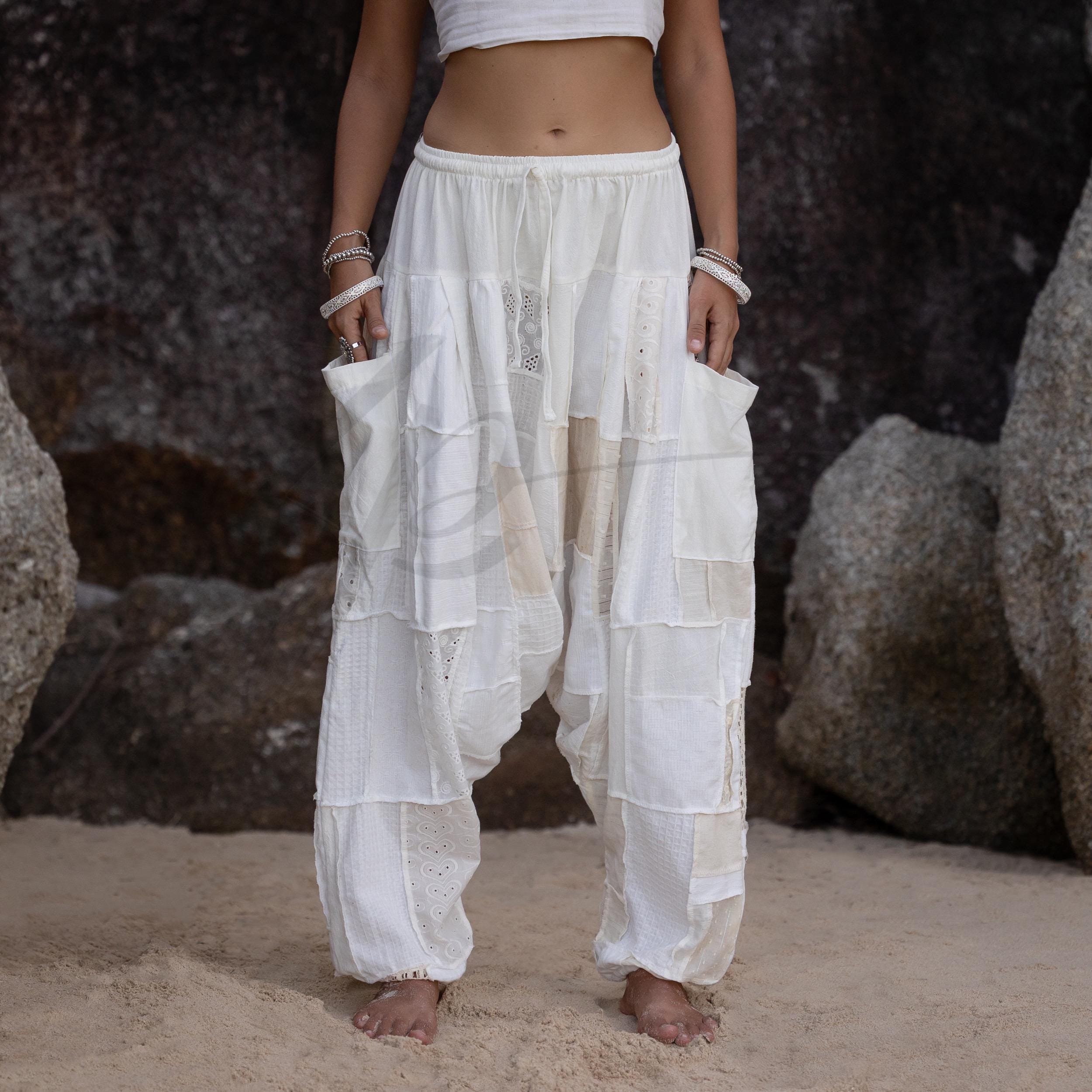 Boho Lace Patchwork Harem Pants & Duster Set: Cream Cotton Festival Outfit