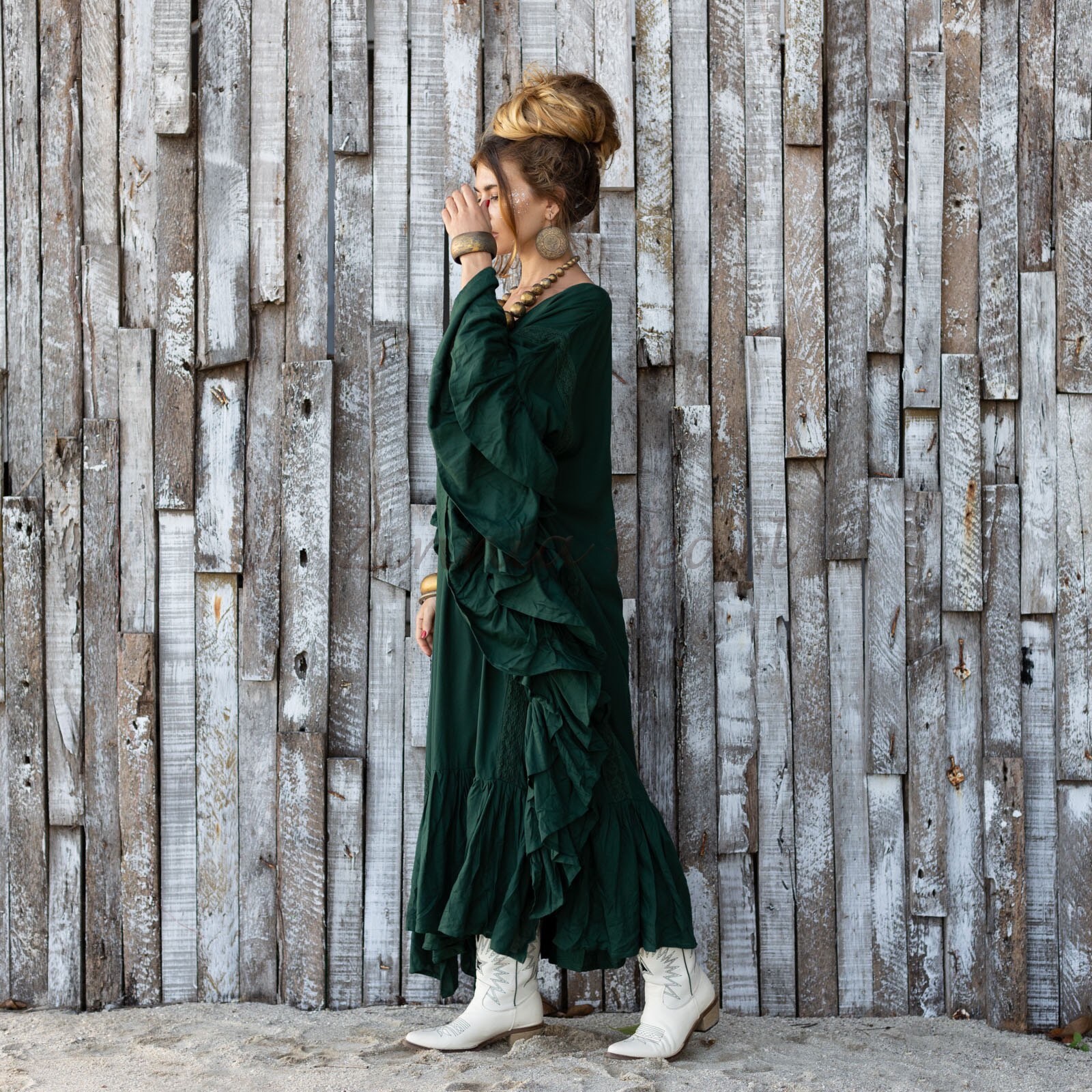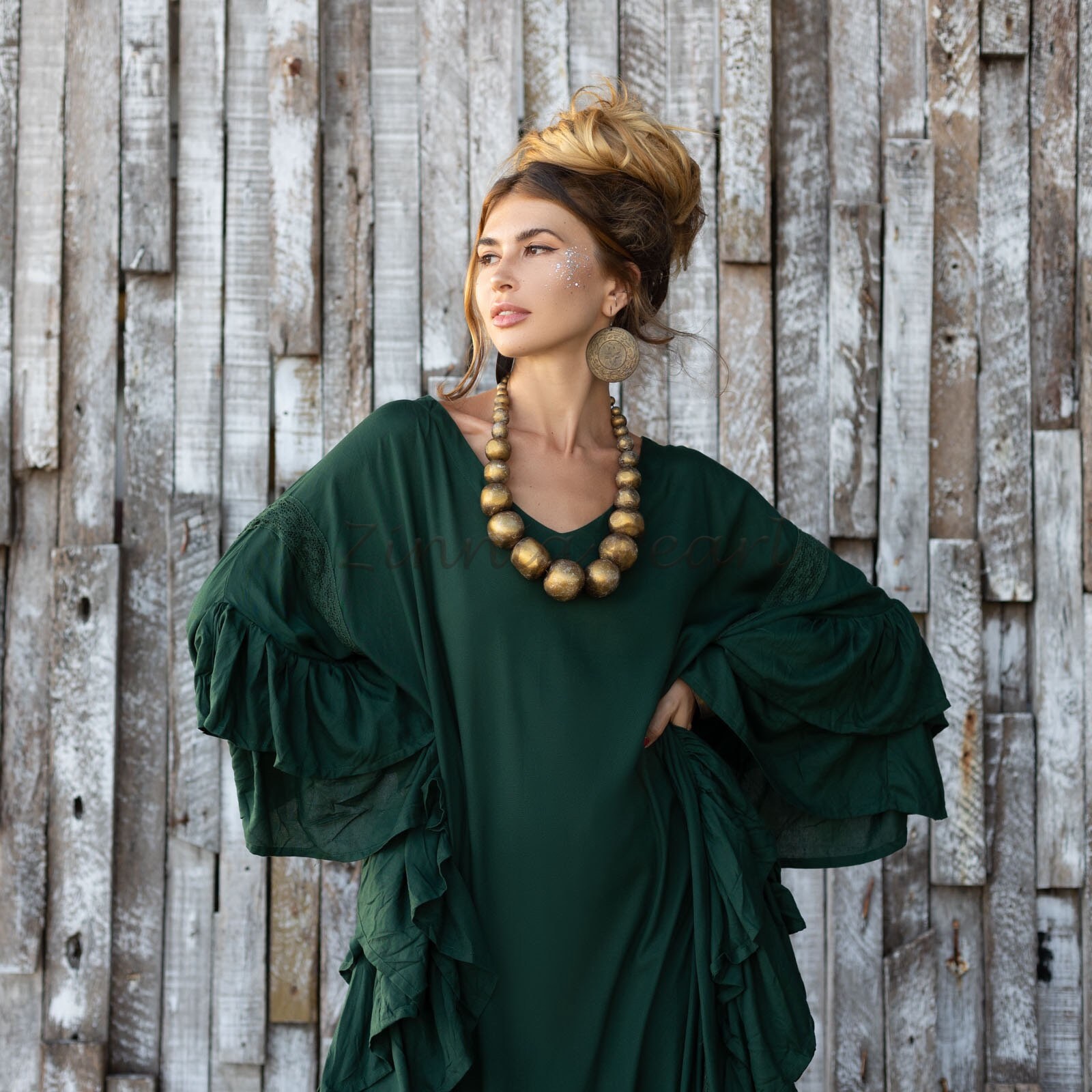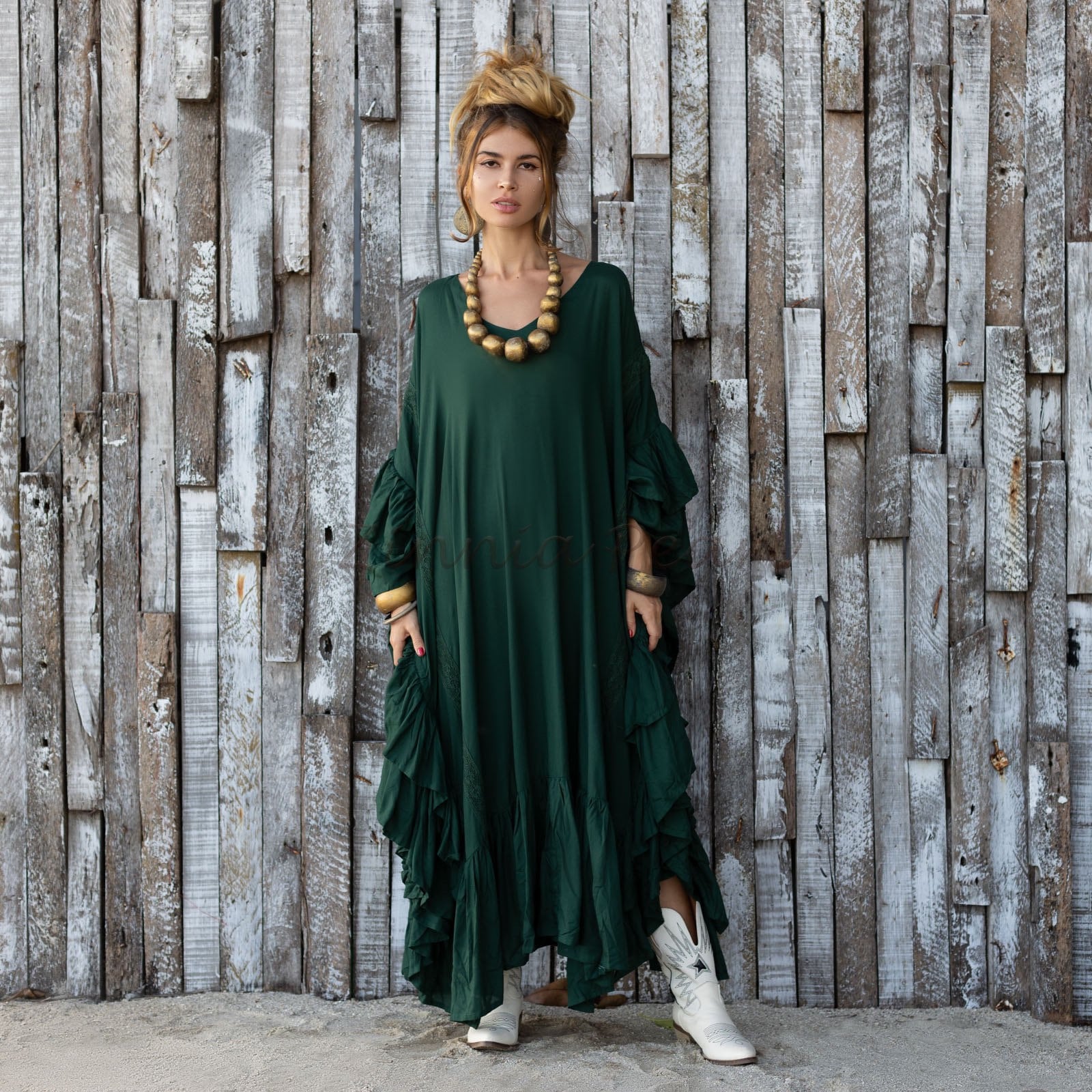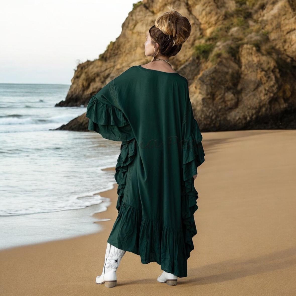 Step into your free-spirited era with the Wild Heart Kaftan in Woodland Muse—a deep forest green that echoes ancient woods and untamed dreams. This stunning plus size boho ruffle dress was made for soulful wanderers, moon dancers, and women who move through life with rhythm and grace.
