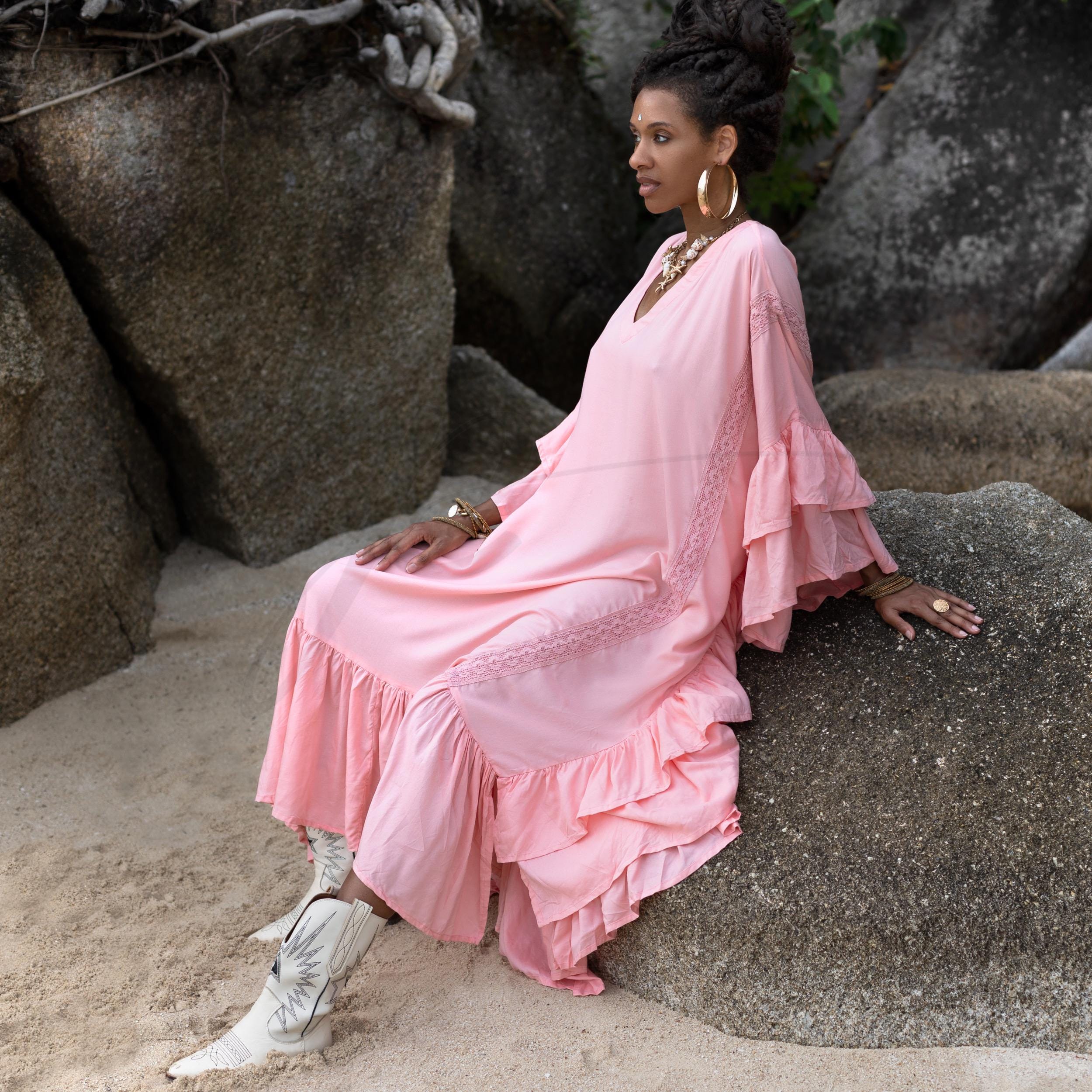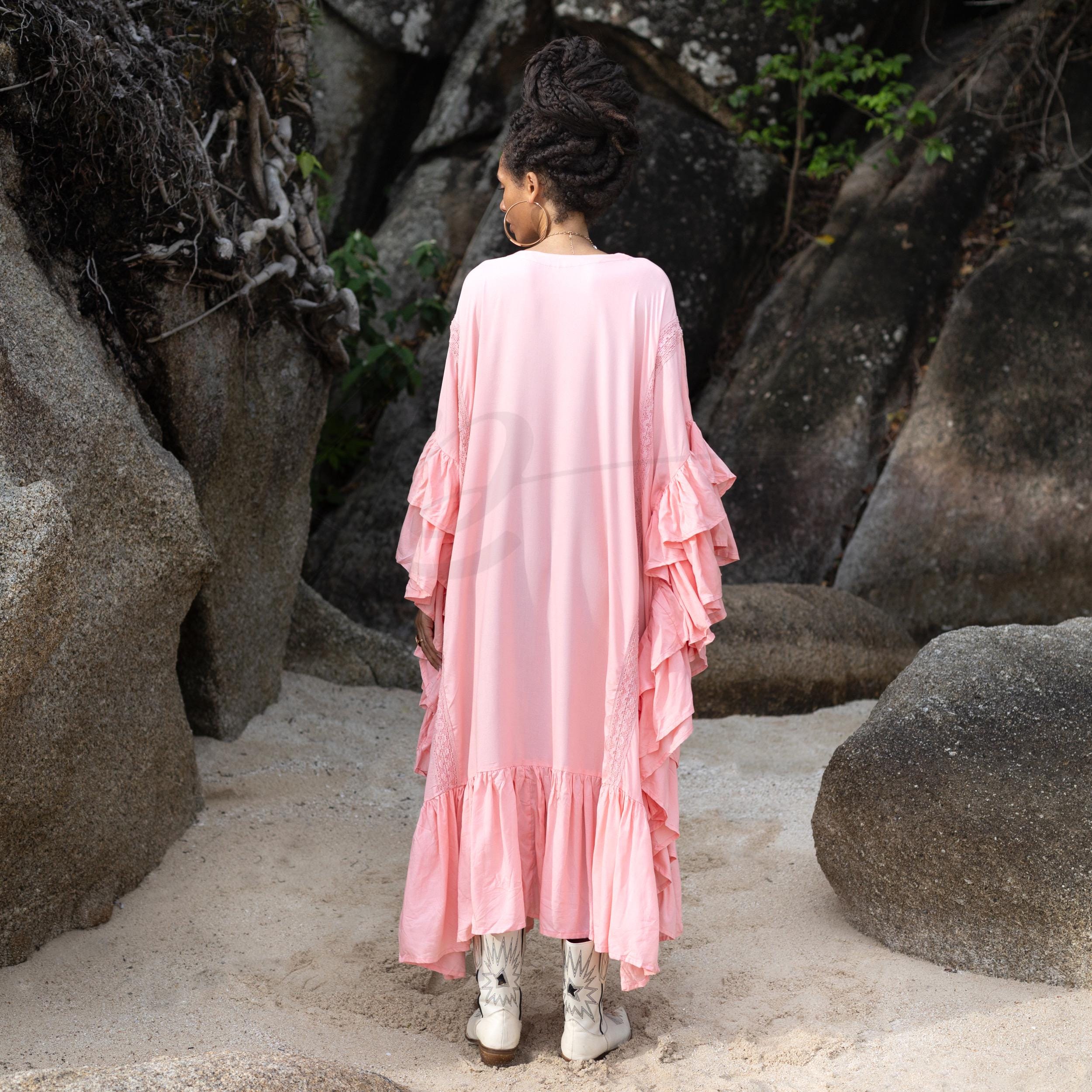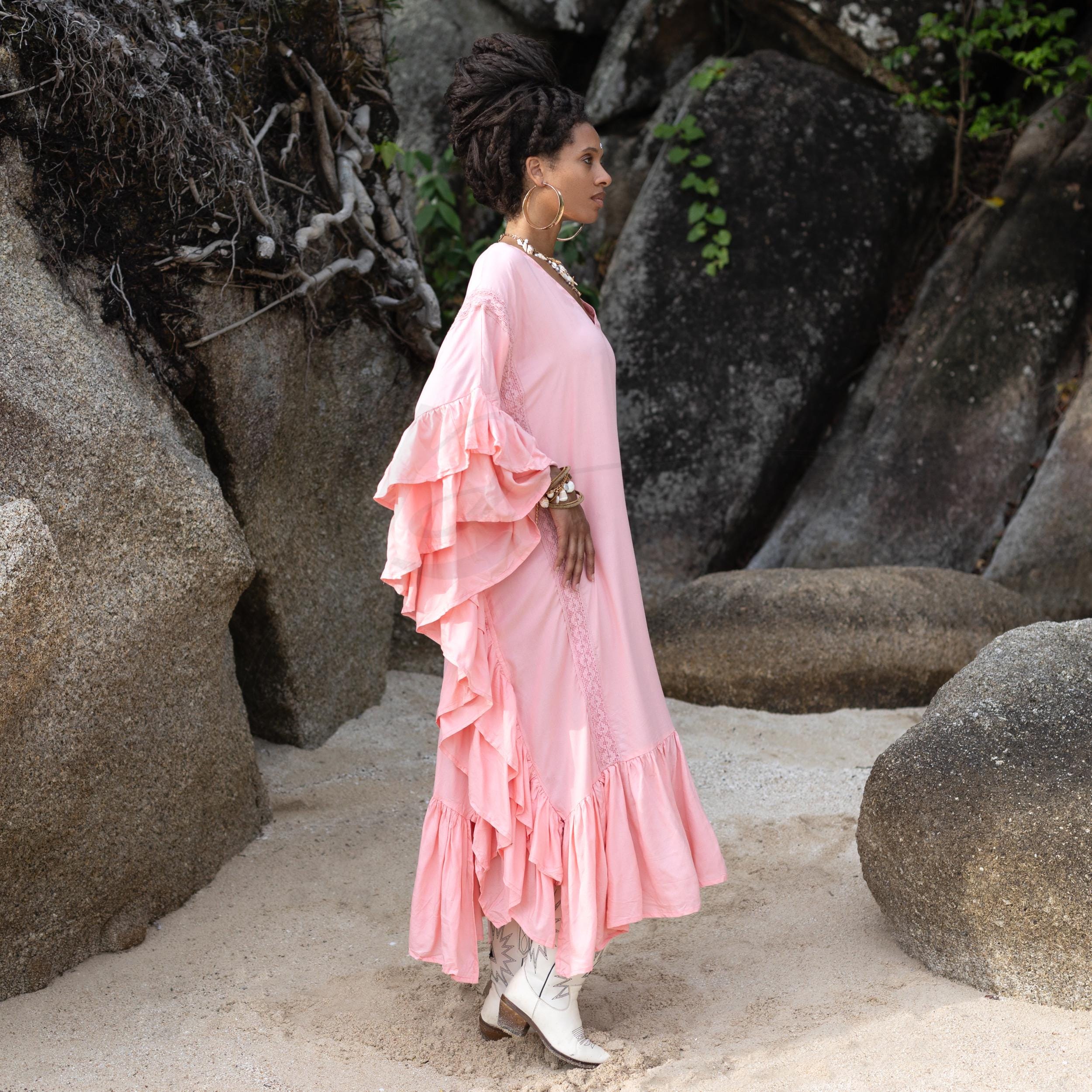 Boho Ruffle Maxi Kaftan: Pink Viscose Beach Cover-Up – Wild Heart