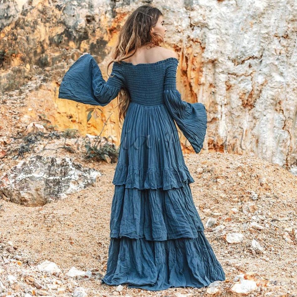 Boho Wedding Dress: Moonshadow Blue Cotton Off-Shoulder Maxi Gown – Lucia