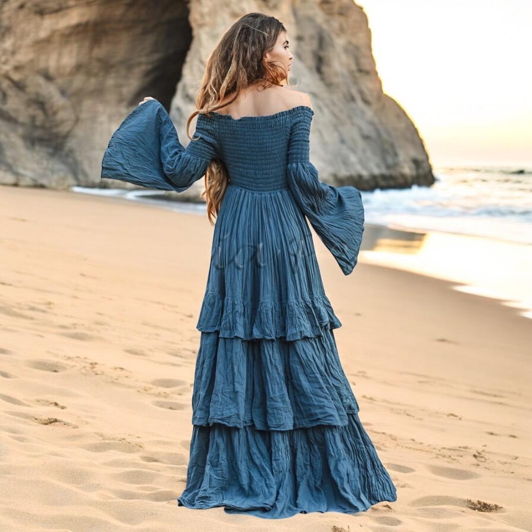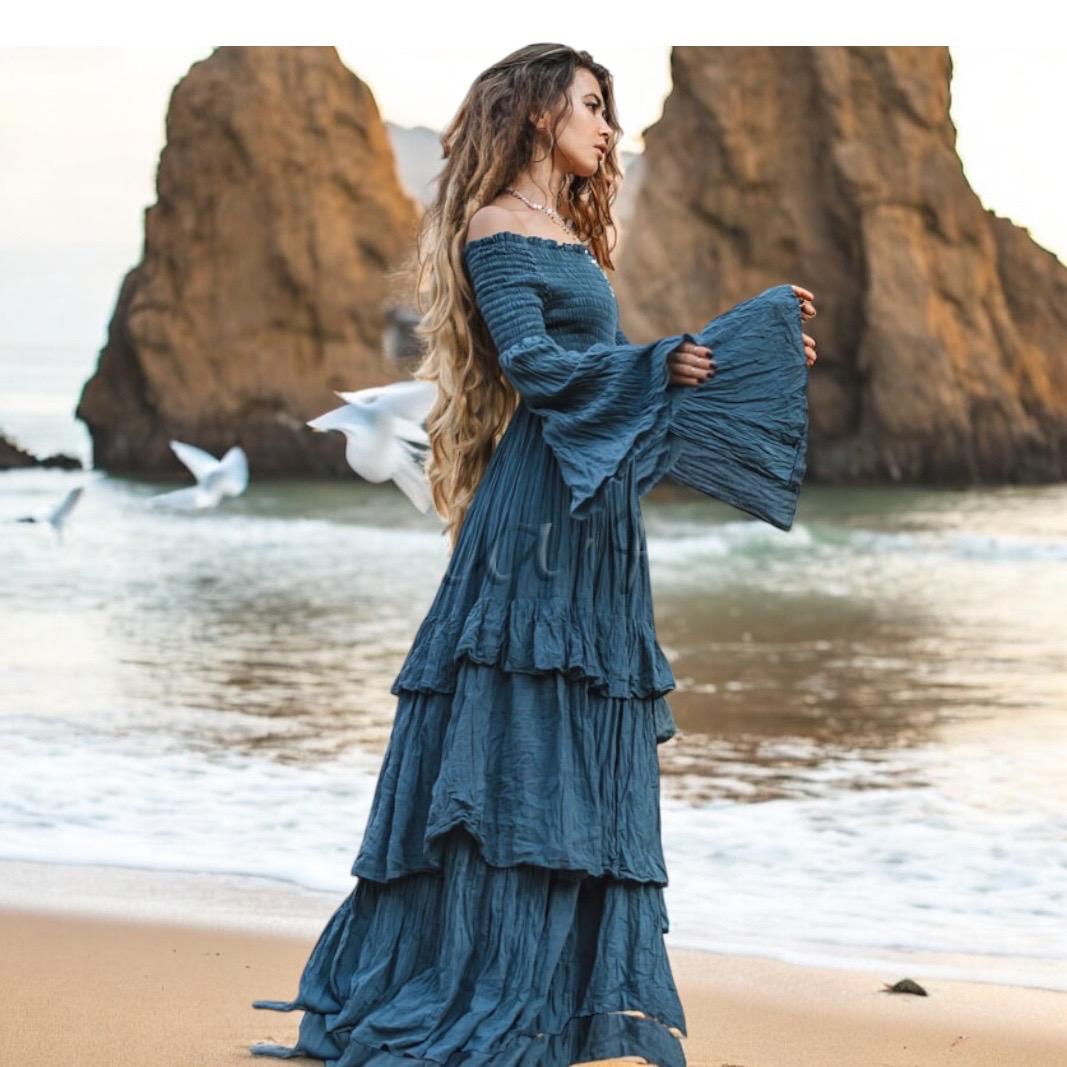 With its tiered, ruffle-layered skirt and flared long sleeves, Lucia flows like poetry in motion. The smocked bodice offers structure and stretch, while the off-shoulder neckline adds modern allure to its vintage-inspired silhouette. Whether you’re barefoot on the sand or wrapped in crystal jewelry, Lucia turns every moment into a memory.