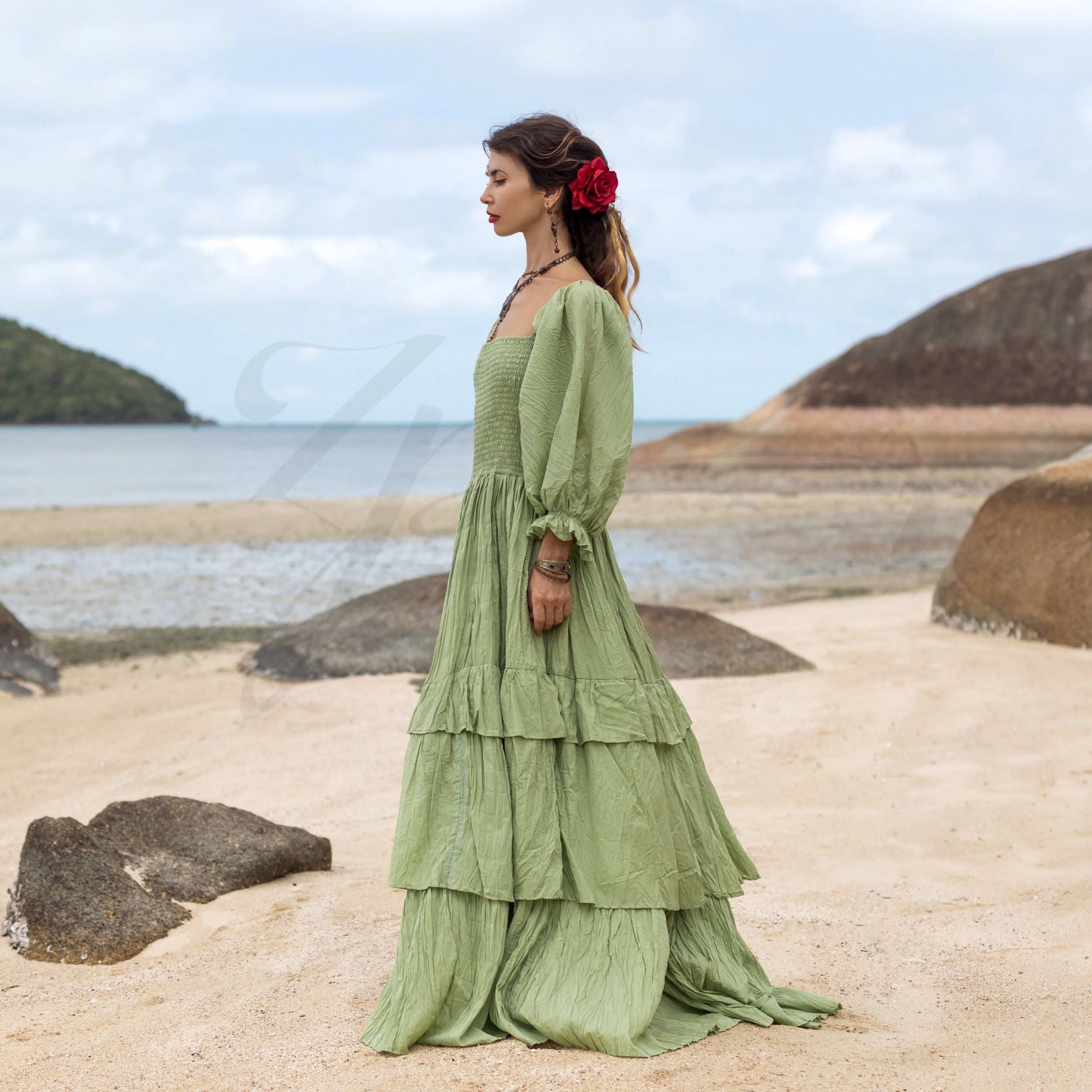Designed with flowing tiers and billowy sleeves, this dress effortlessly captures the essence of free-spirited elegance.
