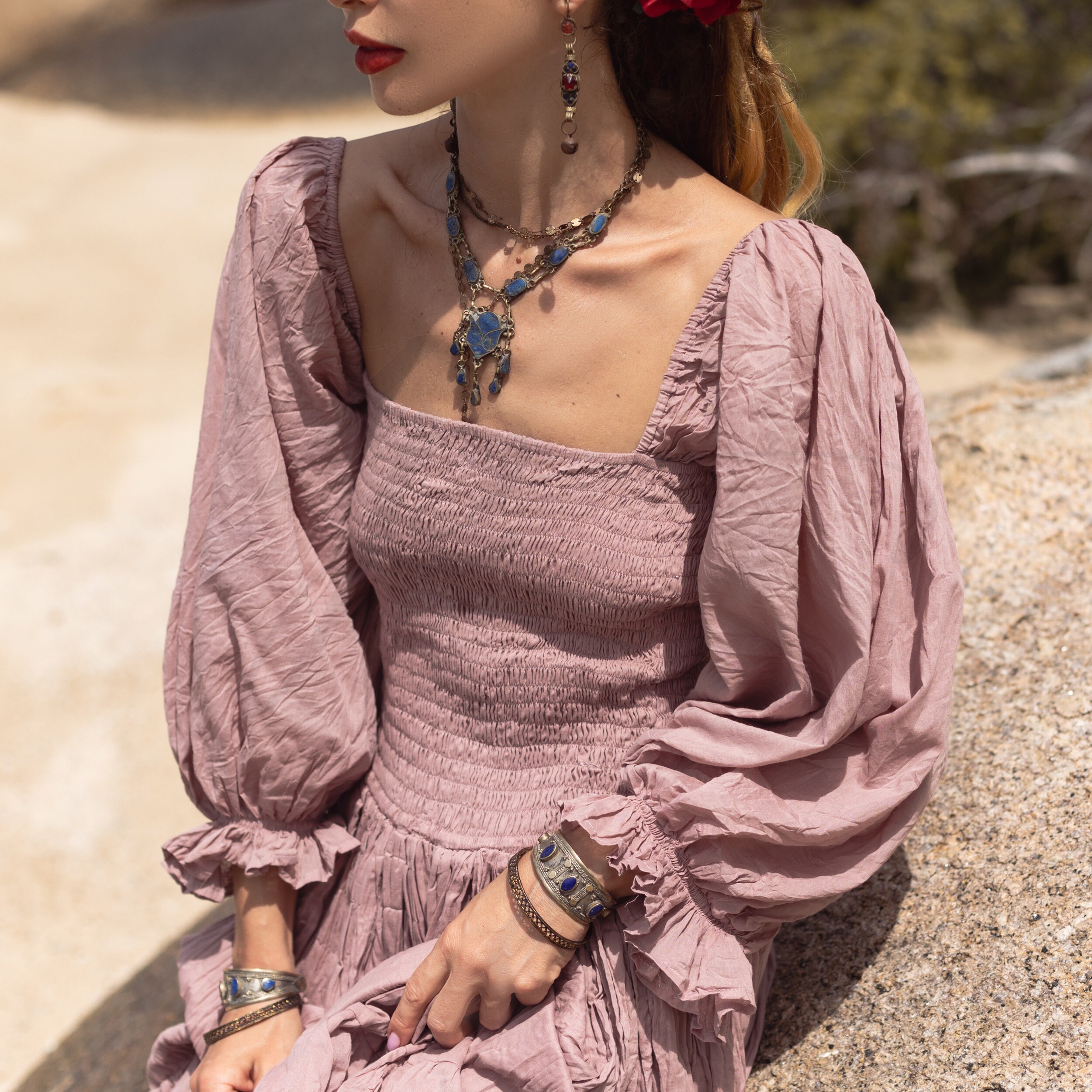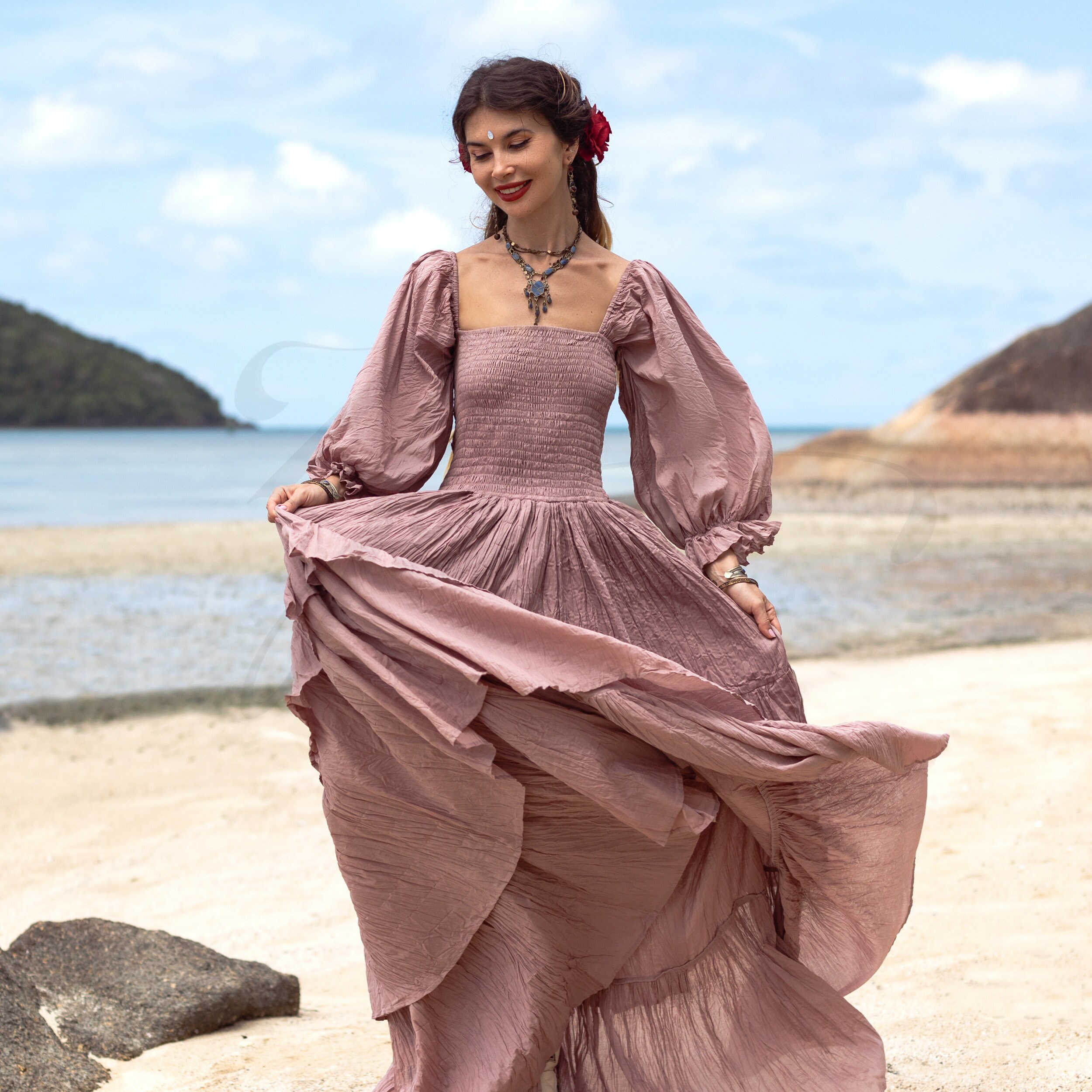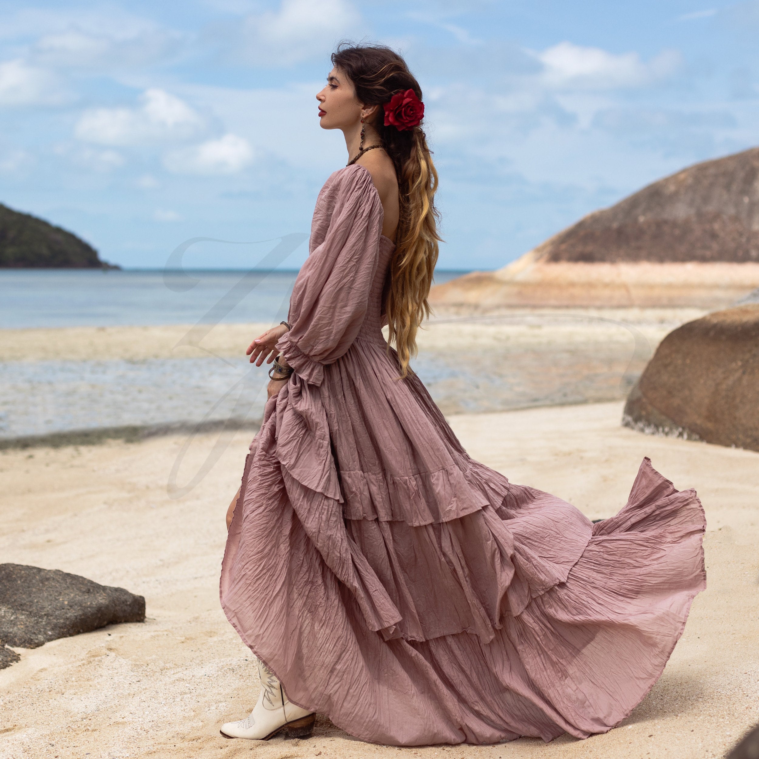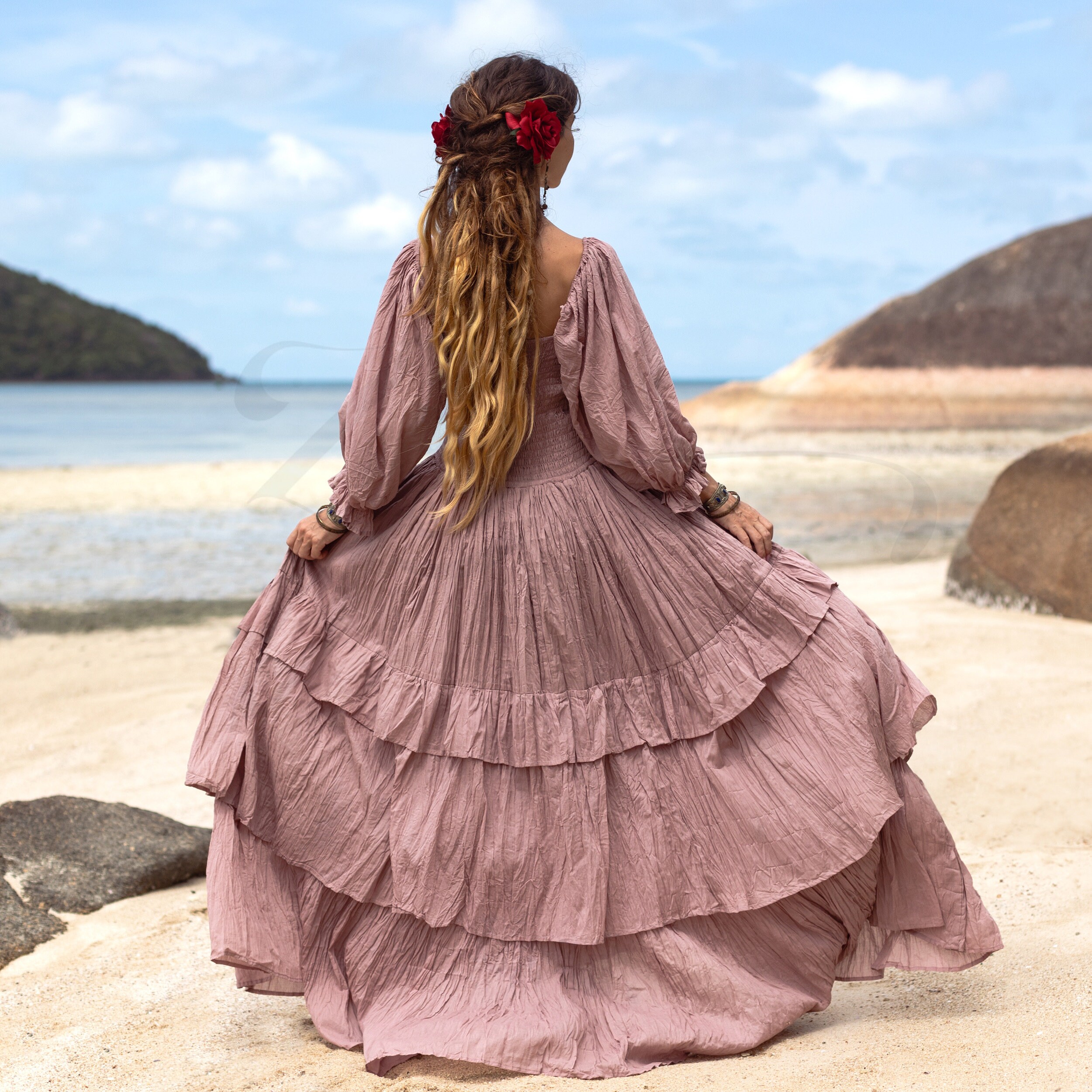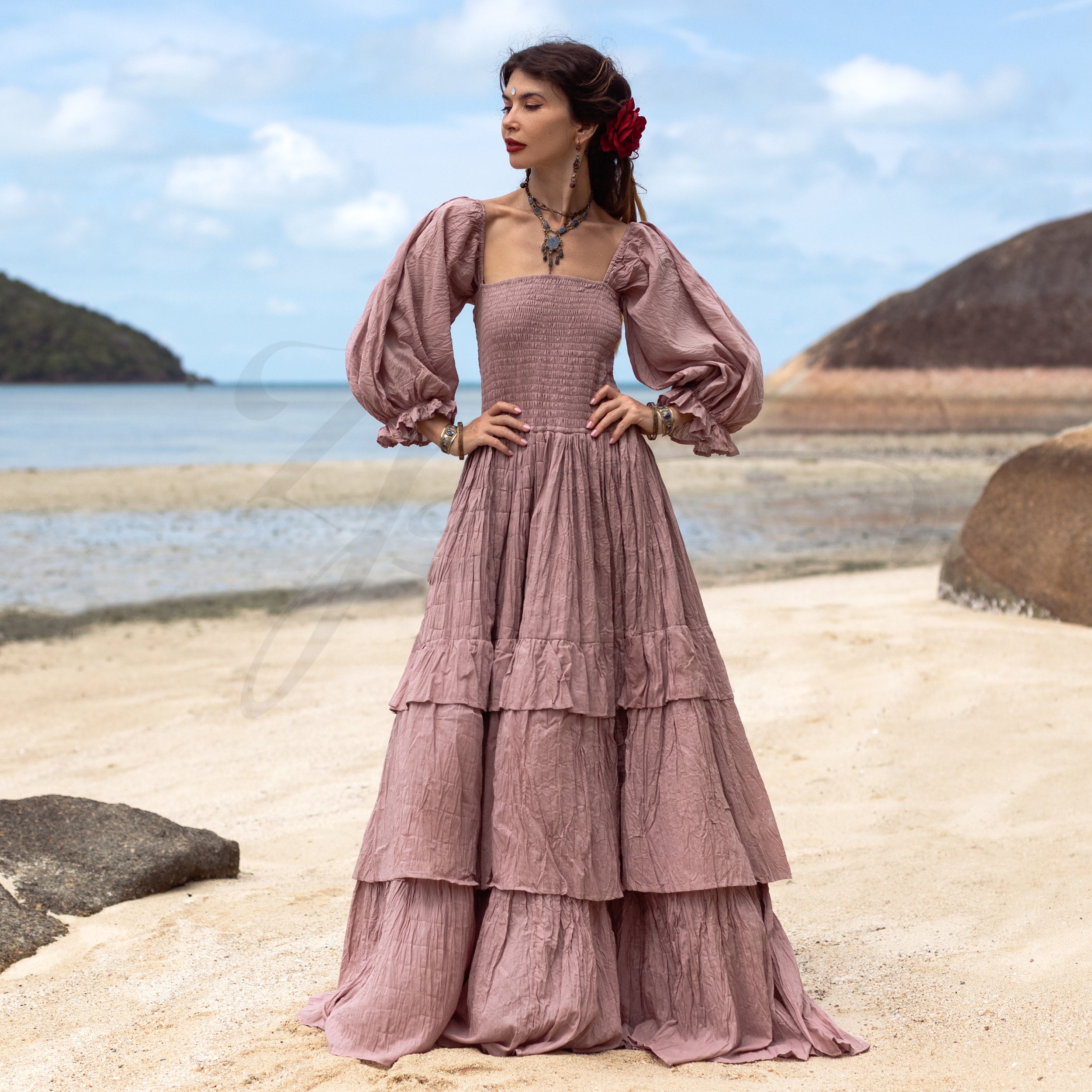 Designed with flowing tiers and billowy sleeves, this dress effortlessly captures the essence of free-spirited elegance.