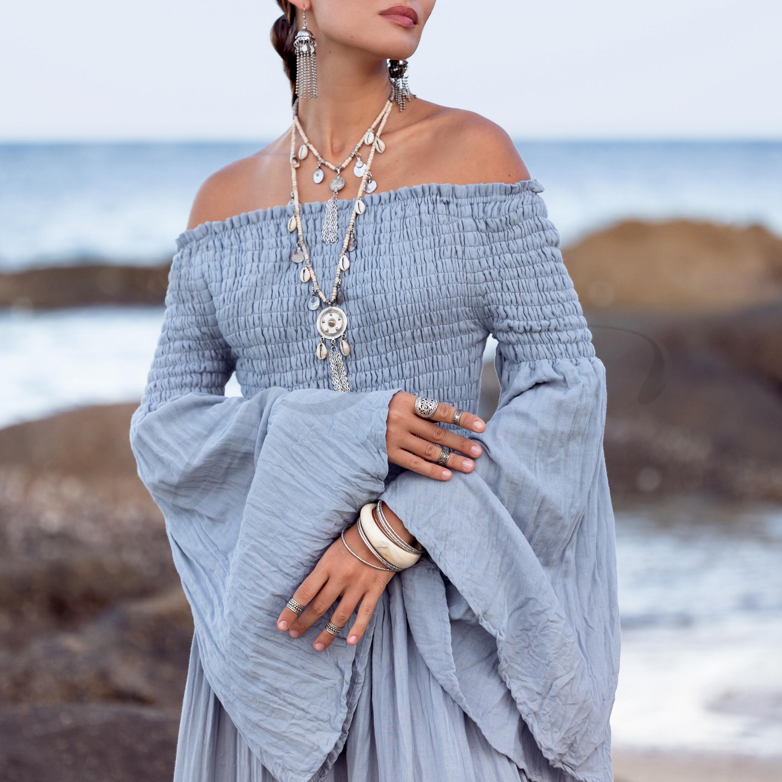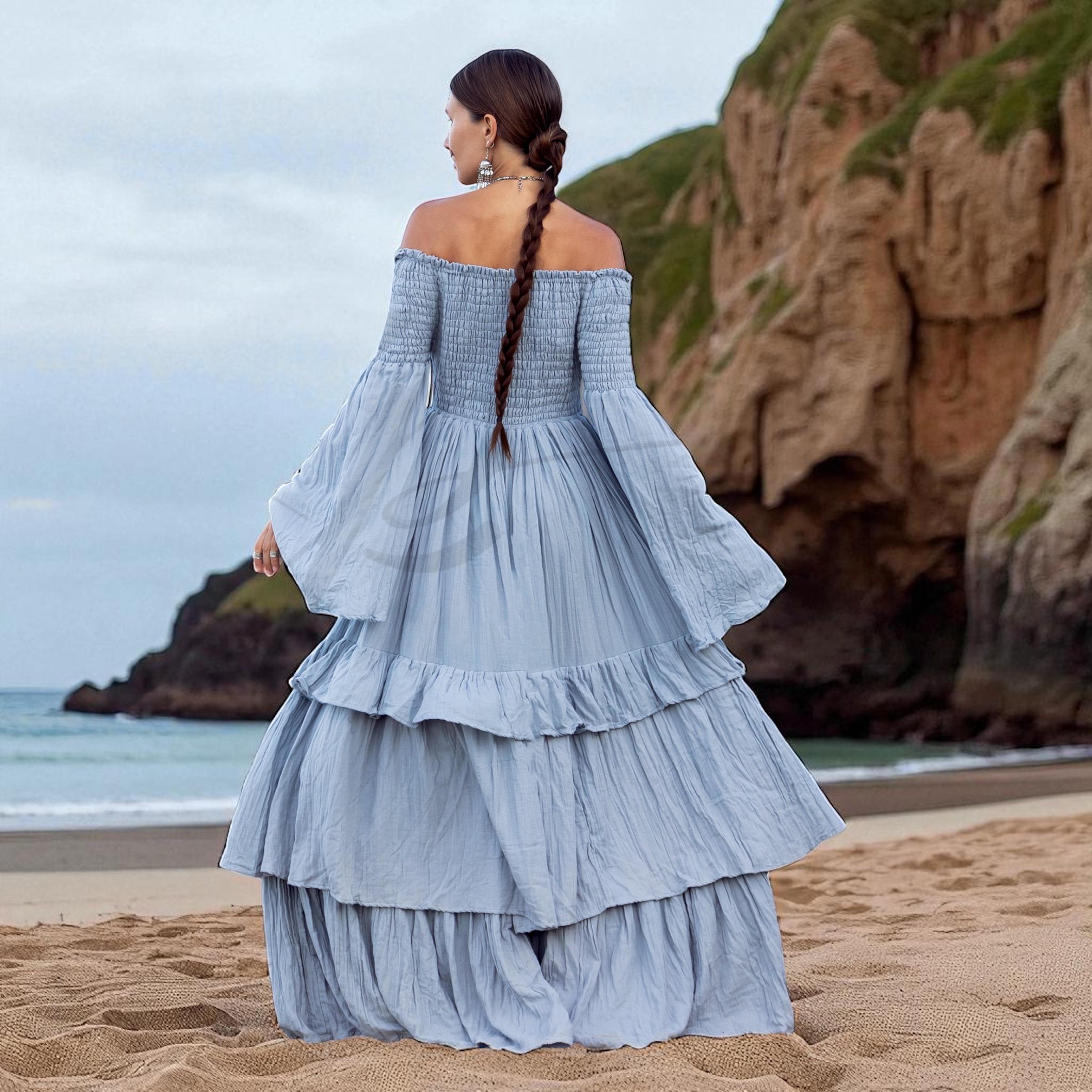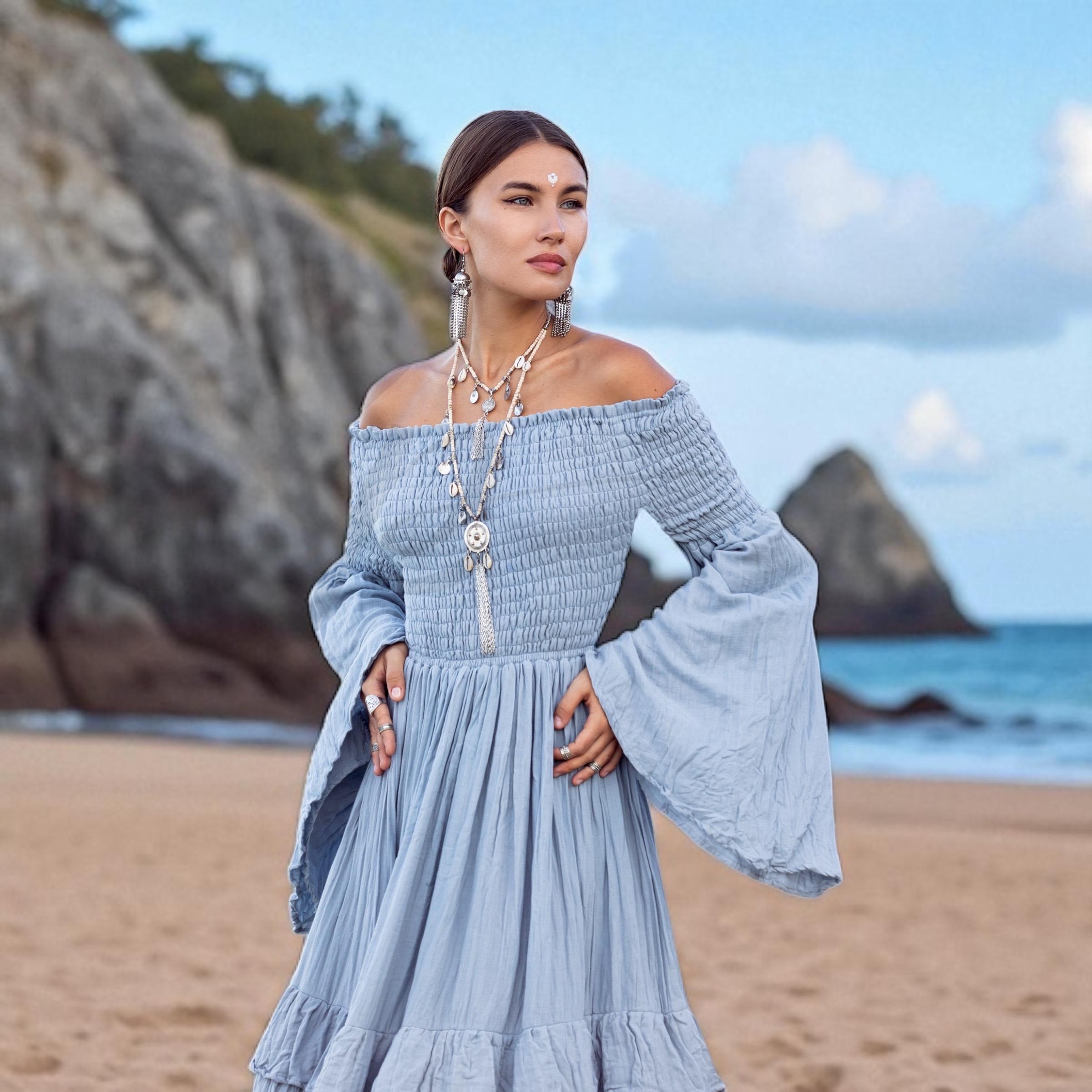 Boho Wedding Dress: Seacliff Mist Cotton Maxi Gown, Off-Shoulder Sleeves – Lucia