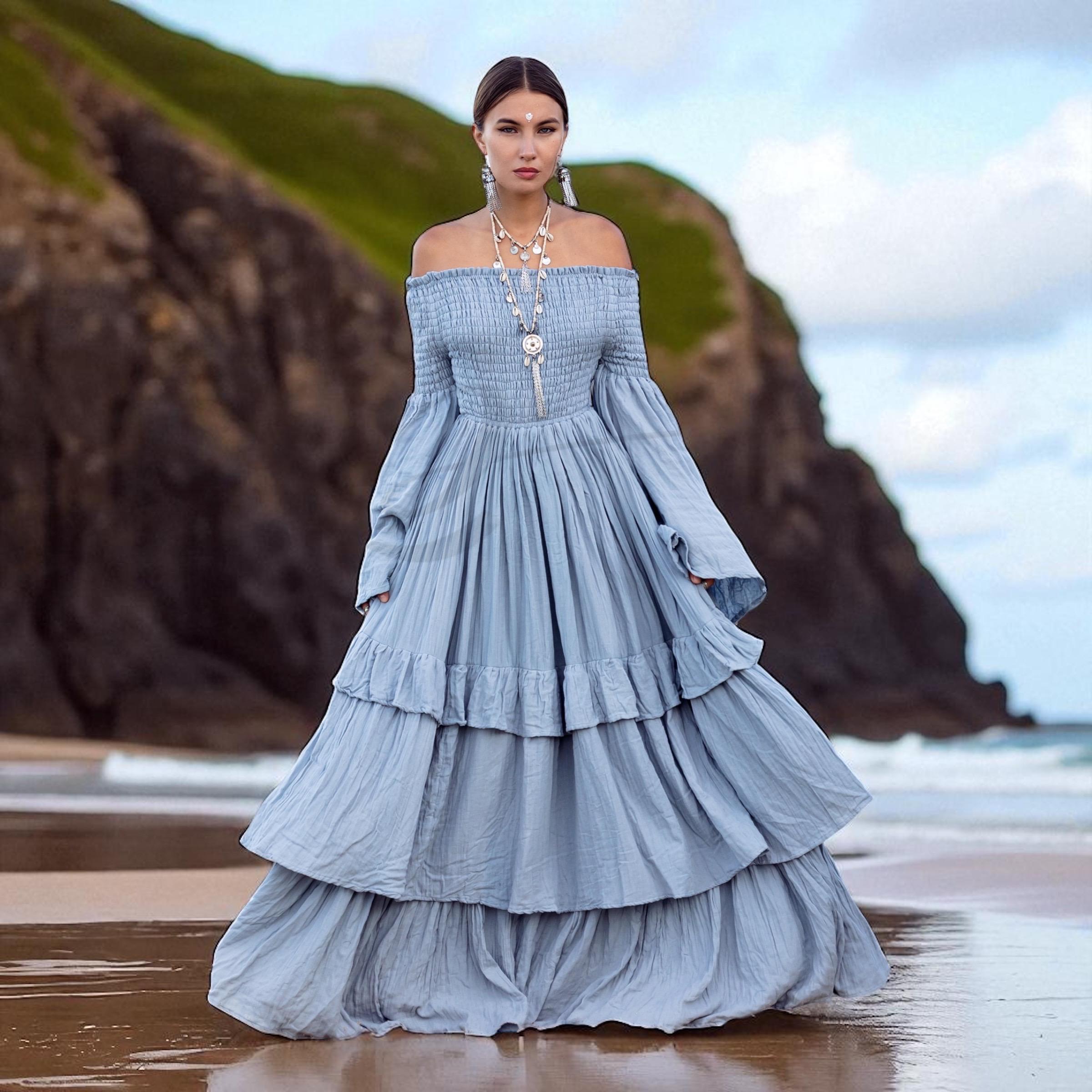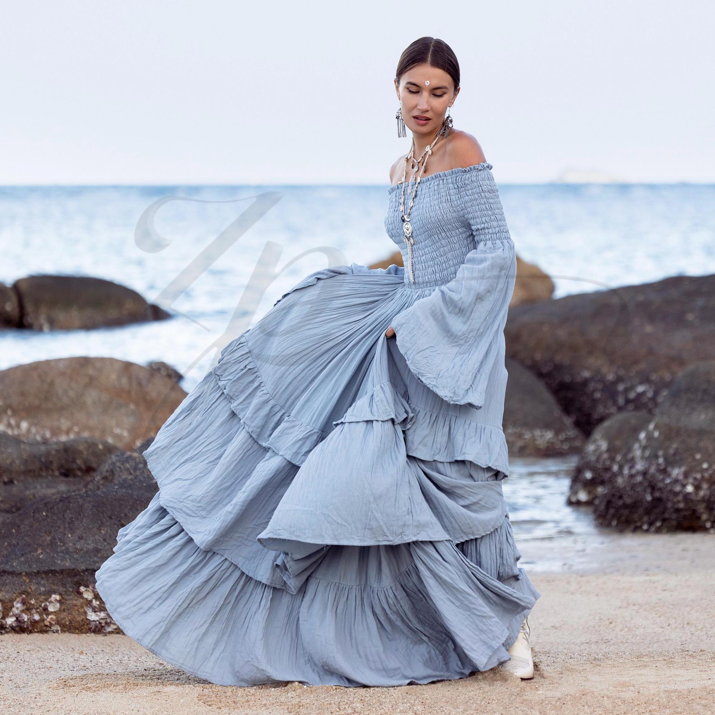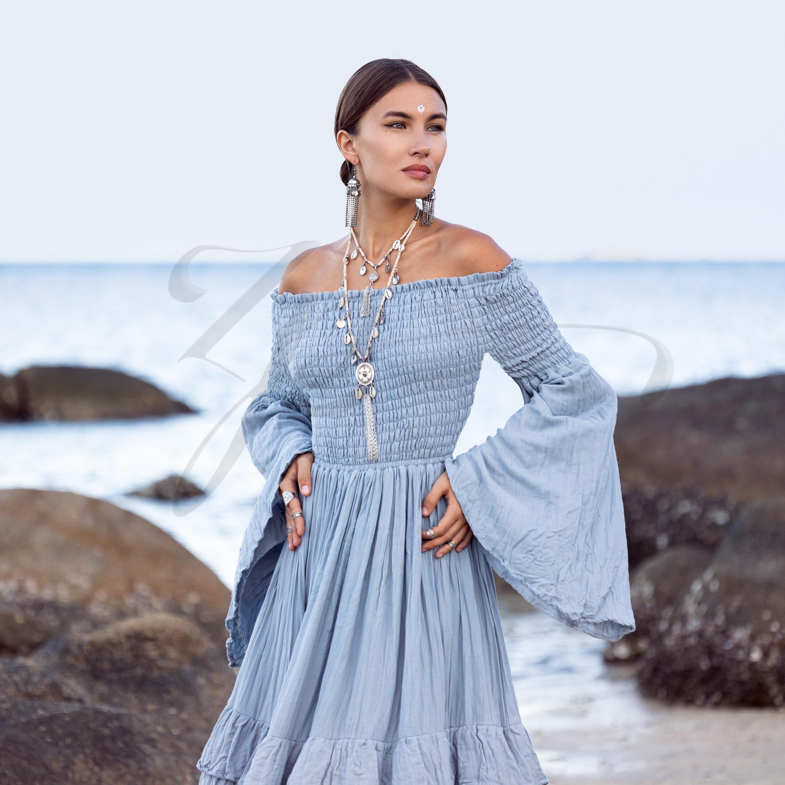Boho Wedding Dress: Seacliff Mist Cotton Maxi Gown, Off-Shoulder Sleeves – Lucia