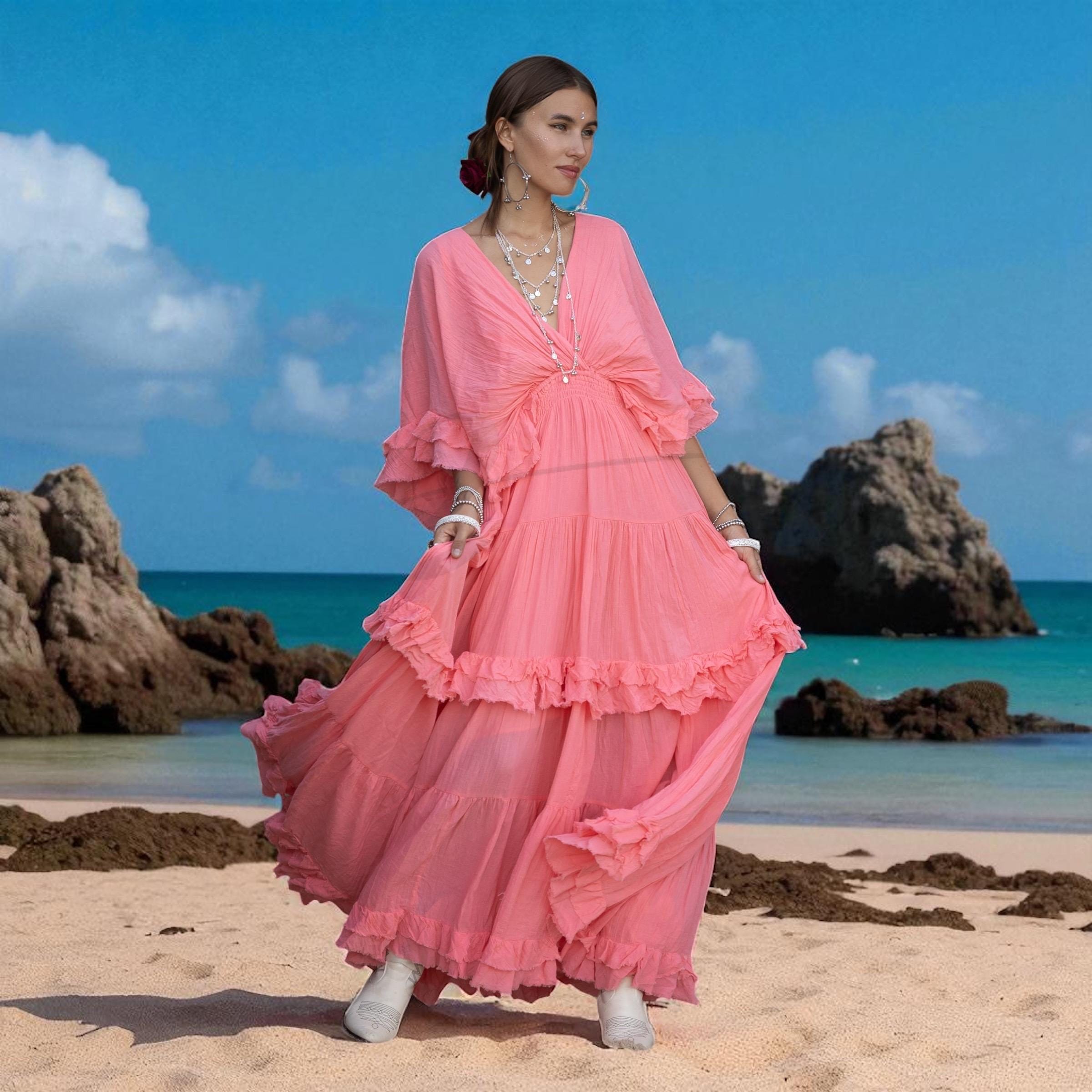 Radiate bohemian bridal beauty in the Beata Dress in Coral Sunrise, a vibrant tropical coral-pink perfect for beach vows, elopements, and golden-hour portraits. Made from 100% lightweight breathable cotton, it features a deep V-neckline, ruffled flutter sleeves, and a flowing A-line silhouette that flatters every curve. The elastic smocked waist and adjustable back tie ensure comfort for standard and maternity wear, while the semi-sheer layered skirt moves with ethereal ease. Inclusive sizing makes Beata a dreamy choice for brides who want freedom, romance, and effortless elegance.