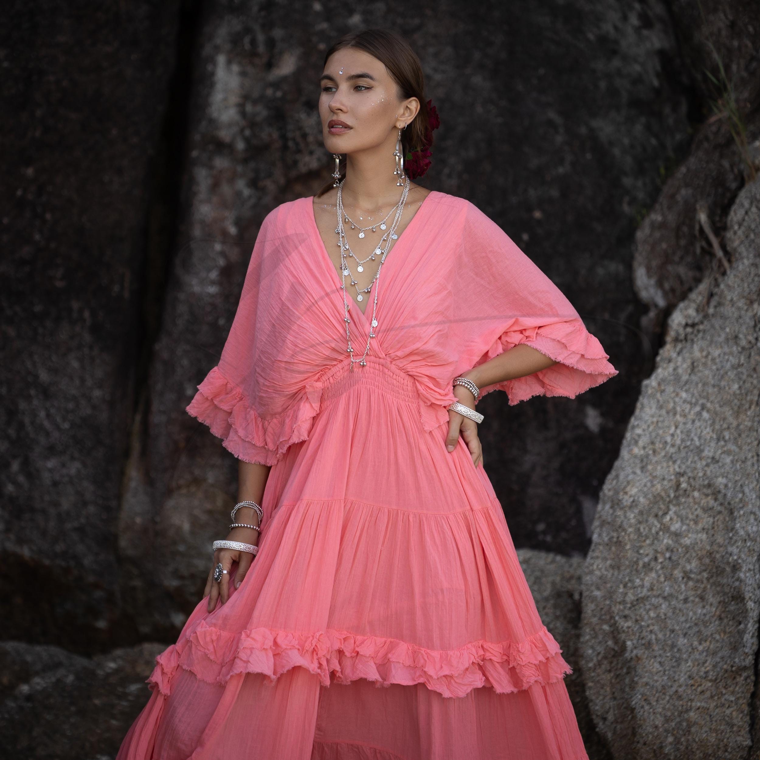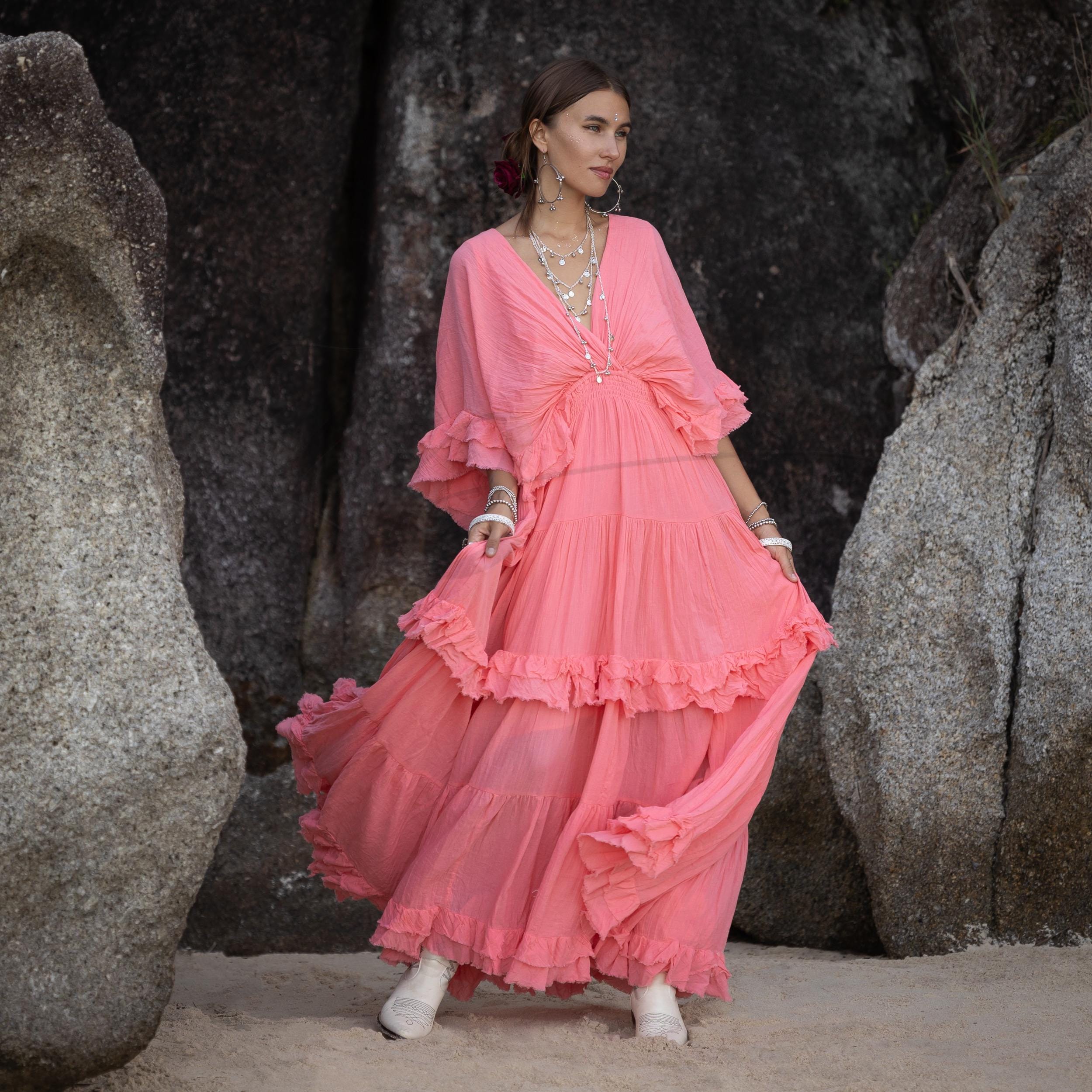 Coral Sunrise Boho Wedding Dress: Plus Size Cotton Maxi Gown – Beata