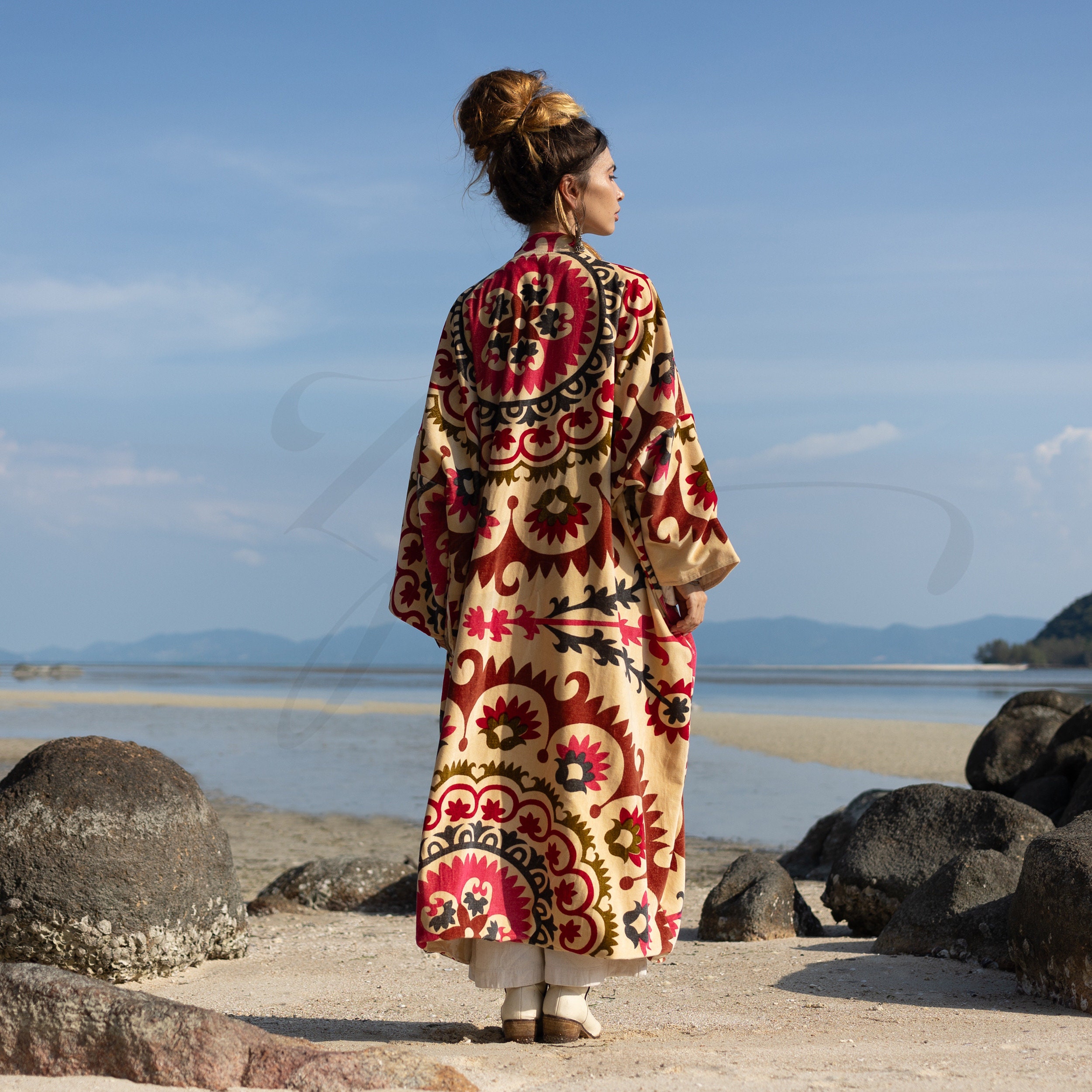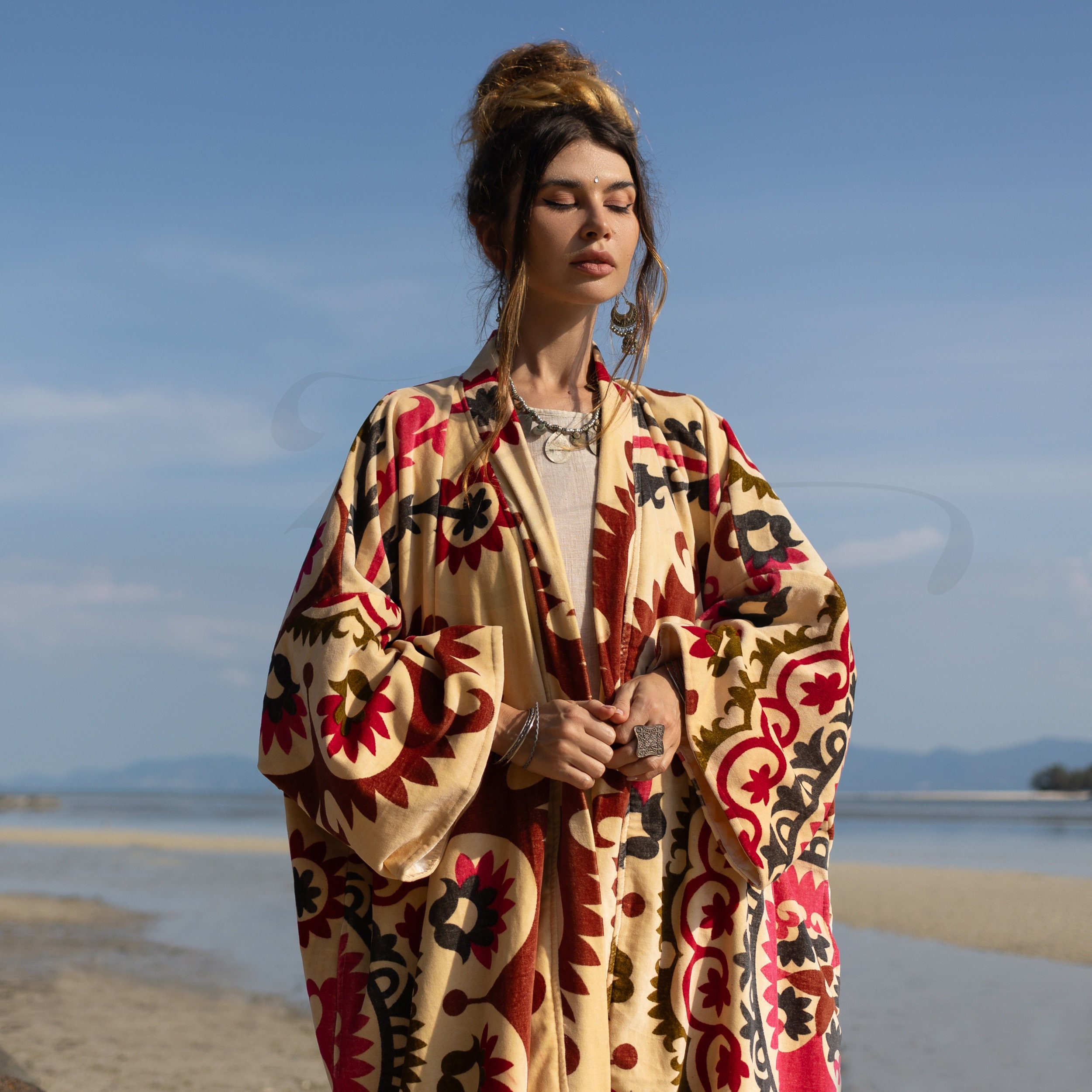 Cotton Velvet Kimono Coat: Maxi Boho Duster with Pockets – Mai