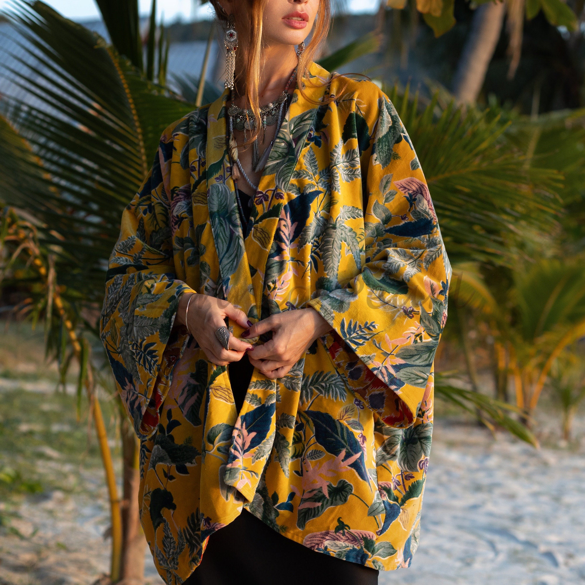 Cotton Velvet Kimono Jacket: Boho-Chic Short Coat, Plus Size – Mei