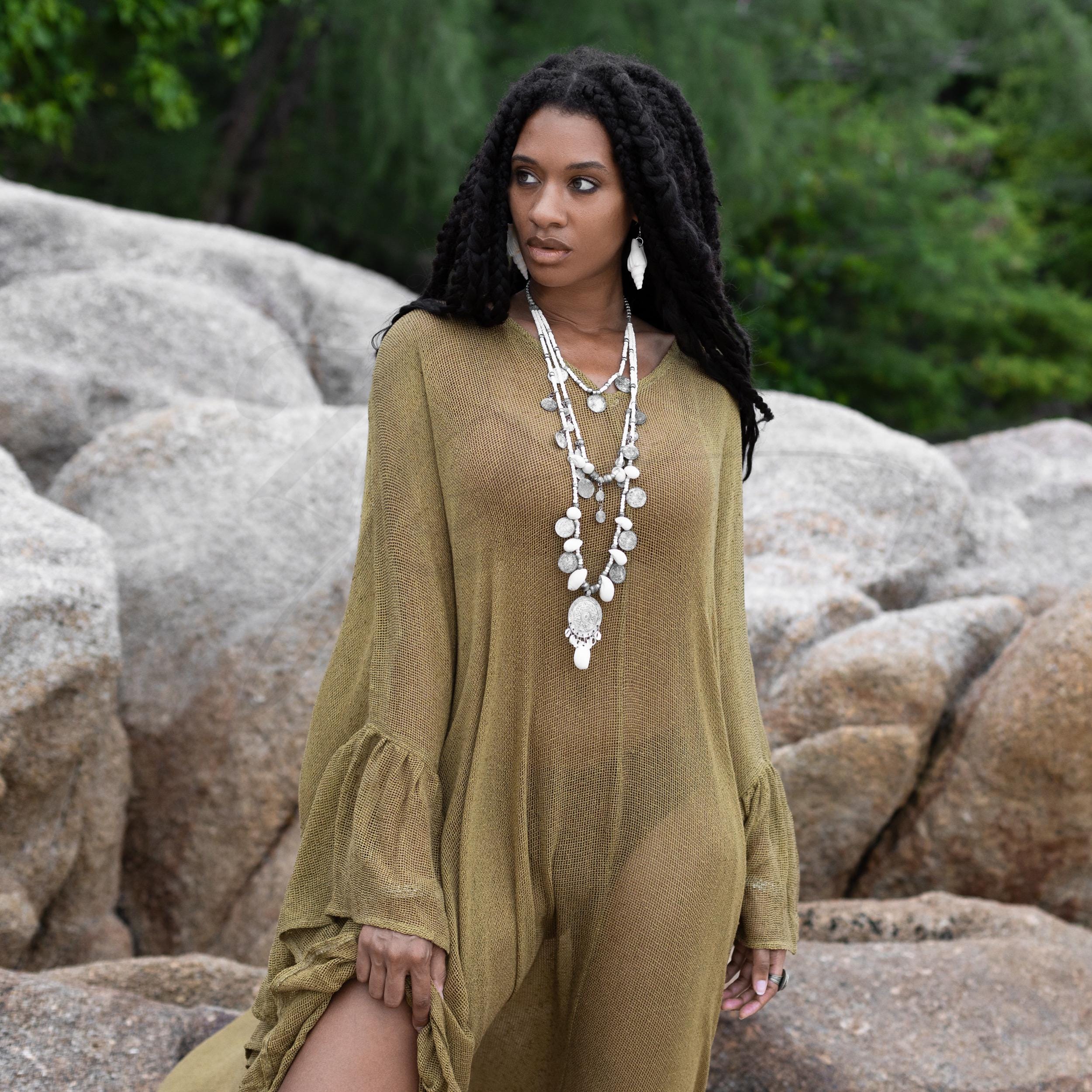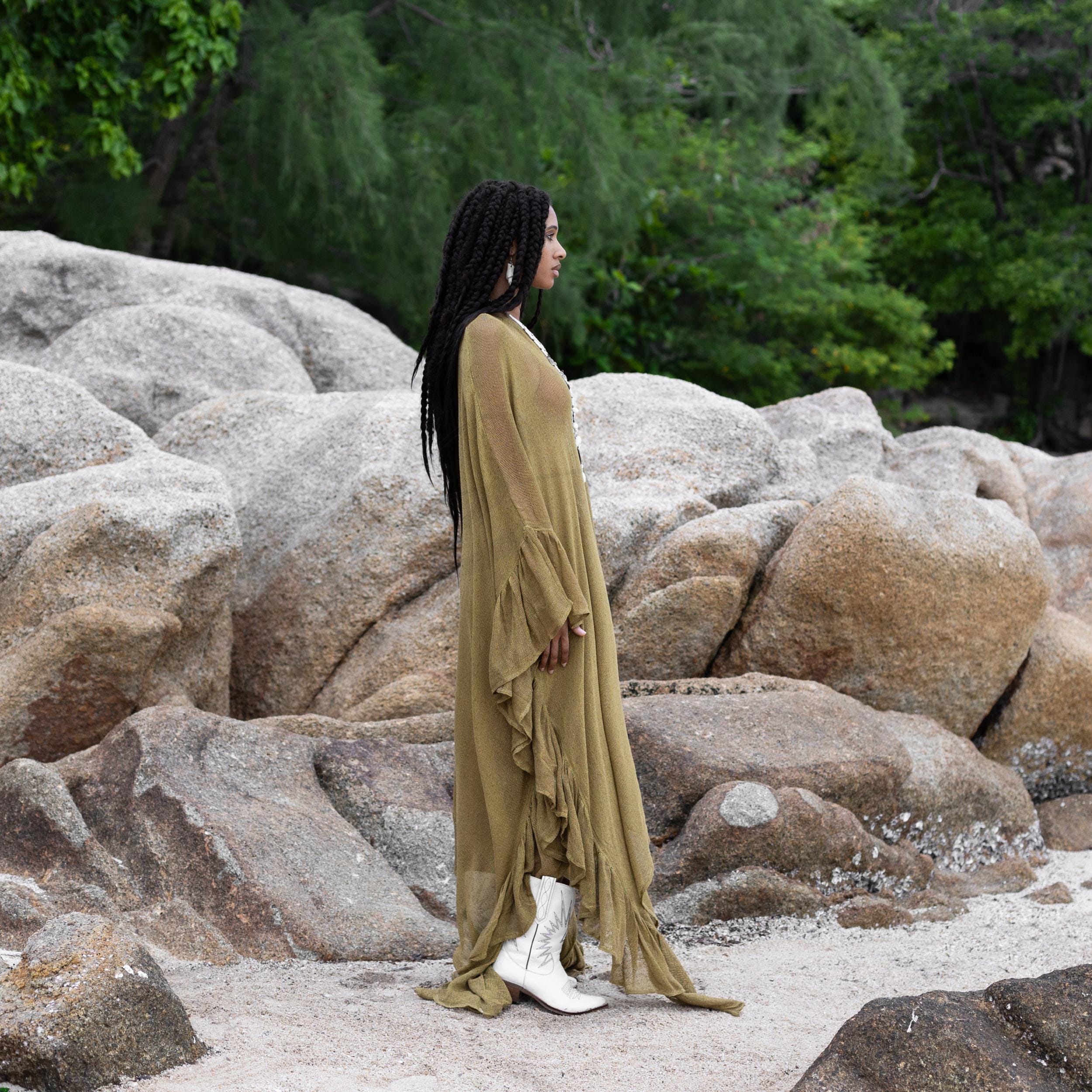 The Ondine Mesh Kaftan in Earth Moss is crafted from 100% breathable cotton and designed to flatter all body types, including plus-size. Lightweight and eco-friendly, it’s a warm-weather essential that blends comfort and elegance.