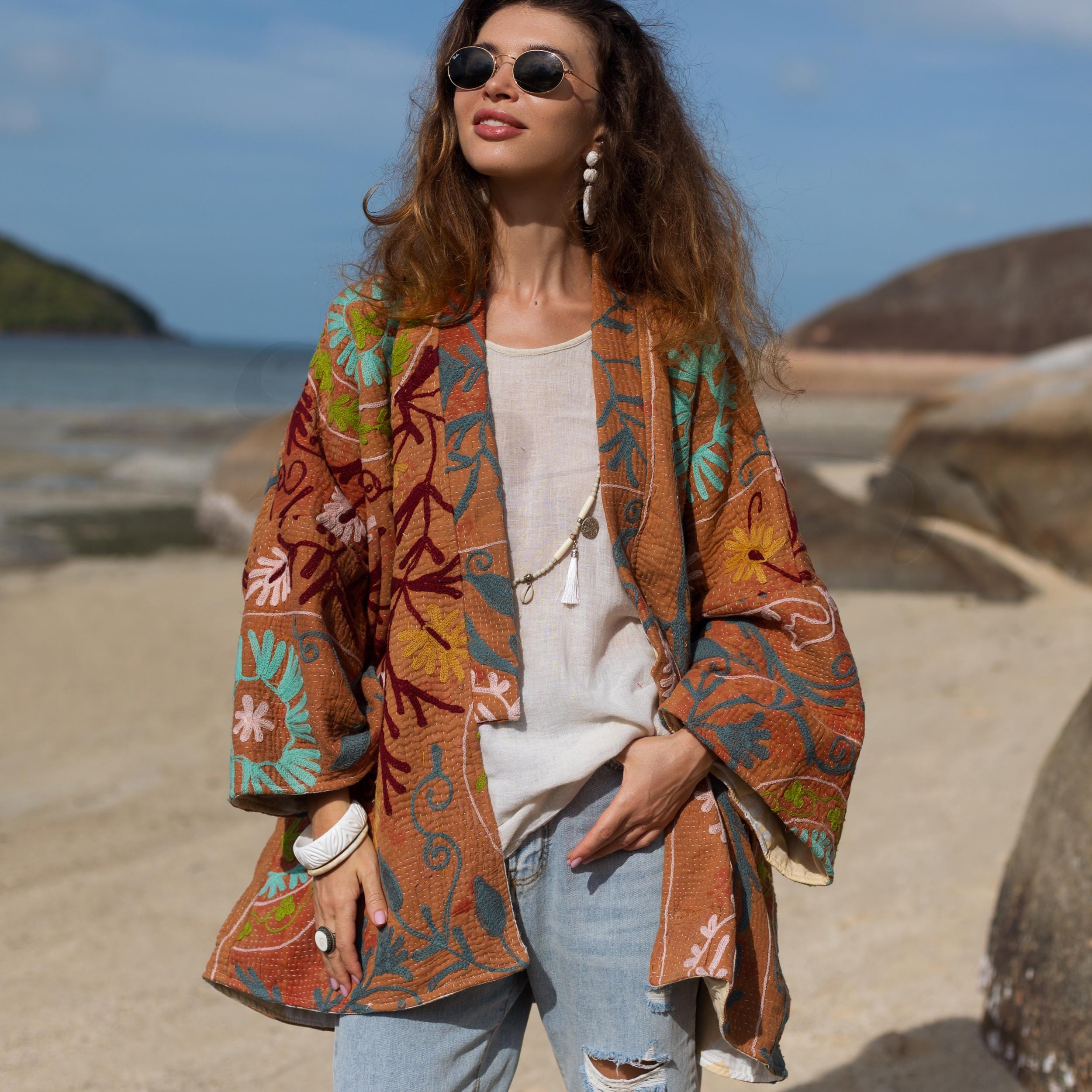 Embroidered Cotton Kimono Jacket: Plus Size Boho Floral Coat – Mari