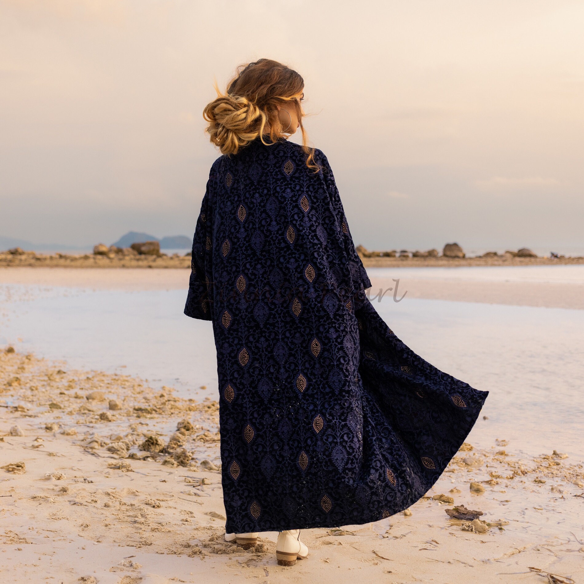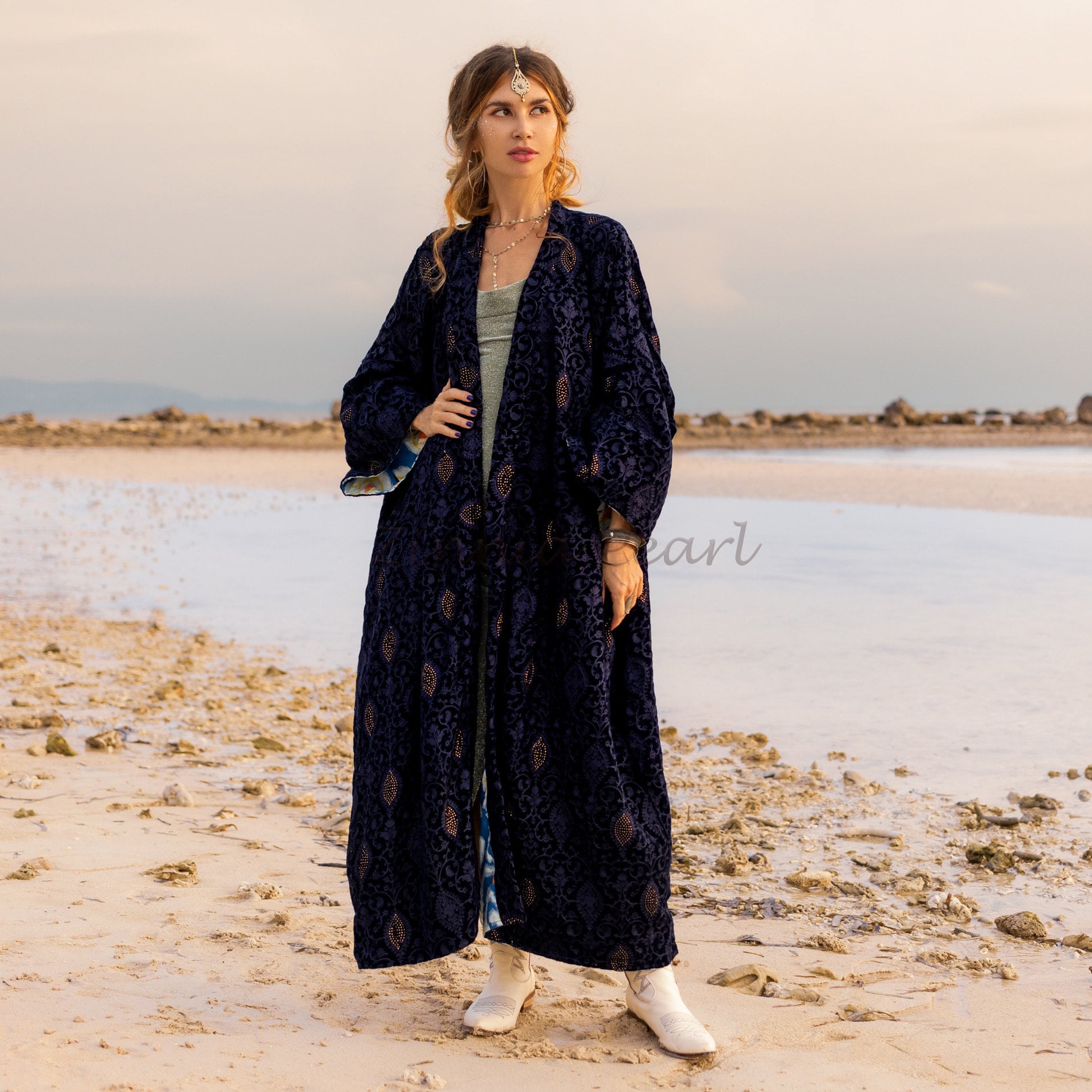 Designed to envelop you in chic warmth and timeless style, this exquisite piece captivates with its intricate details and golden accents. With an open front, wide sleeves, and detachable waistband, this maxi silhouette becomes a canvas for your personal expression.