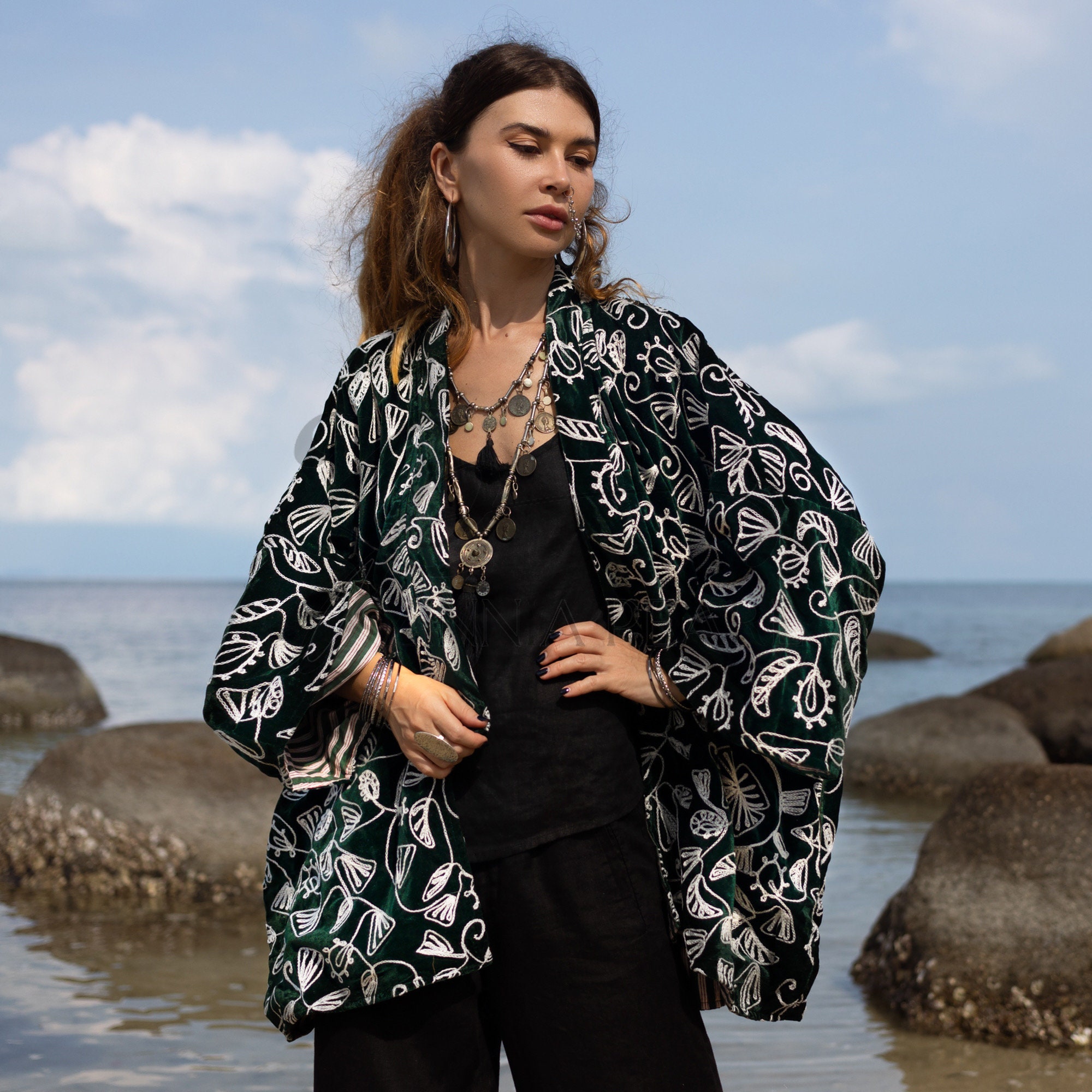 Embroidered Velvet Kimono Jacket: Plus Size Boho Chic Handmade Coat – Mei