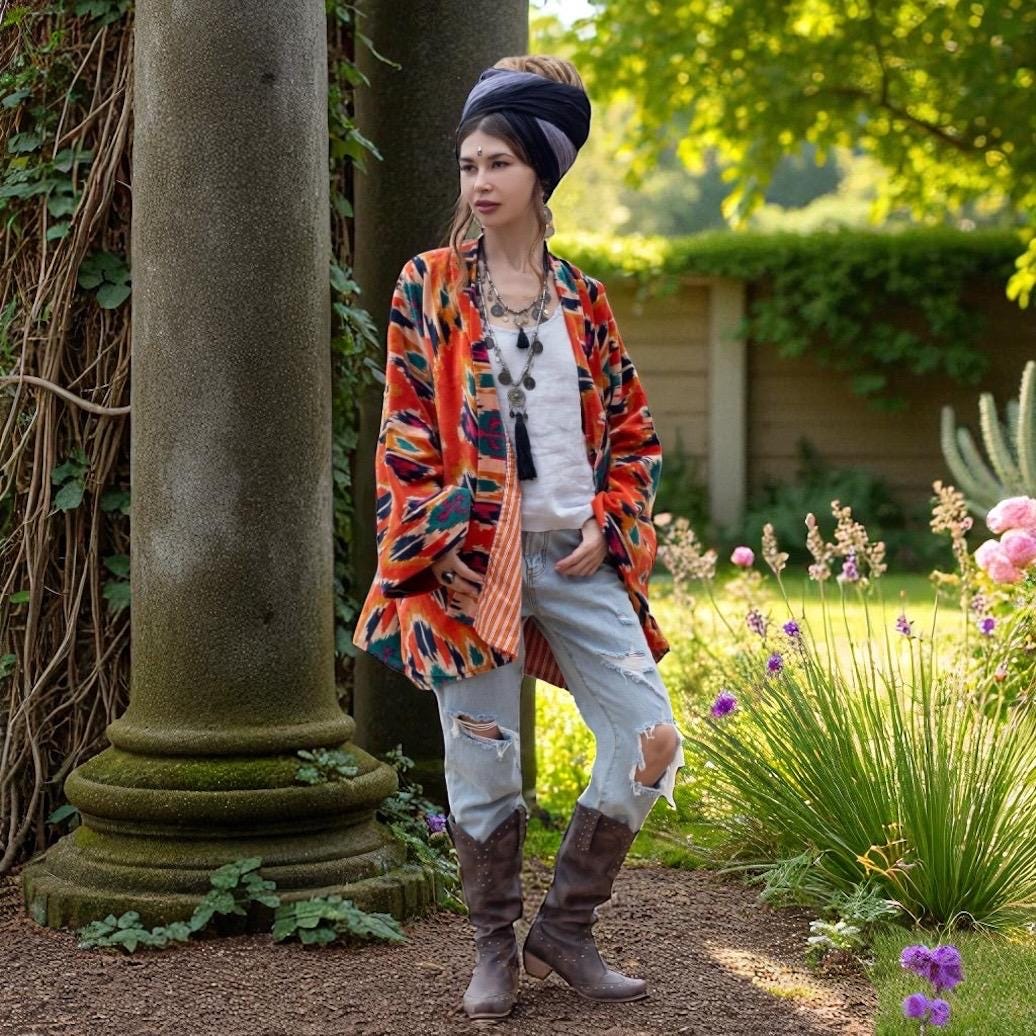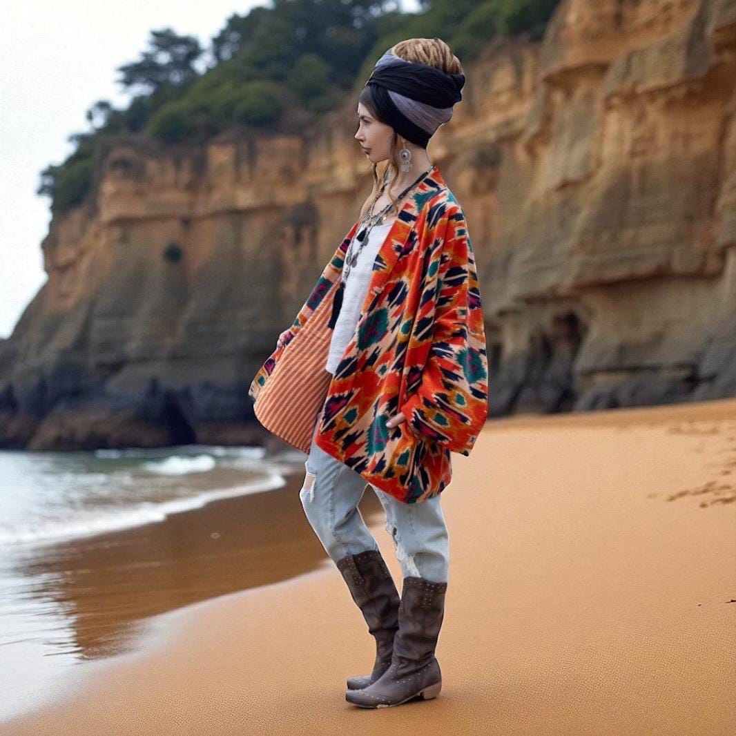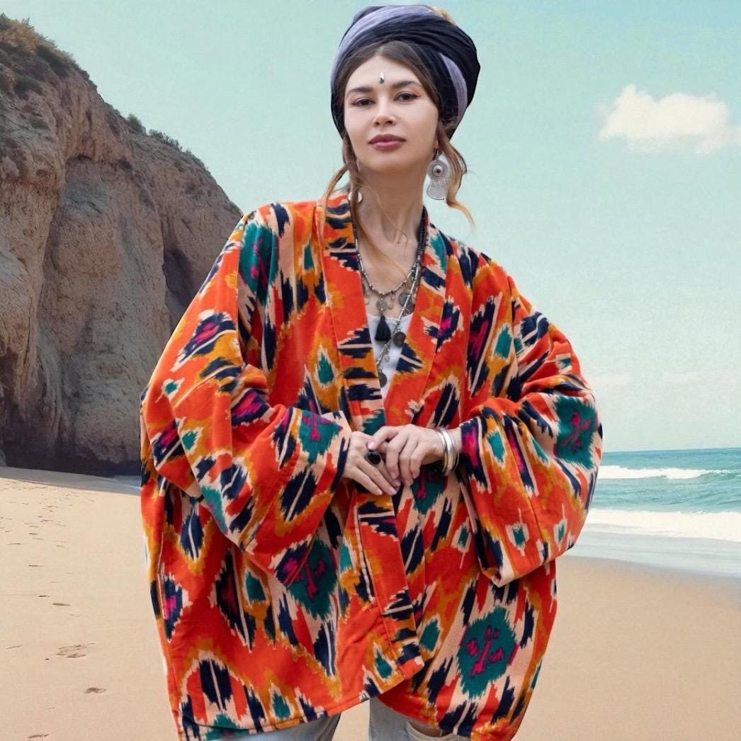 The Mei Kimono Jacket in Flaming Coral is a handcrafted velvet dream—where fiery tones and timeless ikat motifs meet cozy winter elegance. Bold, soulful, and artfully made, this boho-chic duster is perfect for festive gatherings, seaside escapes, and slow-fashion gifting.
