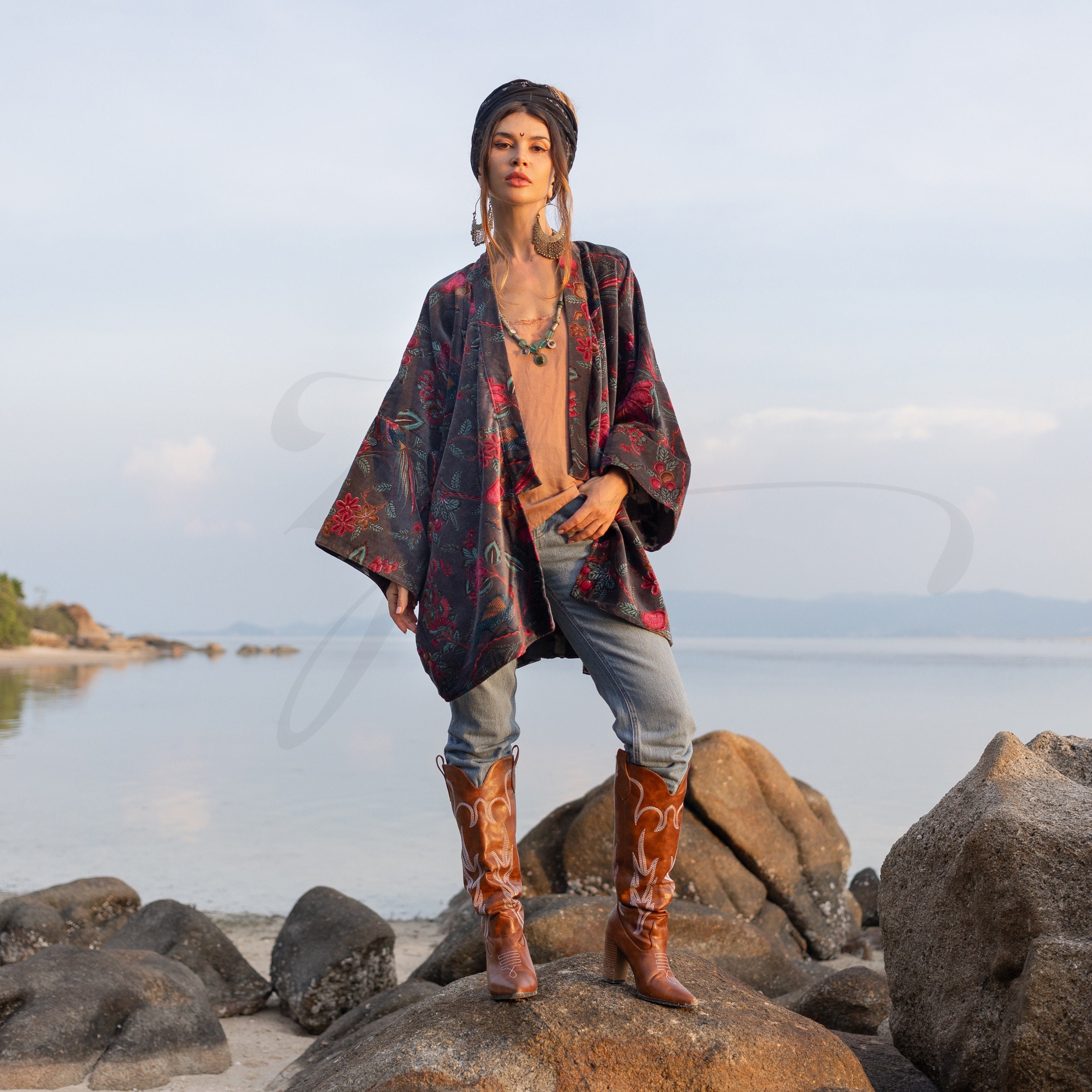 Floral Velvet Kimono Jacket: Handmade Boho Cotton, Plus Size – Mei
