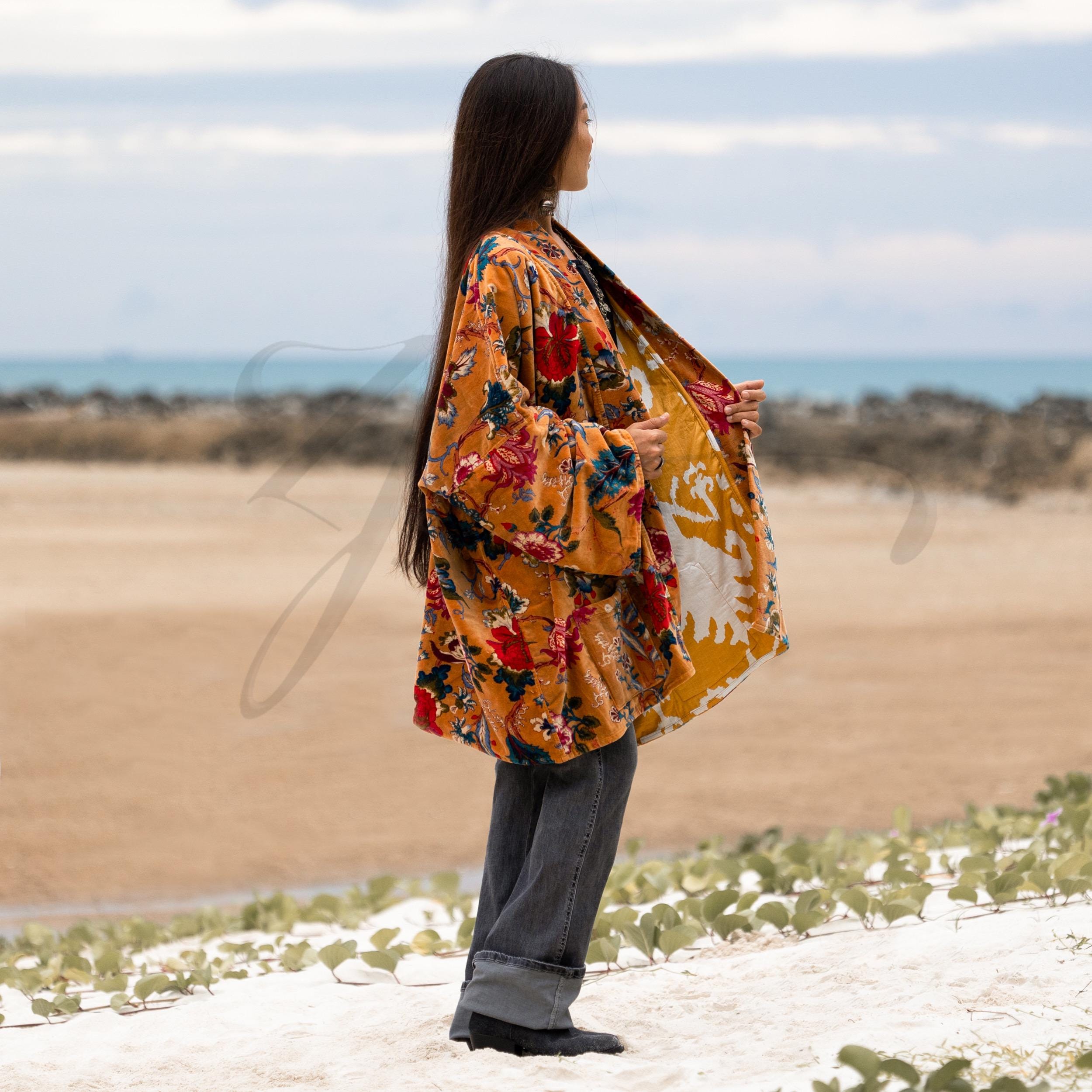 Let Golden Ember drape you in botanical firelight — a velvet coat stitched with artisan soul, made for the bohemian goddess within.