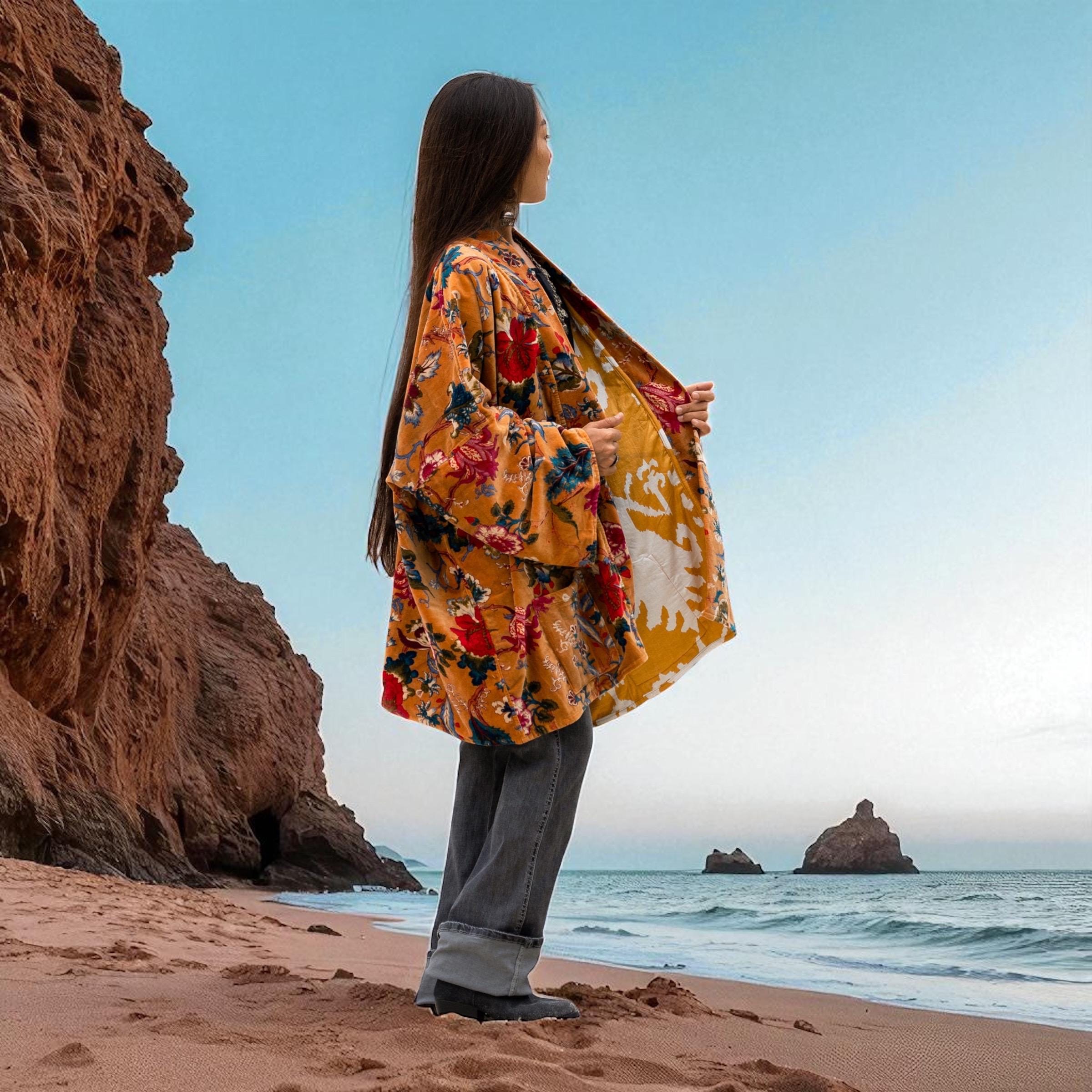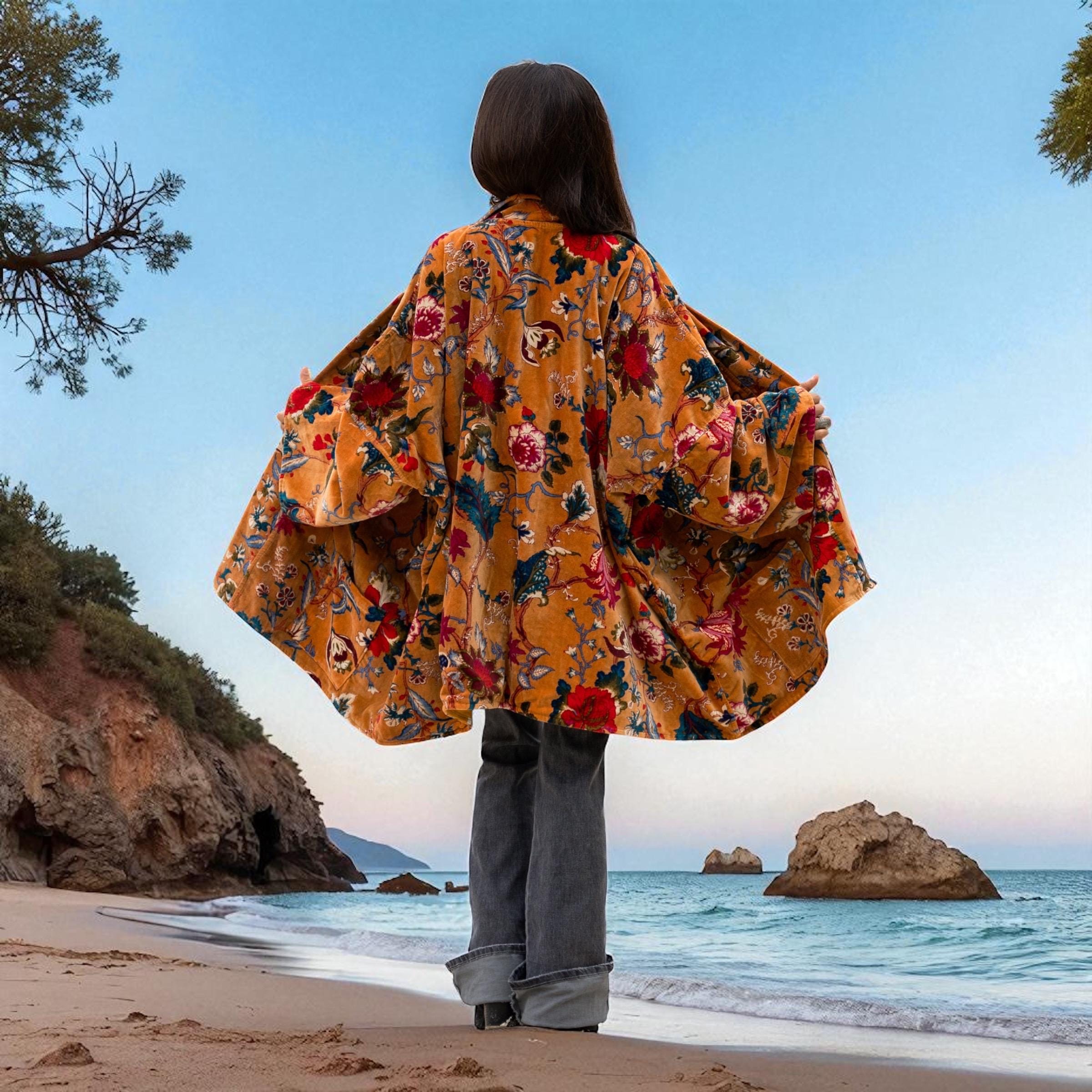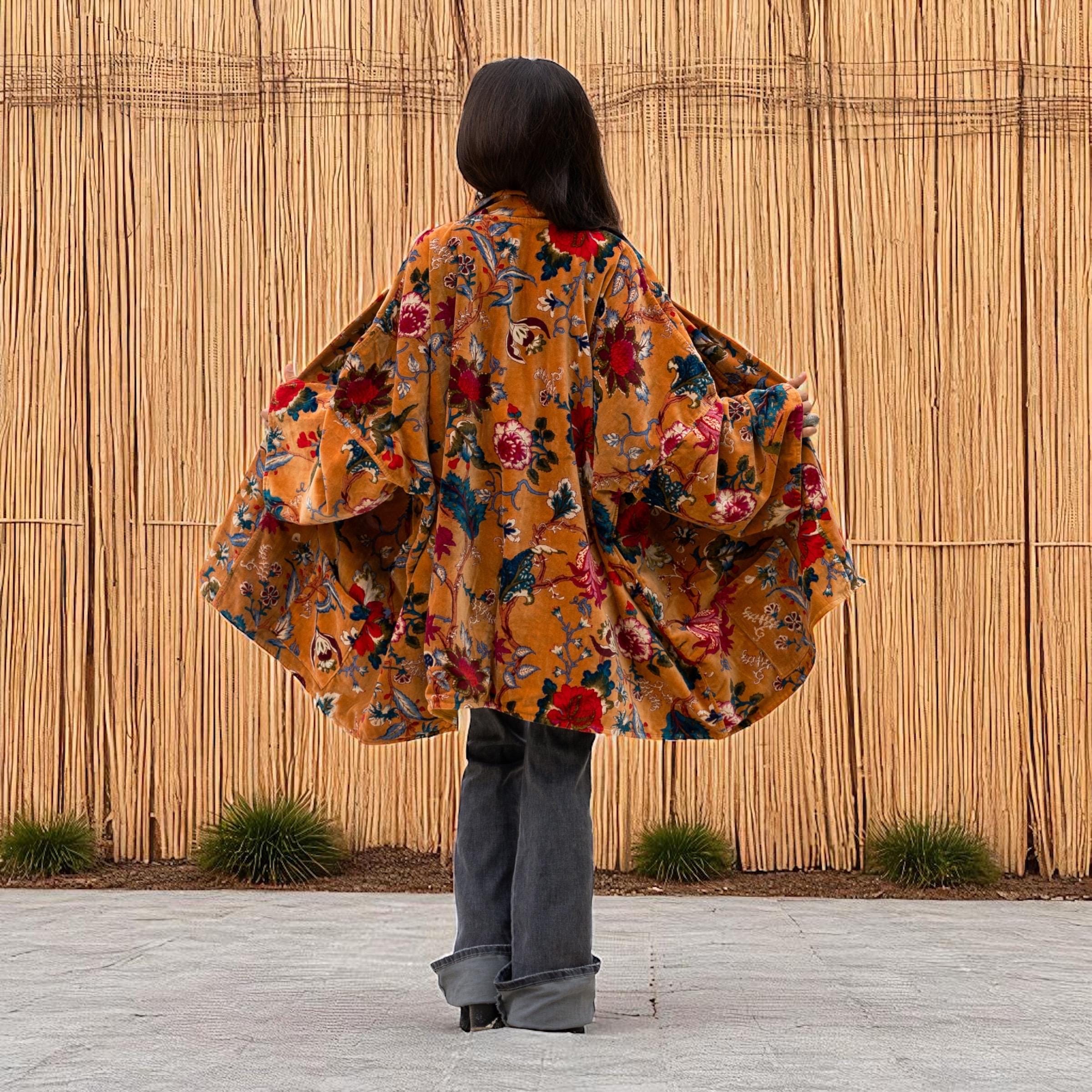 Embrace effortless style with the Mei Kimono in Golden Ember—a plus size velvet duster alive with bohemian flowers. Its golden base glows with crimson, jade, and amethyst blooms, echoing festival firelight and vintage bazaar charm.