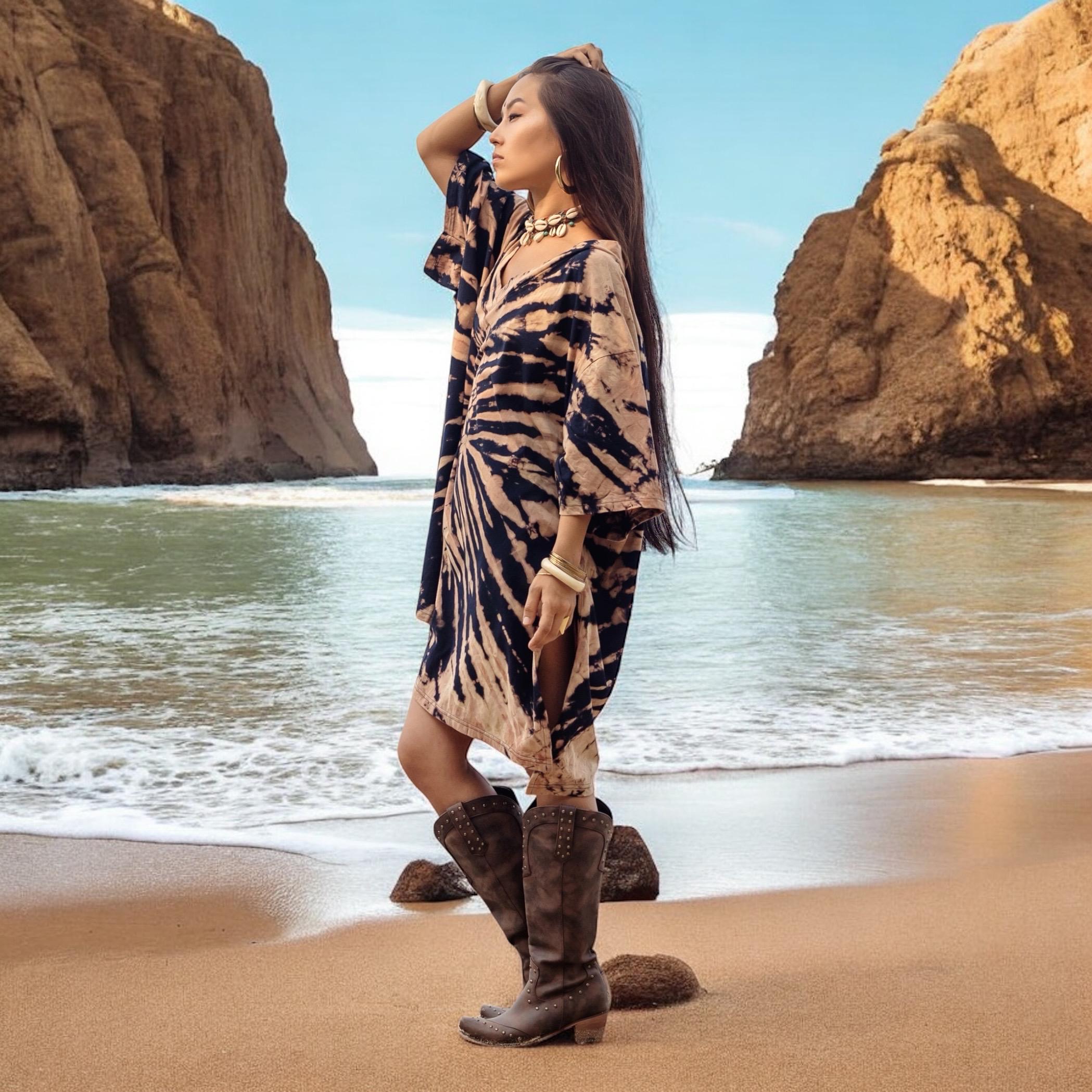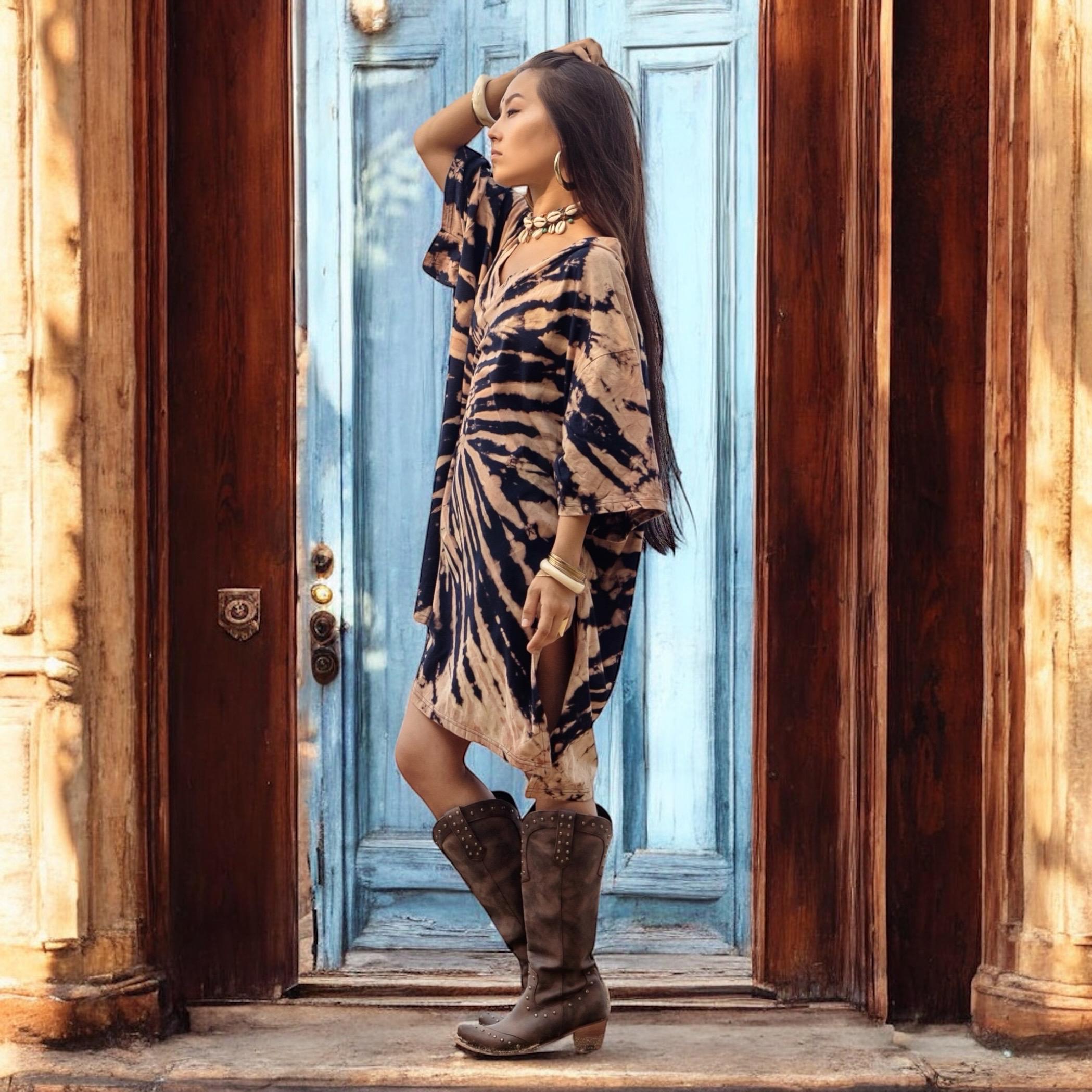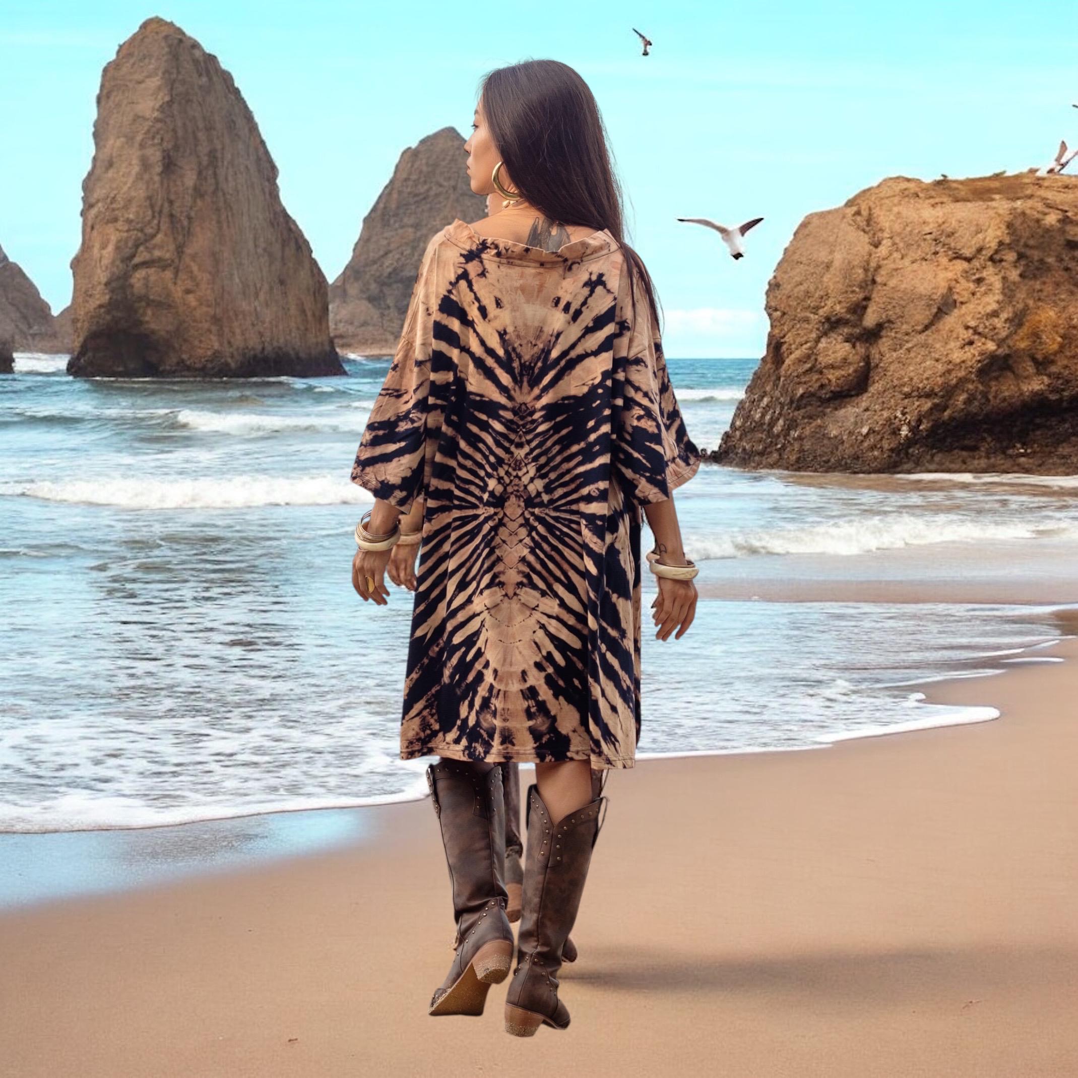 Introducing Ninive in Ink Sandstorm—a bold boho tie-dye tunic dress handcrafted for free spirits. This artisan kaftan is hand-dyed in rich waves of inky black and sun-washed sand, capturing the wild harmony of desert storms and cosmic spirals. No two are ever the same—each piece is a sacred expression of individuality.