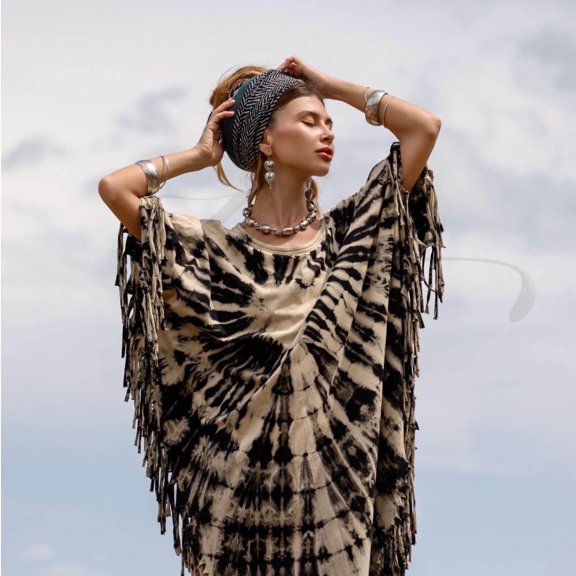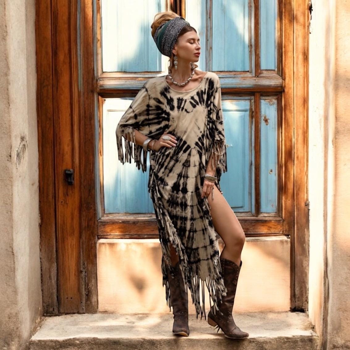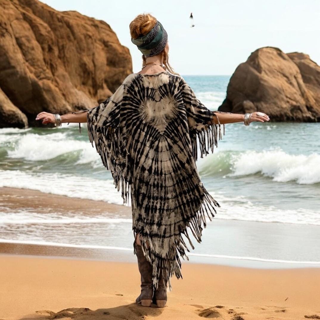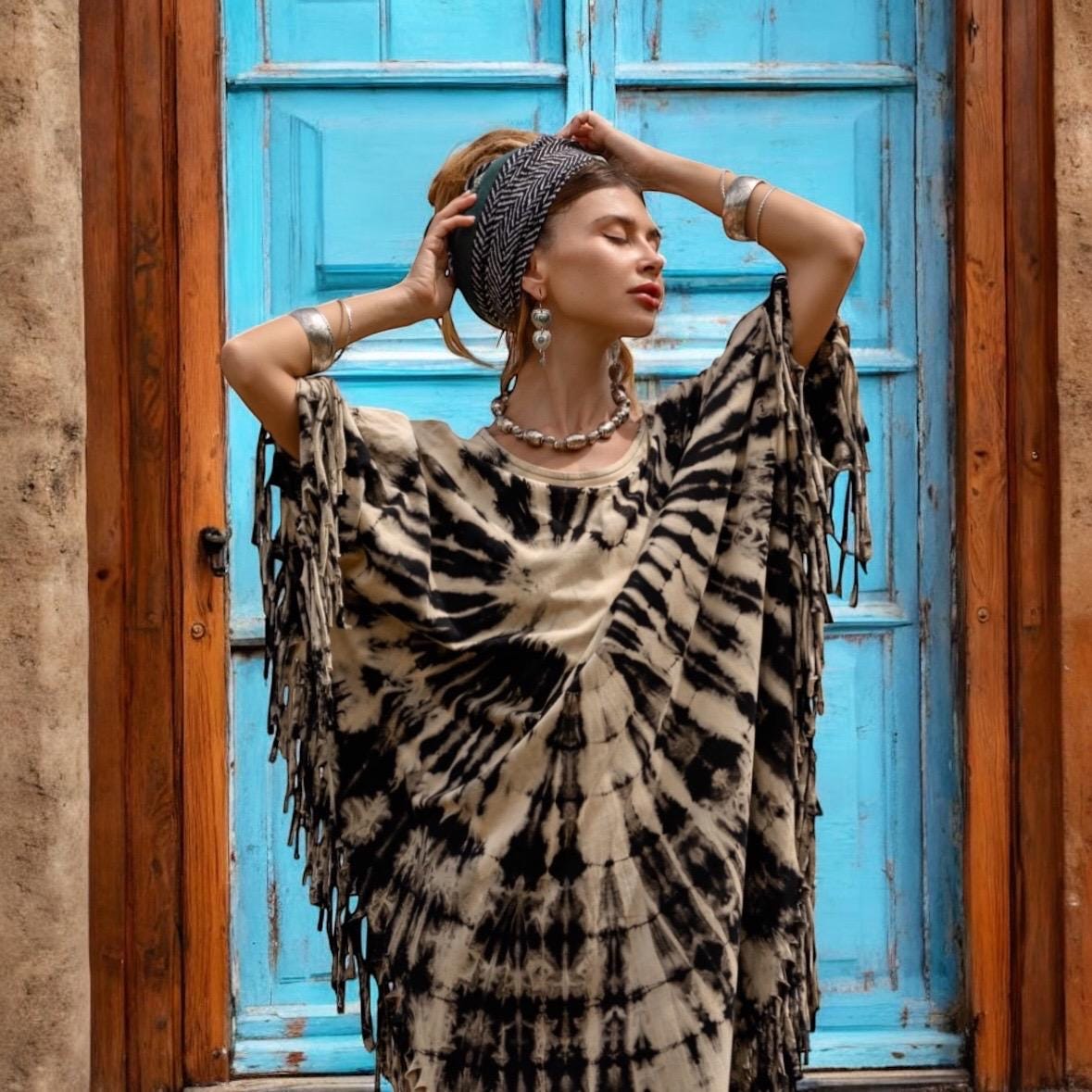 Hand-Dyed Tie-Dye Fringe Kaftan Dress: Plus Size Boho Festival Poncho – Arlo