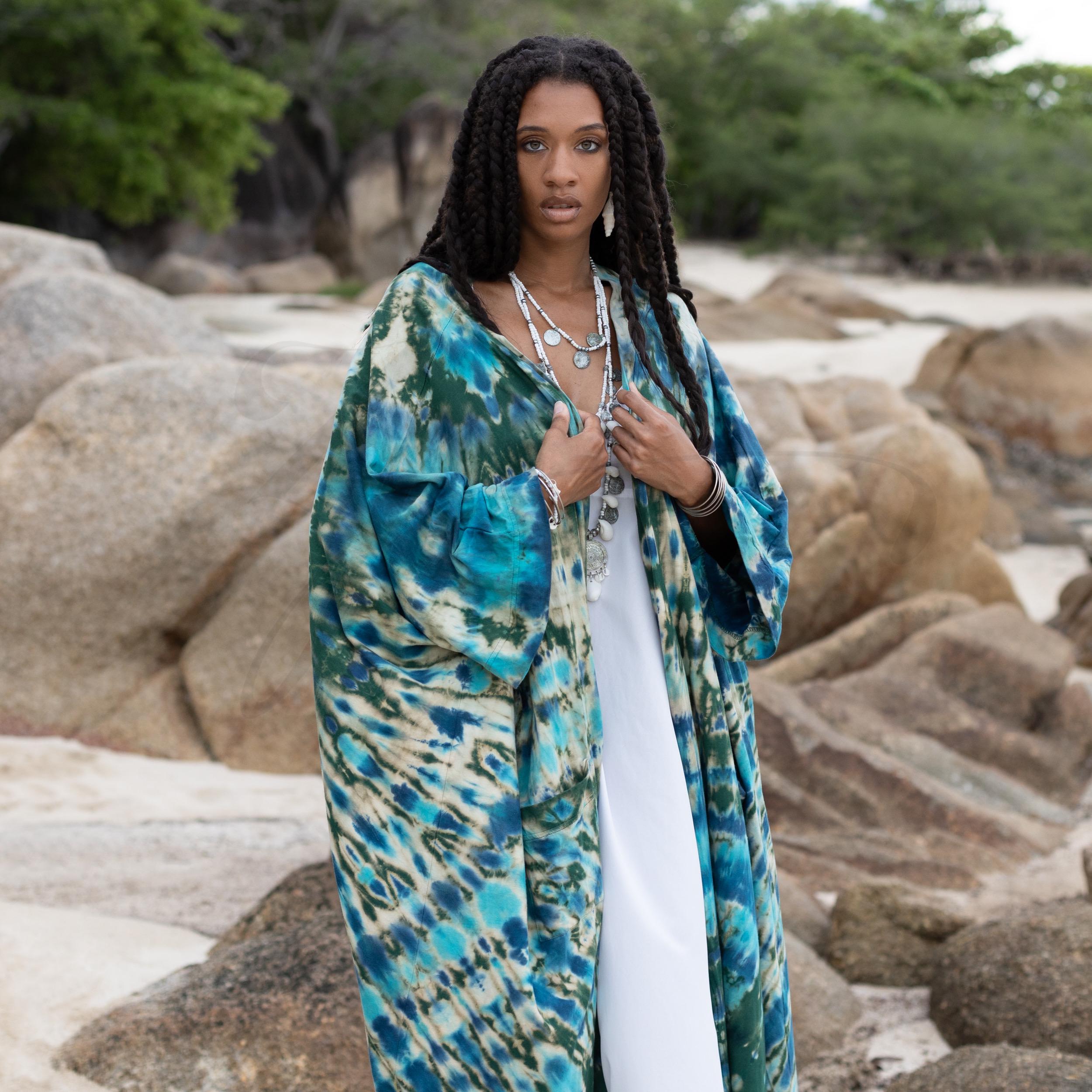 With the Aurora Nova Kimono Duster, your unique spirit unfurls, echoing the cosmic wonders above. Explore our shop for more unique tie dye creations!"