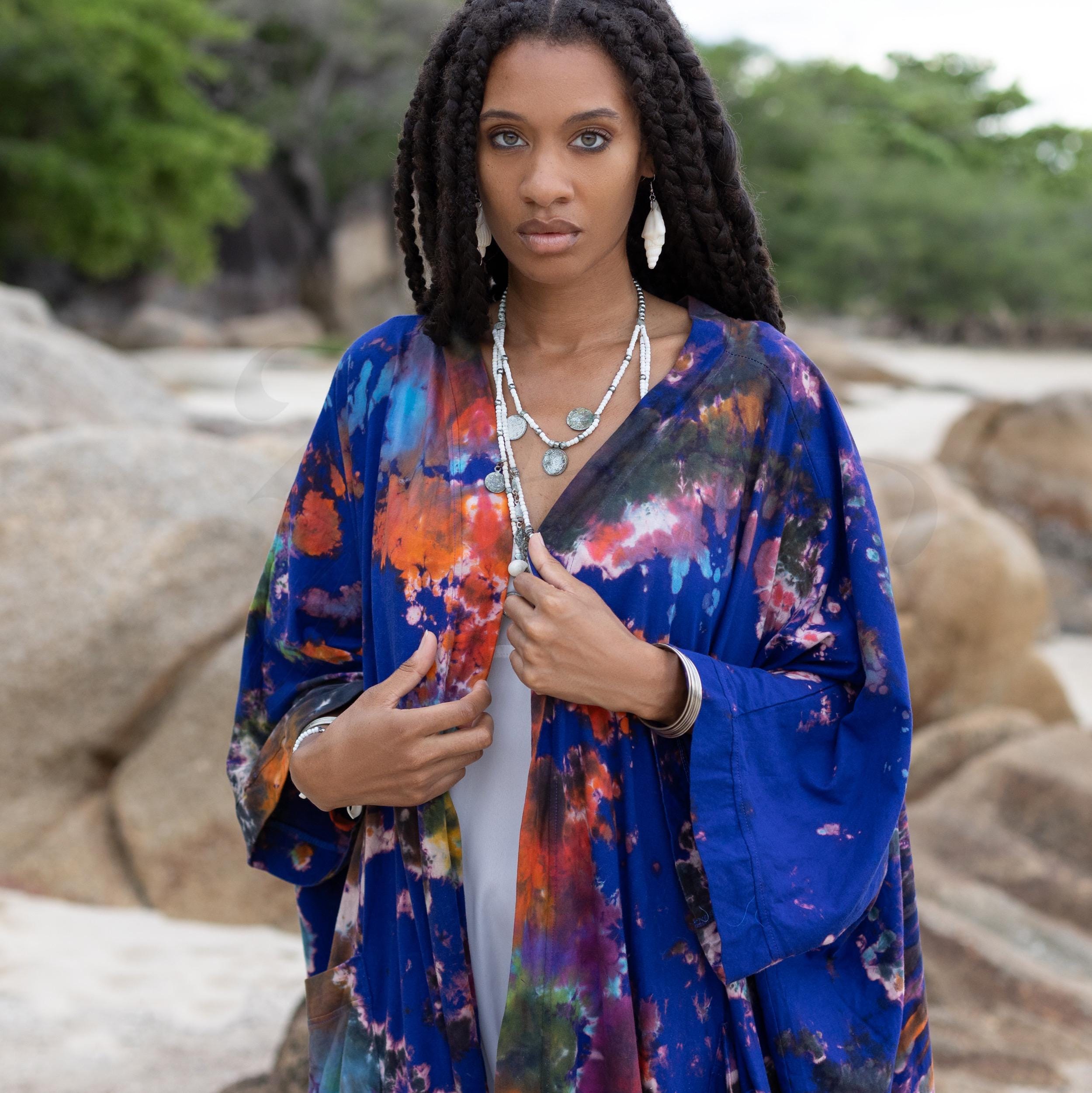 Step into the captivating world of the Aurora Nova Cosmic Chroma Kimono Duster, where vibrant colors and intricate hand-tie dye artistry come together to create a truly unique, boho-chic statement piece. This flowing, full-length kimono is designed to celebrate your individuality, offering an inclusive fit for every body type.