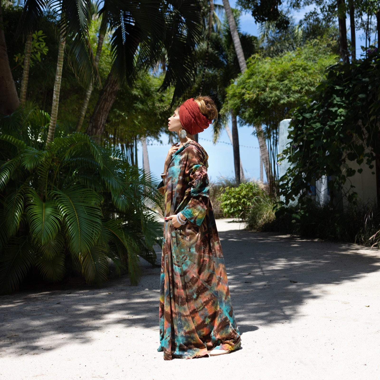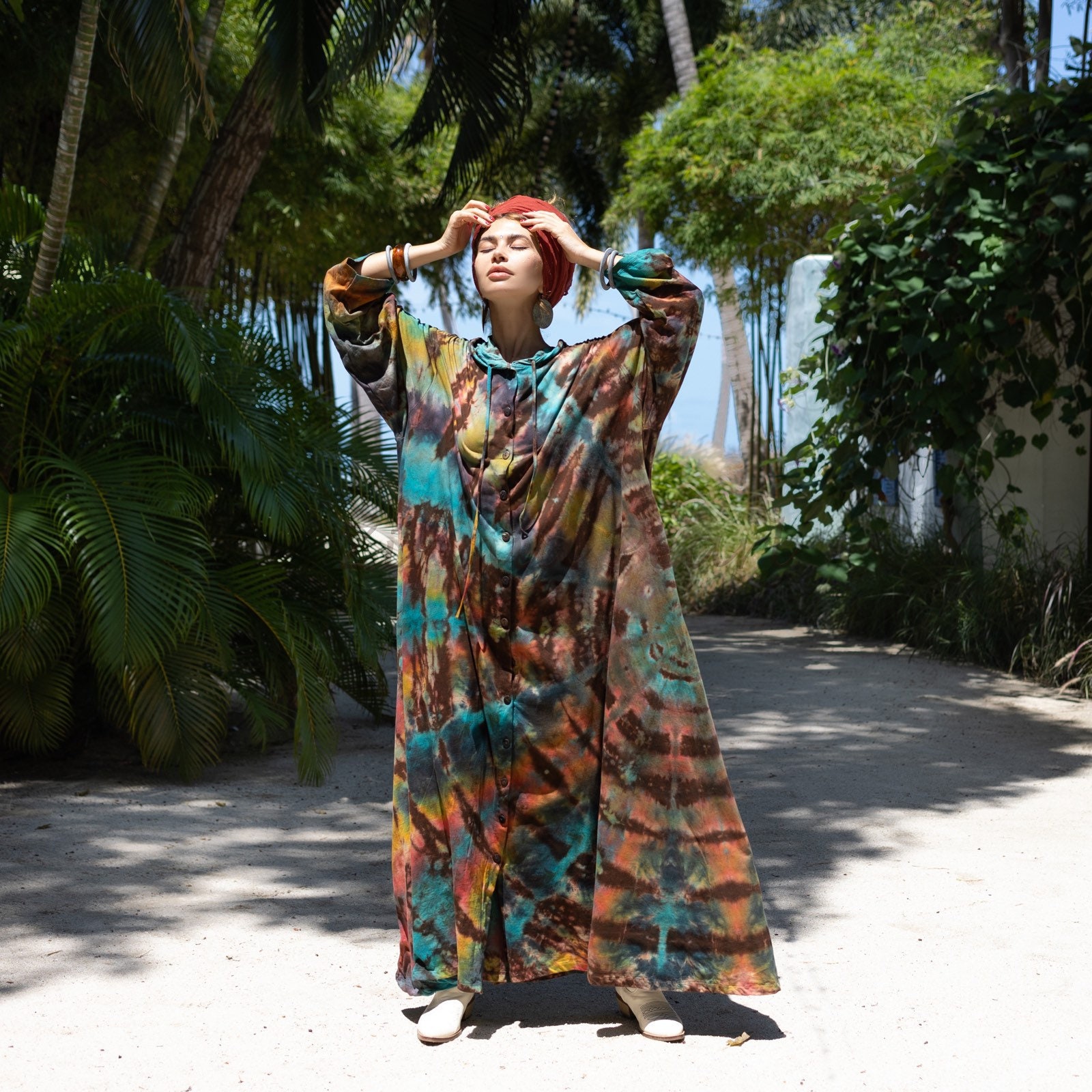 Details: button down-cardigan, shirt dress, festival dress, functional side pockets, relaxed fit, hooded, maxi silhouette, hand dyed – each cardigan- shirt dress is hand-dyed individually and is one of the kind, there will be slight variations in colors.
