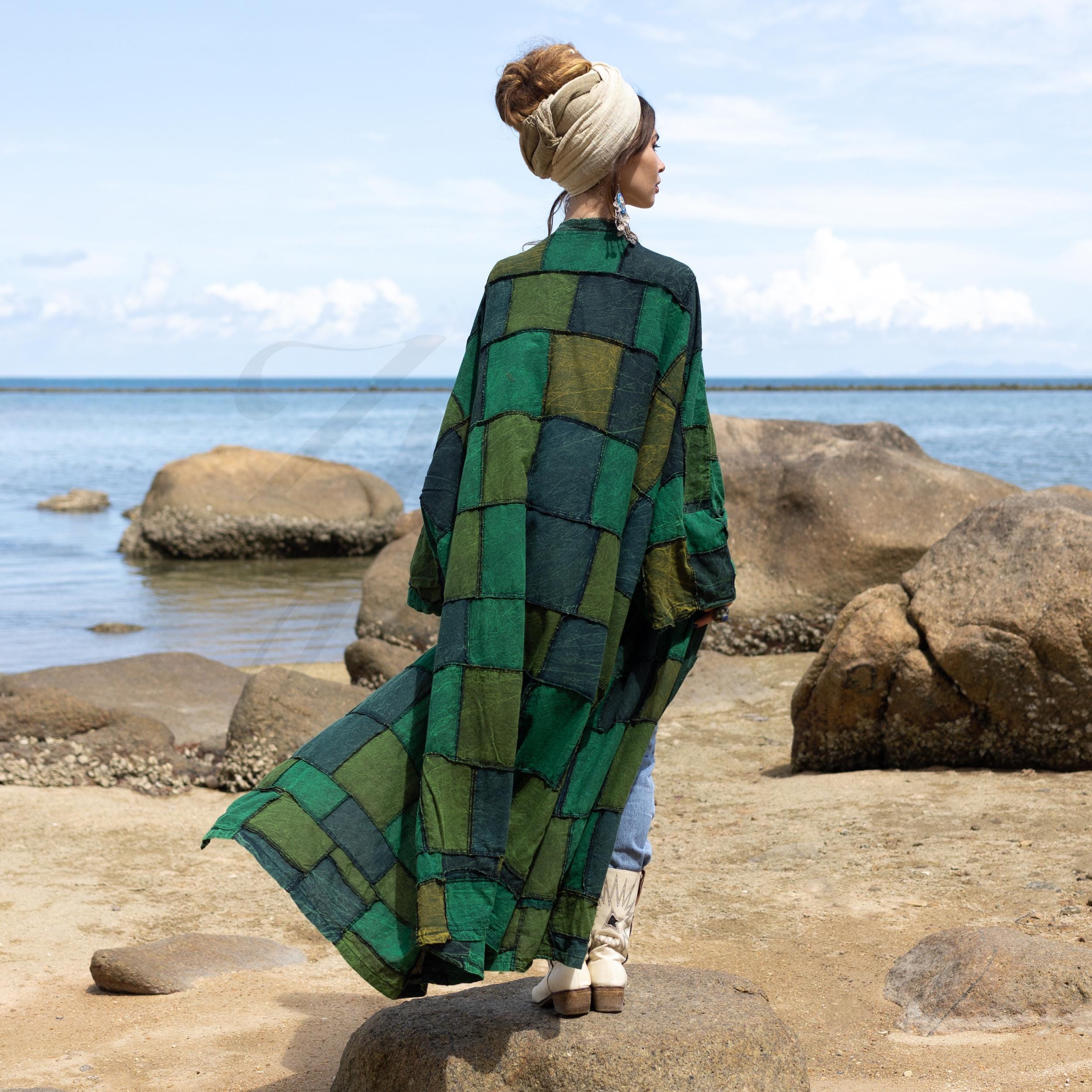 Enhance your boho style with The Veda Plus Size Patchwork Kimono Duster. This handcrafted forest green duster is perfect for festivals, casual outings, or as a unique Christmas gift.