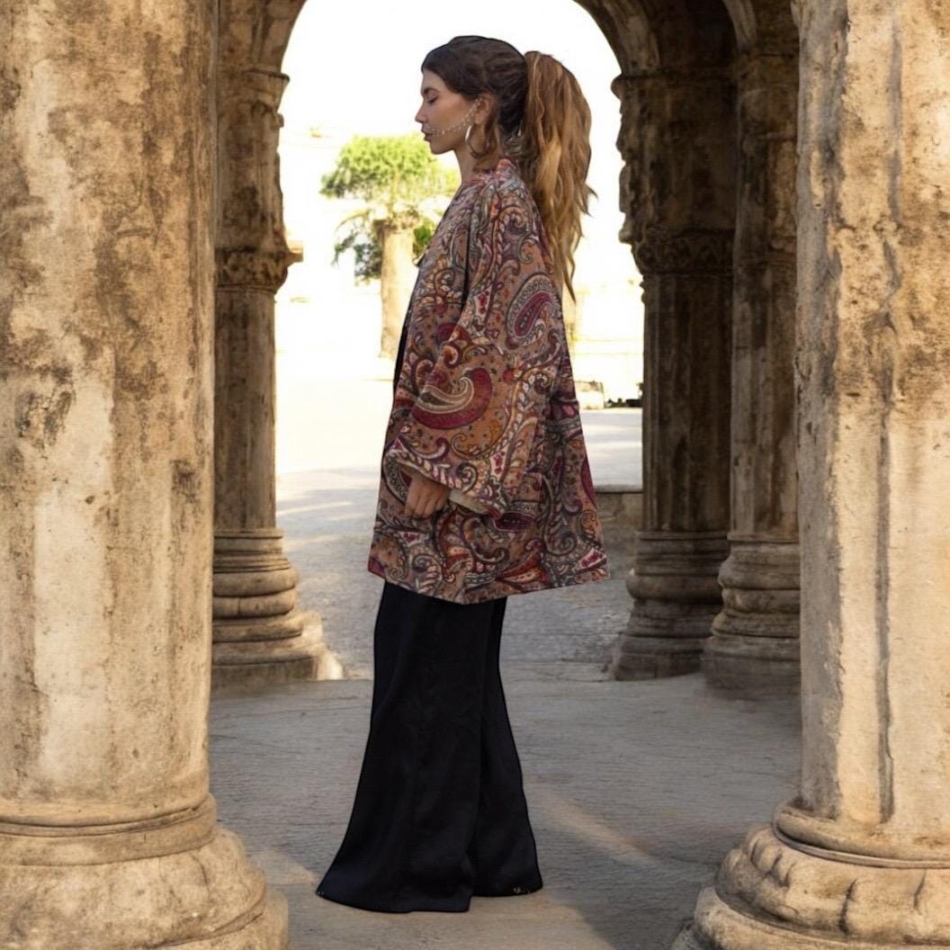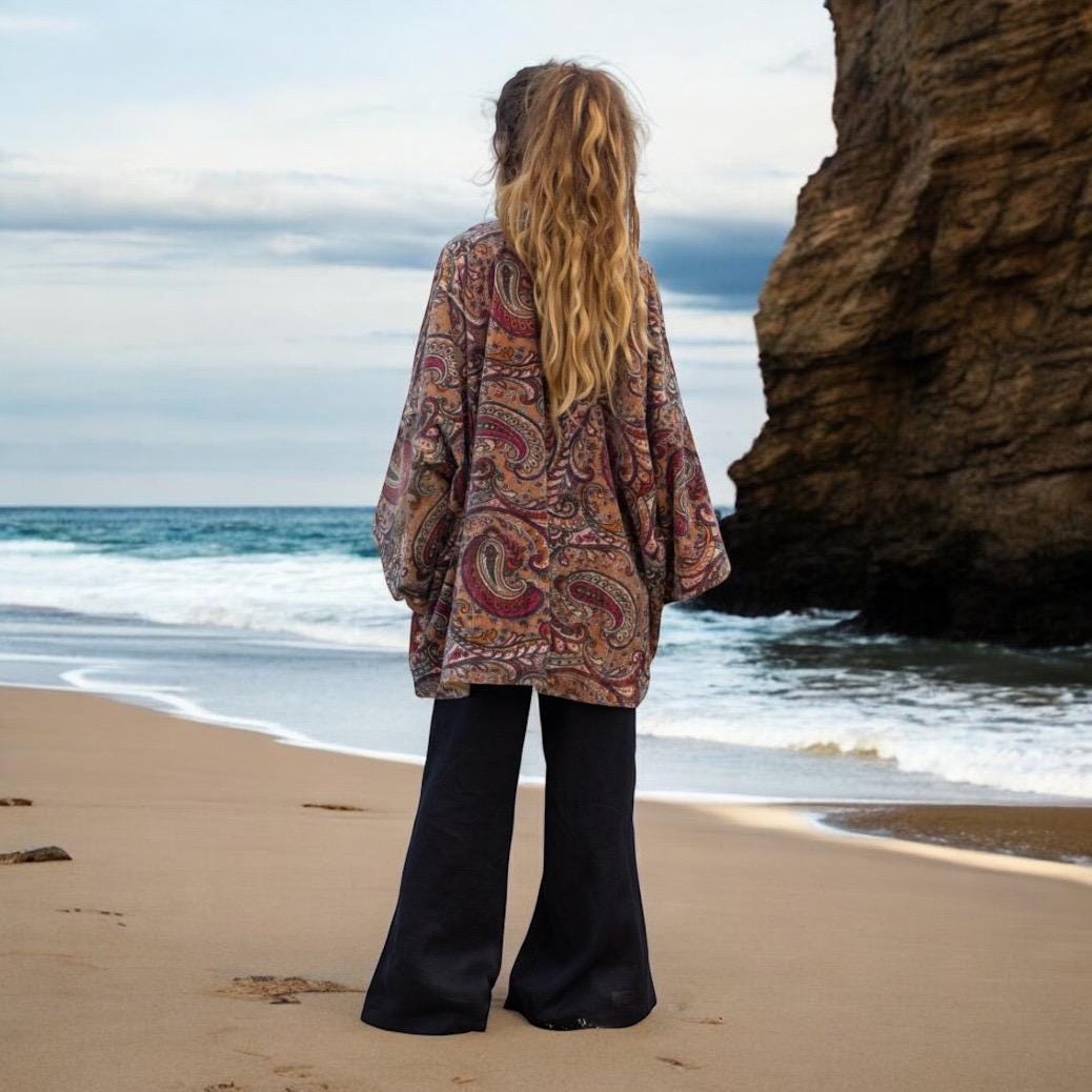 Wrap yourself in warmth, art, and soul with the Mei Kimono Jacket in Firewood Paisley — a handcrafted cotton velvet masterpiece designed to celebrate your curves and your spirit. With its earthy tones of ember, woodsmoke, and plum in a swirling paisley print, this piece brings a touch of vintage magic and everyday elegance to your wardrobe.