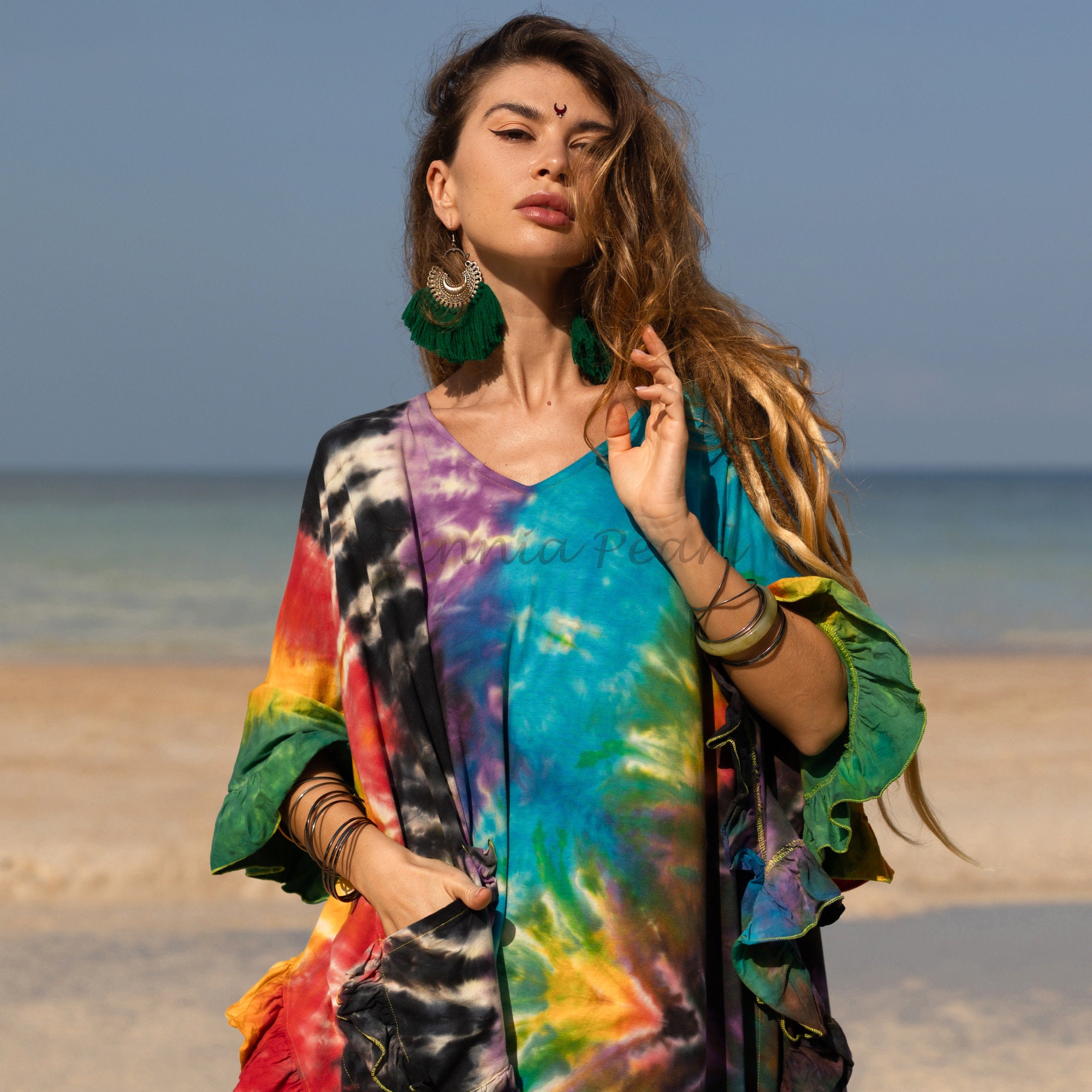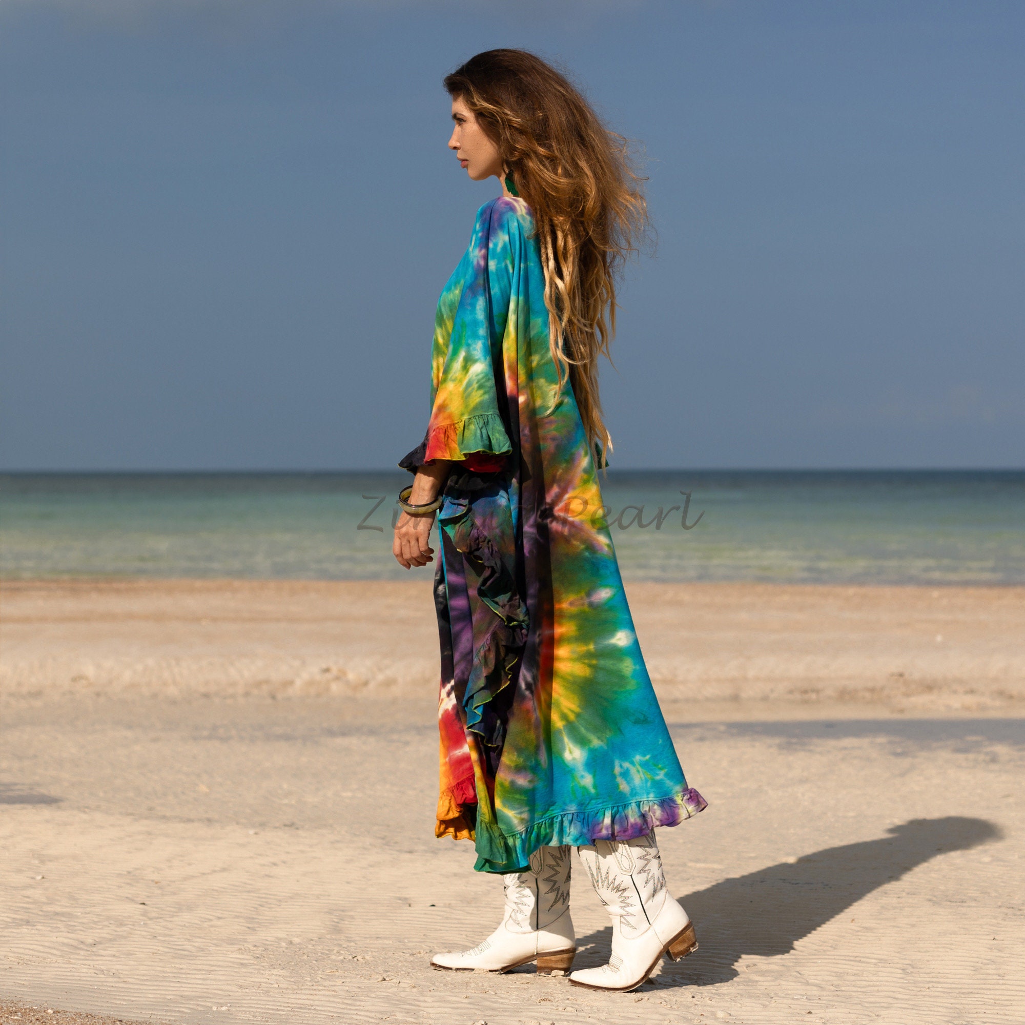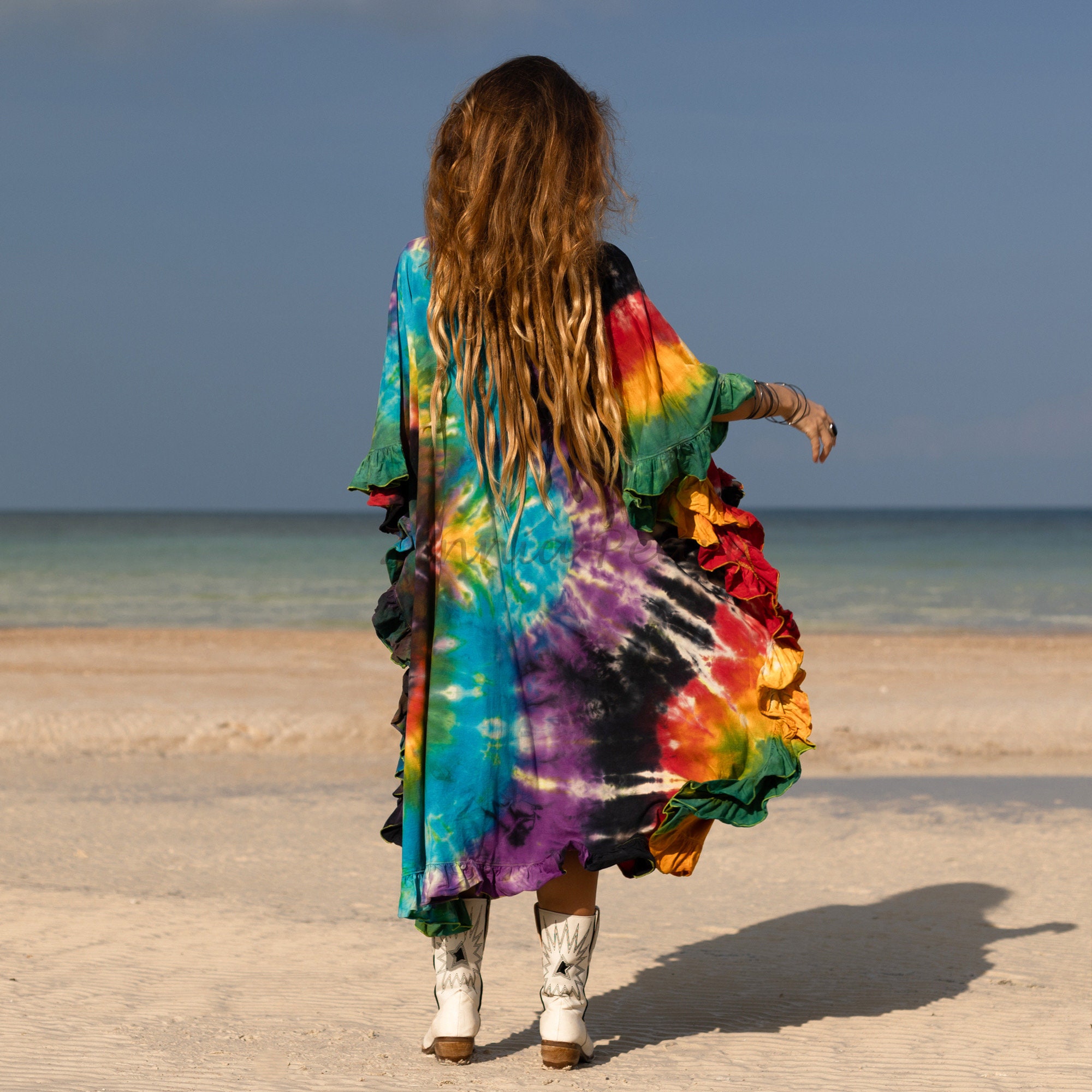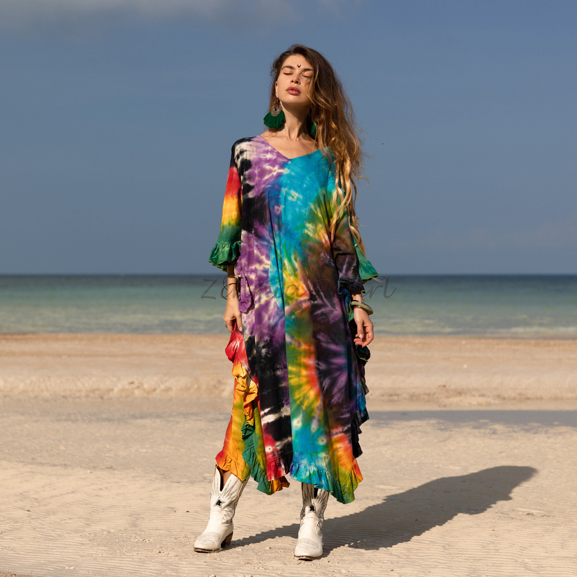 Handcrafted Tie-Dye Tunic Dress: Ruffle Sleeves, Boho Kaftan -Mystic