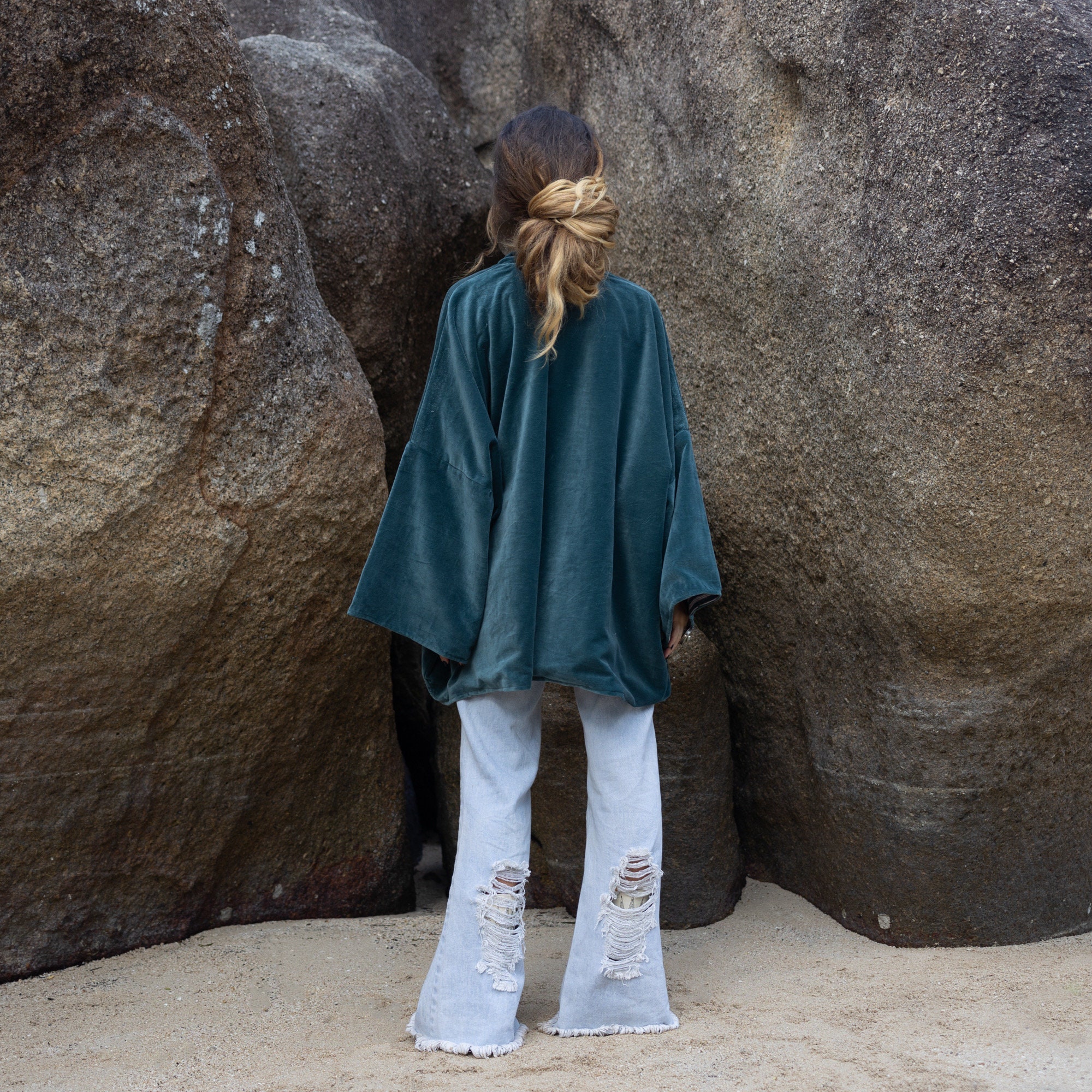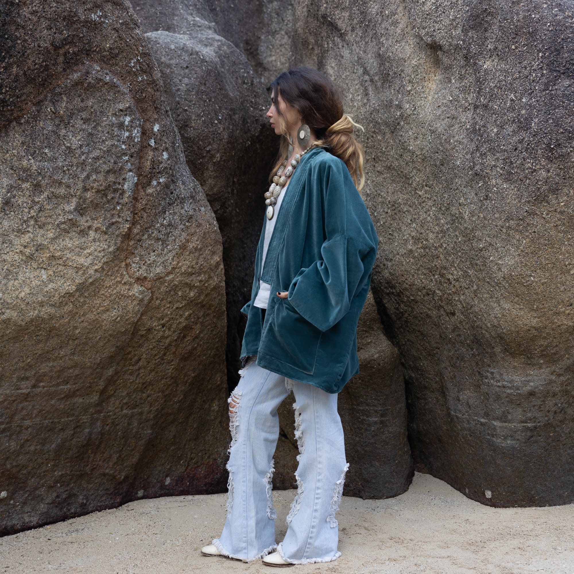 Handcrafted Velvet Kimono Jacket: Boho Chic Cotton Open Front – Mei