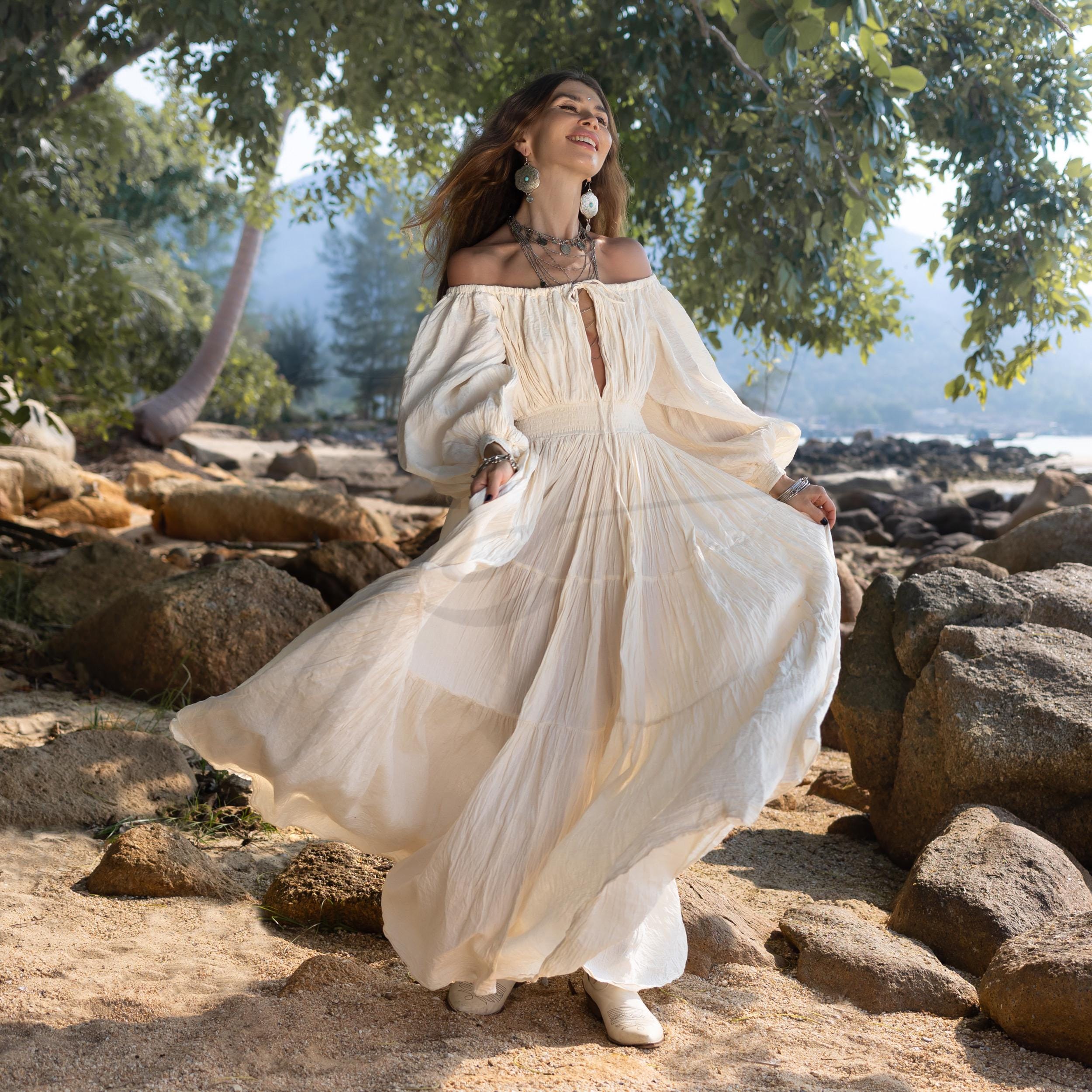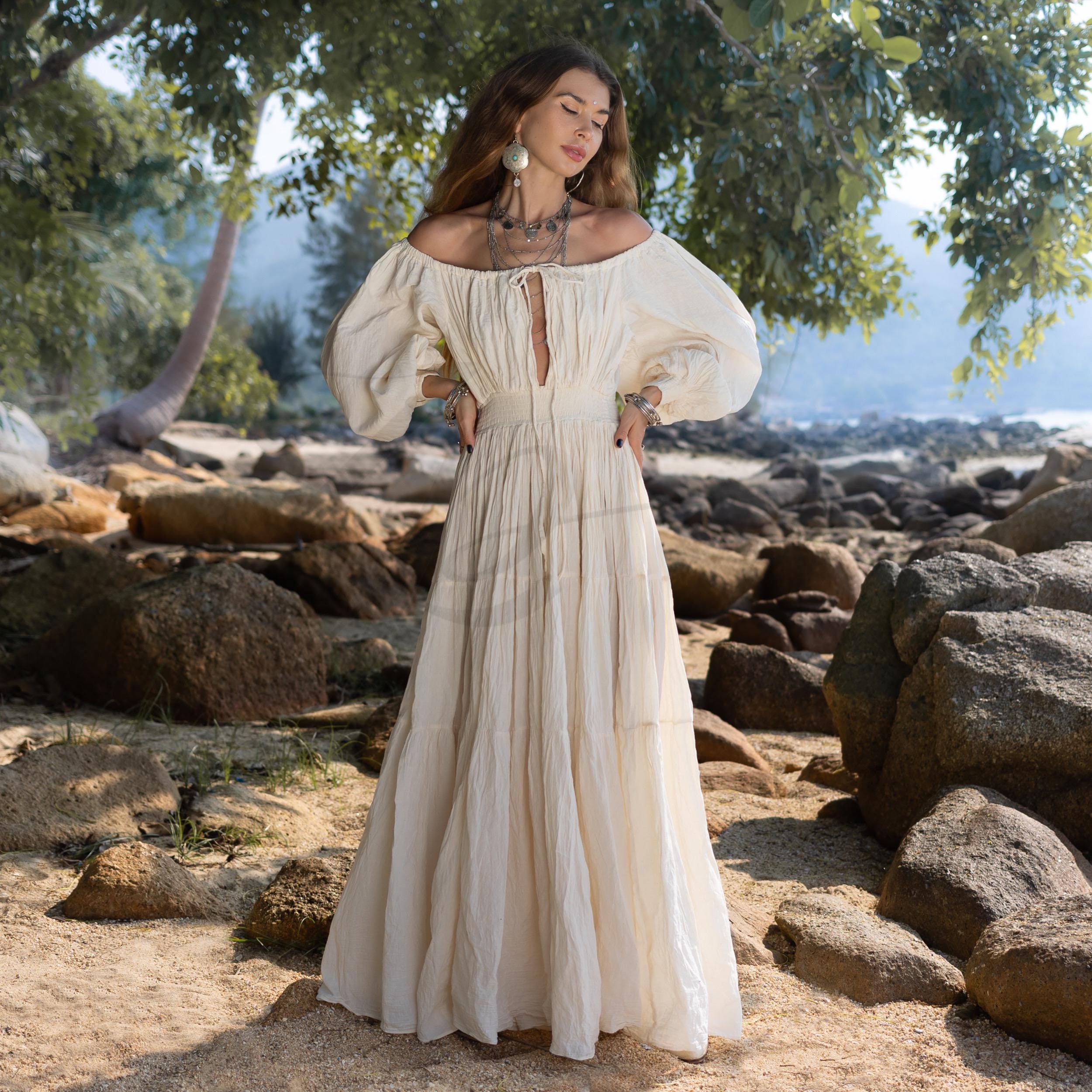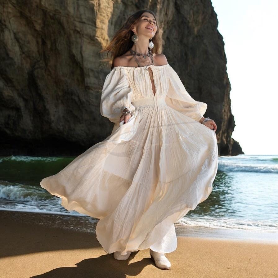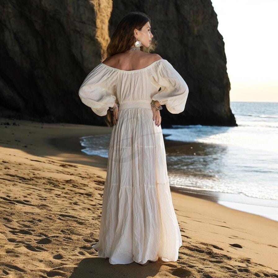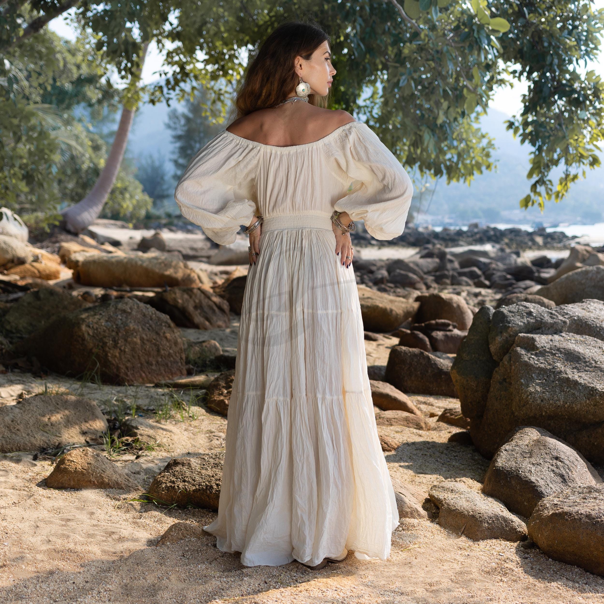 Handmade Boho Cotton Maxi Dress: Off-Shoulder Crinkle Beach Wedding Gown – Mira