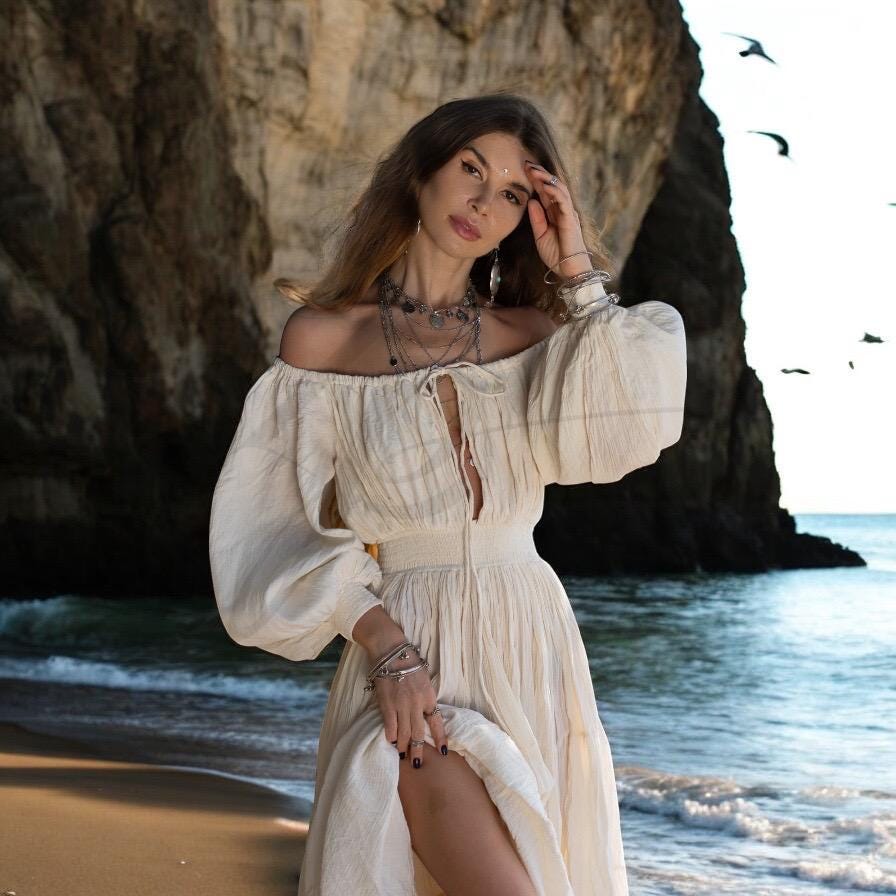 Step into your moment with the Mira Dress in Sand Moon—a handcrafted bridal boho cotton maxi dress designed for barefoot vows, beach weddings, and soulful celebrations. Made from 100% raw crinkle cotton, this off-shoulder gown flows effortlessly with your every move, offering breathable softness and romantic drape.