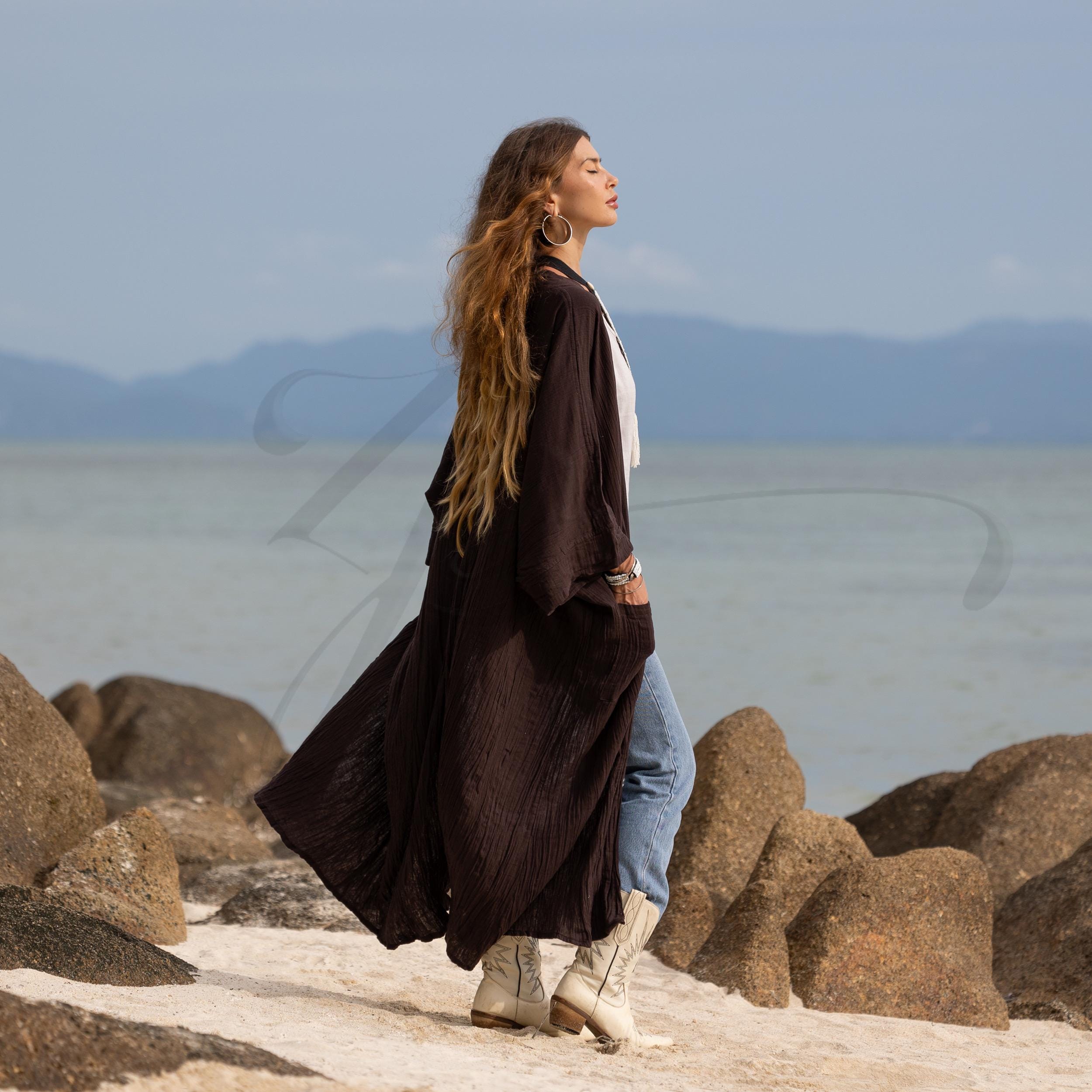 Handmade Cotton Gauze Kimono Robe: Raven Black Boho Duster with Pockets – Willow